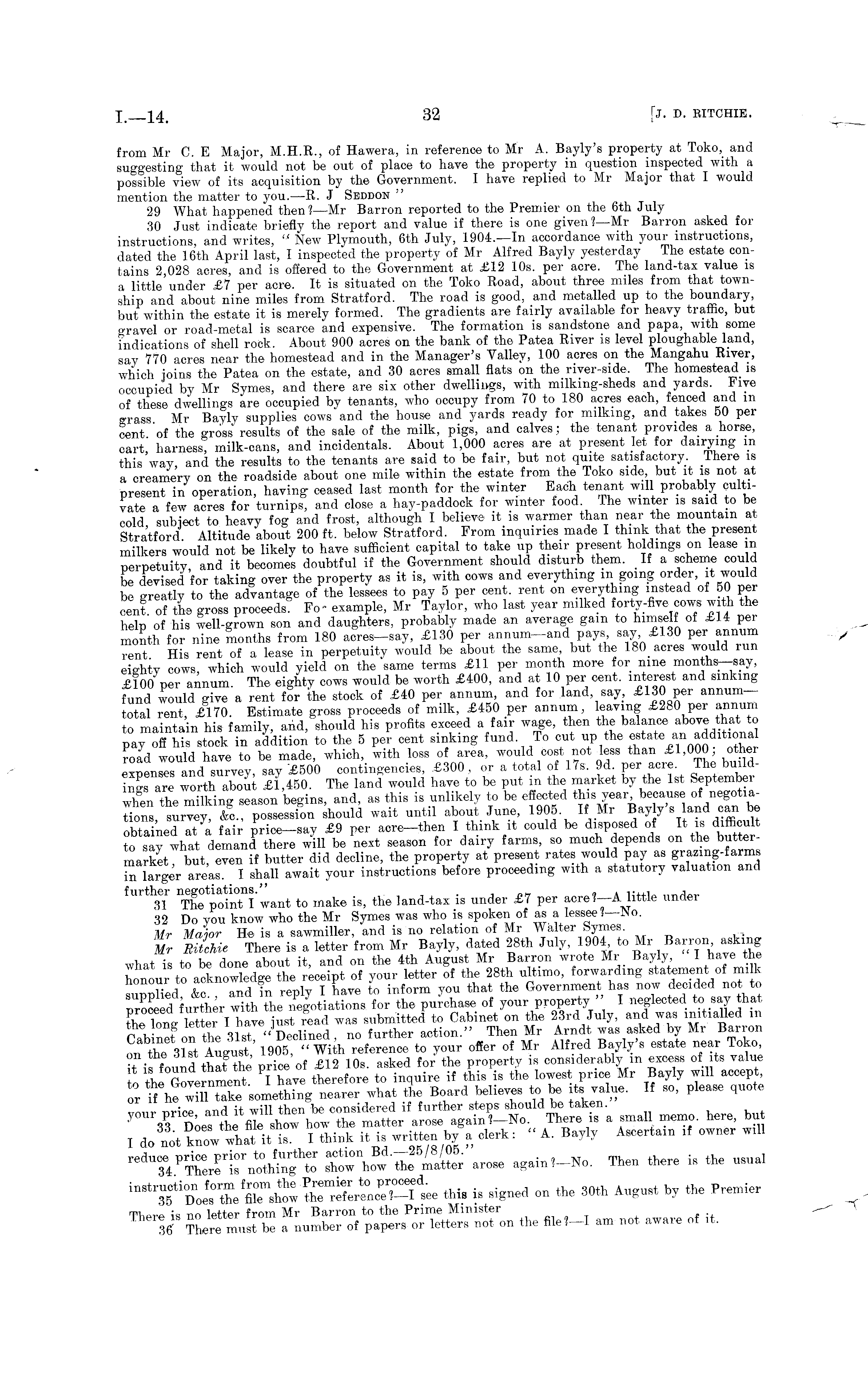 from Mr C. E Major, M.H.R., of Hawera, in reference to Mr A. Bayly's property at Toko, and suggesting that it would not be out of place to have the property in question inspected with a possible view of its acquisition by the Government. I have replied to Mr Major that I would mention the matter to you. —R. J Seddon " 29 What happened then?—Mr Barron reported to the Premier on the 6th July 30 Just indicate briefly the report and value if there is one given ?—Mr Barron asked for instructions, and writes, " New Plymouth, 6th July, 1904.—1n accordance with your instructions, dated the 16th April last, I inspected the property of Mr Alfred Bayly yesterday The estate contains 2,028 acres, and is offered to the Government at £12 10s. per acre. The land-tax value is a little under £7 per acre. It is situated on the Toko Road, about three miles from that township and about nine miles from Stratford. The road is good, and metalled up to the boundary, but within the estate it is merely formed. The gradients are fairly available for heavy traffic, but gravel or road-metal is scarce and expensive. The formation is sandstone and papa, with some indications of shell rock. About 900 acres on the bank of the Patea River is level ploughable land, say 770 acres near the homestead and in the Manager's Valley, 100 acres on the Mangahu River, which joins the Patea on the estate, and 30 acres small flats on the river-side, The homestead is occupied by Mr Symes, and there are six other dwellings, with milkmg-sheds and yards. Five of these dwellings are occupied by tenants, who occupy from 70 to 180 acres each, fenced and in grass Mr Bayly supplies cows and the house and yards ready for milking, and takes 50 per cent of the gross results of the sale of the milk, pigs, and calves; the tenant provides a horse, cart' harness, milk-cans, and incidentals. About 1,000 acres are at present let for dairying in this way and the results to the tenants are said to be fair, but not quite satisfactory. There is a creamery on the roadside about one mile within the estate from the Toko side but it is not at present in operation, having ceased last month for the winter Each tenant will probably cultivate a few acres for turnips, and close a hay-paddock for winter food The winter is said to be cold, subject to heavy fog and frost, although I believe it is warmer than near the mountain at Stratford Altitude about 200 ft. below Stratford. From inquiries made I think that the present milkers would not be likely to have sufficient capital to take up their present holdings on lease in perpetuity and it becomes doubtful if the Government should disturb them. _If a scheme could be devised for taking over the property as it is, with cows and everything in going order, it would be greatly to the advantage of the lessees to pay 5 per cent, rent on everything instead of 50 per cent of the gross proceeds. Fo- example, Mr Taylor, who last year milked forty-five cows with the help of his well-grown son and daughters, probably made an average gam to himself of £14 per month for nine months from 180 acres-say, £130 per annum—and pays say £130 per annum rent His rent of a lease in perpetuity would be about the same, but the 180_ acres would run eighty cows, which would yield on the same terms £11 per month more for nine months—say, £100 per annum The eighty cows would be worth £400, and at 10 per cent, interest and sinking fund would give a rent for the stock of £40 per annum, and for land, say £130 per annumtotal rent, £170. Estimate gross proceeds of milk, £450 per annum, leaving £280 per annum to maintain his family, and, should his profits exceed a fair wage, then the balance above that to pay stock in addition to the 5 per cent sinking fund. To cut up the est ate an additional road would have to be made, which, with loss of area, would cost not less than £1,000, other expend and survey, say £500 contingencies, £300., or a total of 17s. 9d. per acre The buildings are worth about £1,450. The land would have to be put in the market by the Ist September X the mTlking season begins, and, as this is unlikely to be effected ths year because of negotiations survey, &c, possession should wait until about June, 1905 If Mr Bay y's land can be obtained a/a fair price-say £9 per acre-then I think it could be disposed of It is.difficult to say what demand there will be next season for dairy farms, so much depends on the butter market, but, even if butter did decline, the property at present rates would pay as grazing-farms in larger areas. I shall await your instructions before proceeding with a statutory valuation and further ._ under 32 Do you know who the Mr Symes was who is spoken of as a lessee I— JNo. Mr Major He is a sawmiller, and is no relation of Mr Walter Symes. Mr Rtichie There is a letter from Mr Bayly, dated 28th July, 1904 to Mr Barron asking what is to be done about it, and on the 4th August Mr Barron wrote Mr Bayly I have the honour to acknowledge the receipt of your letter of the 28th ultimo, forwarding statement of mi Ik supplied &c, and in reply I have to inform you that the Government has now decided not to proceed further with the negotiations for the purchase of your property " I neglected to say that meTonVletter I have just read was submitted to Cabinet on the 23rd July, and was initialled in rl nPt onthe 31st "Declined, no further action." Then Mr Arndt was asked by Mr Barron on the 3lTt August' 1905 "With reference to your offer of Mr Alfred Bayly's estate near Toko, ?t is found thaf the price of £12 10s. asked for the property is considerably in excess of its value o the Government \ have therefore to inquire if this is the lowest price Mr Bayly will accept or She willTke something nearer what the Board believes to be its value. If so, please quote • a v ,„;n tUnU considered if further steps should be taken. the file SllX™ again?-No. There is a small memo, here, but Ido not D krwtmat le 