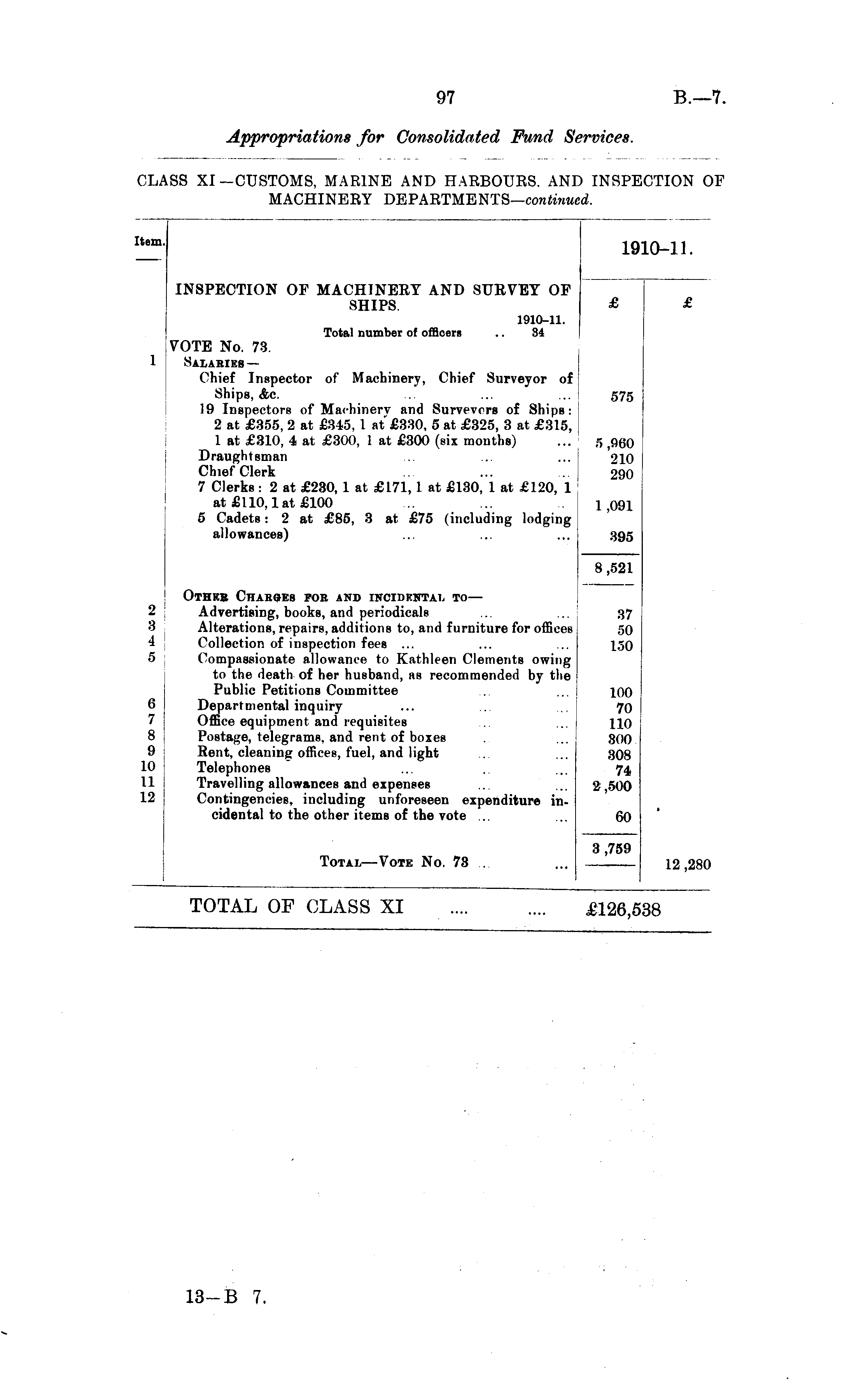 :tem.| 1910-11. INSPECTION OF MACHINERY AND SURVEY OF SHIPS. 1910-11. Total number of officers .. 34 VOTE No. 73. Salaries — Chief Inspector of Machinery, Chief Surveyor of Ships, Ac. 19 Inspectors of Machinery and Surveyors of Ships: 2 at £355, 2 at £345, 1 at £330, 5 at £325, 3 at £315, 1 at £310, 4 at £300, 1 at £300 (six months) Draughtsman Chief Clerk 7 Clerks : 2 at £230, 1 at £171, 1 at £130, 1 at £120, 1 at £110,1 at £100 5 Cadets: 2 at £85, 3 at £75 (including lodging allowances) 575 5 ,960 210 290 1,091 395 Othkb Charges for and incidental to — Advertising, books, and periodicals Alterations, repairs, additions to, and furniture for offiees Collection of inspection fees ... Compassionate allowance to Kathleen Clements owing to the death of her husband, as recommended by the Public Petitions Committee Departmental inquiry Office equipment and requisites Postage, telegrams, and rent of boxes Rent, cleaning offices, fuel, and light Telephones Travelling allowances and expenses Contingencies, including unforeseen expenditure incidental to the other items of the vote ... 8,521 2 8 4 5 37 50 150 6 7 8 9 10 11 12 100 70 110 300 308 74 2 ,500 60 ■ Total —Vote No. 73 ... 3,759 12 ,280 TOTAL OF CLASS XI £126 i38