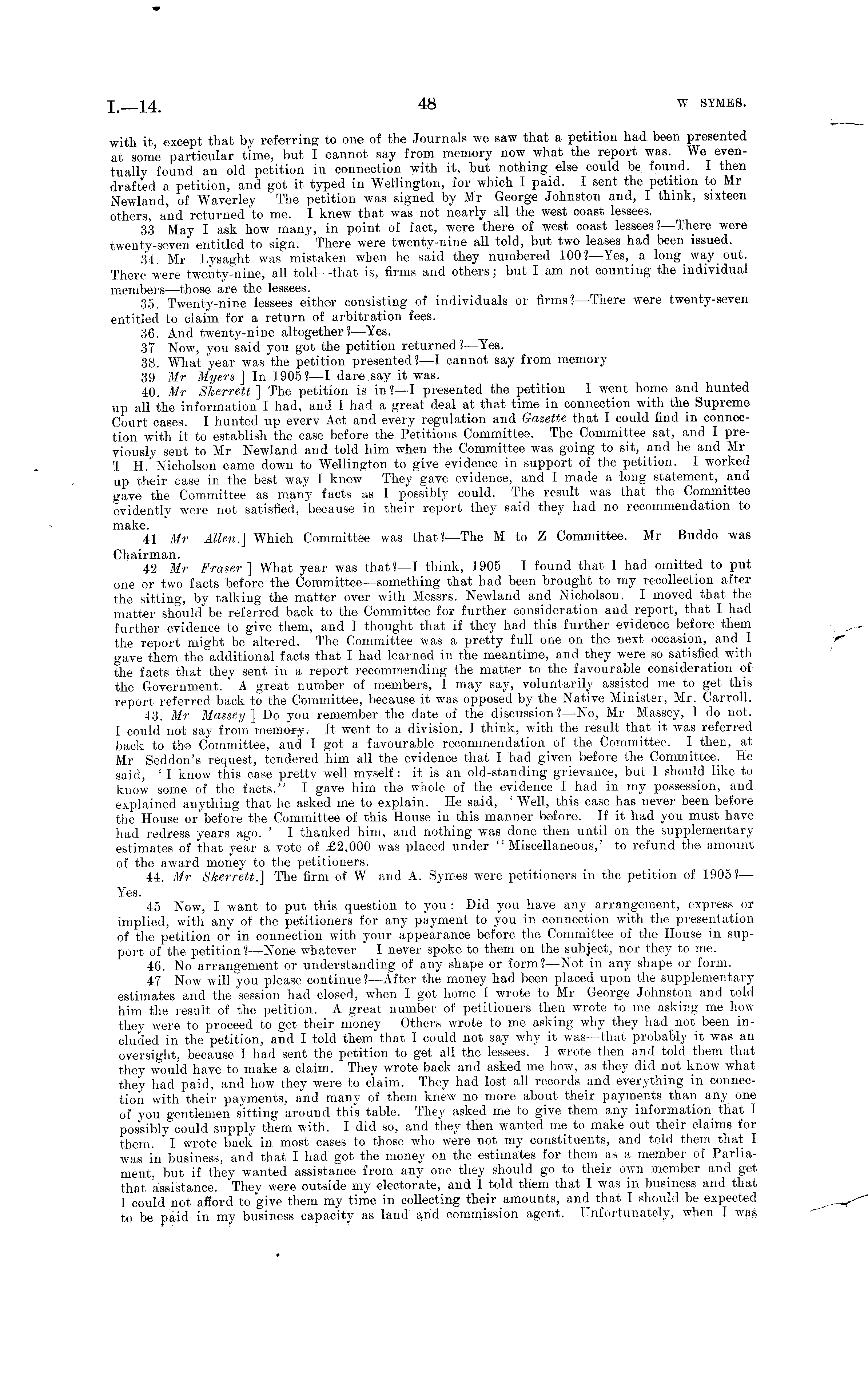 with it, except that by referring to one of the Journals we saw that a petition had been presented at some particular time, but I cannot say from memory now what the report was. We eventually found an old petition in connection with it, but nothing else could be found. I then drafted a petition, and got it typed in Wellington, for which I paid. I sent the petition to Mr Newland, of Waverley The petition was signed by Mr George Johnston and, I think, sixteen others, and returned to me. I knew that was not nearly all the west coast lessees. 33 May I ask how many, in point of fact, were there of west coast lessees? —There were twenty-seven entitled to sign. There were twenty-nine all told, but two leases had been issued. 34. Mr Lysaght was mistaken when he said they numbered 100?— Yes, a long way out. There were twenty-nine, all told—that is, firms and others; but lam not counting the individual members —those are the lessees. 35. Twenty-nine lessees either consisting of individuals or firms ?—There were twenty-seven entitled to claim for a return of arbitration fees. 36. And twenty-nine altogether? —Yes. 37 Now, you said you got the petition returned ?—Yes. 38. What year was the petition presented?—l cannot say from memory 39 Mr Myers ]In 1905?— I dare say it was. 40. Mr Skerrett] The petition is in?—l presented the petition I went home and hunted up all the information I had, and I had a great deal at that time in connection with the Supreme Court cases. I hunted up every Act and every regulation and Gazette that I could find in connection with it to establish the case before the Petitions Committee. The Committee sat, and I previously sent to Mr Newland and told him when the Committee was going to sit, and he and Mr 1 11."Nicholson came clown to Wellington to give evidence in support of the petition. I worked up their case in the best way I knew They gave evidence, and I made a long statement, and gave the Committee as many facts as 1 possibly could. The result was that the Committee evidently were not satisfied, 'because in their report they said they had no recommendation to make. 41 Mr Allen.] Which Committee was that?—The M to Z Committee. Mr Buddo was Chairman. 42 Mr Fraser] What year was that?—l think, 1905 I found that I had omitted to put one or two facts before the Committee —something that had been brought to my recollection after the sitting, by talking the matter over with Messrs. Newland and Nicholson. I moved that the matter should be referred back to the Committee for further consideration and report, that I had further evidence to give them, and I thought that if they had this further evidence before them the report might be altered. The Committee was a pretty full one on the next occasion, and 1 gave them the additional facts that I had learned in the meantime, and they were so satisfied with the facts that they sent in a report recommending the matter to the favourable consideration of the Government. A great number of members, I may say, voluntarily assisted me to get this report referred back to the Committee, because it was opposed by the Native Minister, Mr. Carroll. 43. Mr Massey] Do you remember the date of the discussion ?—No, Mr Massey, I do not. 1 could not say from memory. It went to a division, I think, with the result that it was referred back to the Committee, and I got a favourable recommendation of the Committee. I then, at Mr Seddon's request, tendered him all the evidence that I had given before the Committee. He said, ' I know this case pretty well myself : it is an old-standing grievance, but I should like to know some of the facts." I gave him the whole of the evidence 1 had in my possession, and explained anything that he asked me to explain. He said, ' Well, this case has never been before the House or before the Committee of this House in this manner before. If it had you must have had redress years ago. ' I thanked him, and nothing was done then until on the supplementary estimates of that year a vote of £2,000 was placed under " Miscellaneous,' to refund the amount of the award money to the petitioners. 44. Mr Skerrett.] The firm of W and A. Symes were petitioners in the petition of 1905?— Yes. 45 Now, I want to put this question to you: Did you have any arrangement, express.or implied, with any of the petitioners for any payment to you in connection with the presentation of the petition or in connection with your appearance before the Committee of the House in support of the petition? —None whatever I never spoke to them on the subject, nor they to me. 46. No arrangement or understanding of any shape or form?— Not in any shape or form. 47 Now will you please continue? —After the money had been placed upon the supplementary estimates and the session had closed, when I got home 1 wrote to Mr George Johnston and told him the result of the petition. A great number of petitioners then wrote to me asking me how they were to proceed to get their money Others wrote to me asking why they had not been included in the petition, and I told them that I could not say why it was—that probably it was an oversight, because I had sent the petition to get all the lessees. I wrote then and told them that they would have to make a claim. They wrote back and asked me how-, as they did not know what they had paid, and how they were to claim. They had lost all records and everything in connection with their payments, and many of them knew no more about their payments than any one of you gentlemen sitting around this table. They asked me to give them any information, that I possibly could supply them with. I did so, and they then wanted me to make out their claims for them. I wrote back in most cases to those who were not my constituents, and told them that I was in business, and that I had got the money on the estimates for them as a member of Parliament, but if they wanted assistance from any one they should go to their own memb