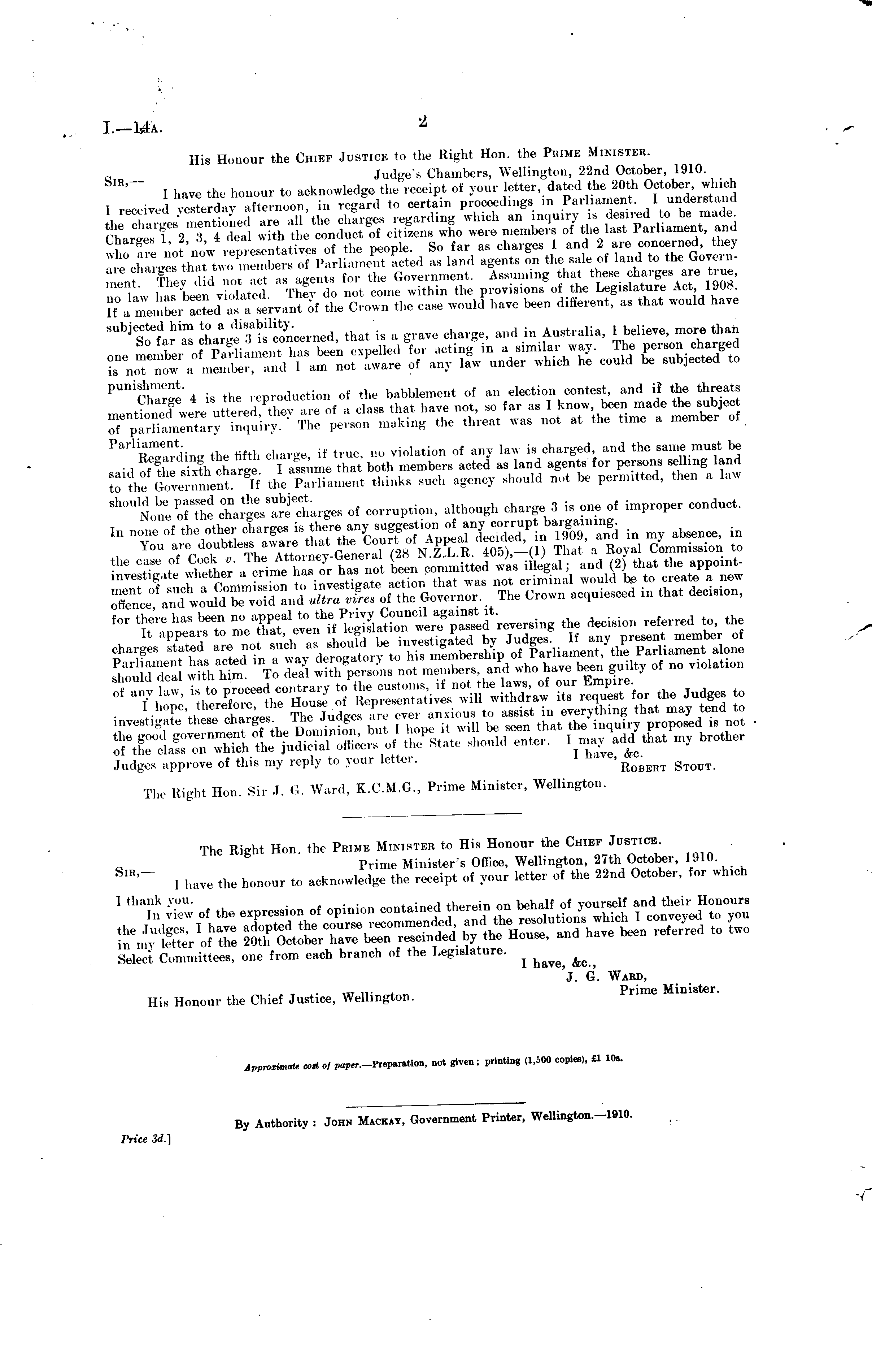 The Right Hon. the Prime Minister to His Honour the Chief Justice Prime Minister's Office, Wellington, 27th October, 1910. felß ~ I have the honoux to acknowledge the receipt of your letter of the 22nd October, tor winch 1 thank you. _ . . . . a on behalf of yourself and their Honours In view of the expression of opinion contained therein on toenailo j CO nveyed to you Select Committees, one from each branch of the Legislature. 'j. G. Ward, „, T ~. Prime Minister. His Honour the Chief Justice, Wellington. ApprorimaU cost o, not given ; printing (1,500 copies), £1 10s.