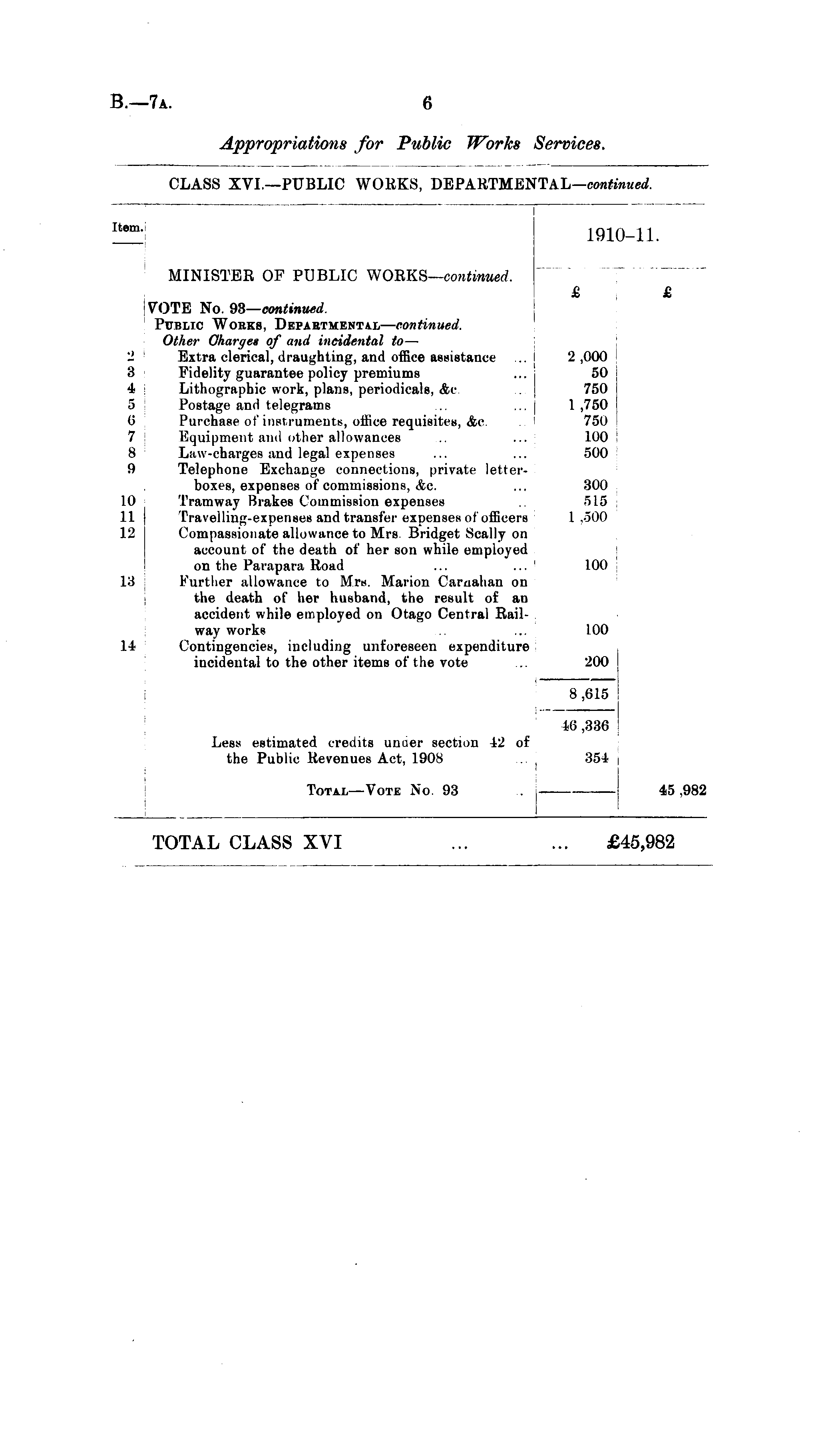 tem. tem ' 1910-11. MINISTER OF PUBLIC WORKS— continued. £ VOTE No. 93— continued. Public Works, Departmental— continued. Other Charges of and incidental to — 2 Extra clerical, draughting, and office assistance ... i 2,000 3 Fidelity guarantee policy premiums ... i 50 4 Lithographic work, plans, periodicals, &c ... | 750 5 Postage and telegrams ... ... | 1 ,750 6 Purchase of instruments, office requisites, &c. 750 7 Equipment and other allowances ... 100 8 Law-charges and legal expenses ... ... 500 9 Telephone Exchange connections, private letterboxes, expenses of commissions, <fec. ... 300 10 Tramway Brakes Commission expenses 515 11 I Travelling-expenses and transfer expenses of officers 1,500 12 | Compassionate allowance to Mrs. Bridget Scally on account of the death of her son while employed on the Parapara Road ... ... 100 13 Further allowance to Mrs. Marion Carnahan on the death of her husband, the result of an accident while employed on Otago Central Railway works ... 100 14 Contingencies, including unforeseen expenditure incidental to the other items of the vote .. 200 £ 8,615 16 ,336 Less estimated credits unaer section 42 of the Public Revenues Act, 1908 354 Total—Vote No. 93 . < 45 .982 TOTAL CLASS XVI ;45,982