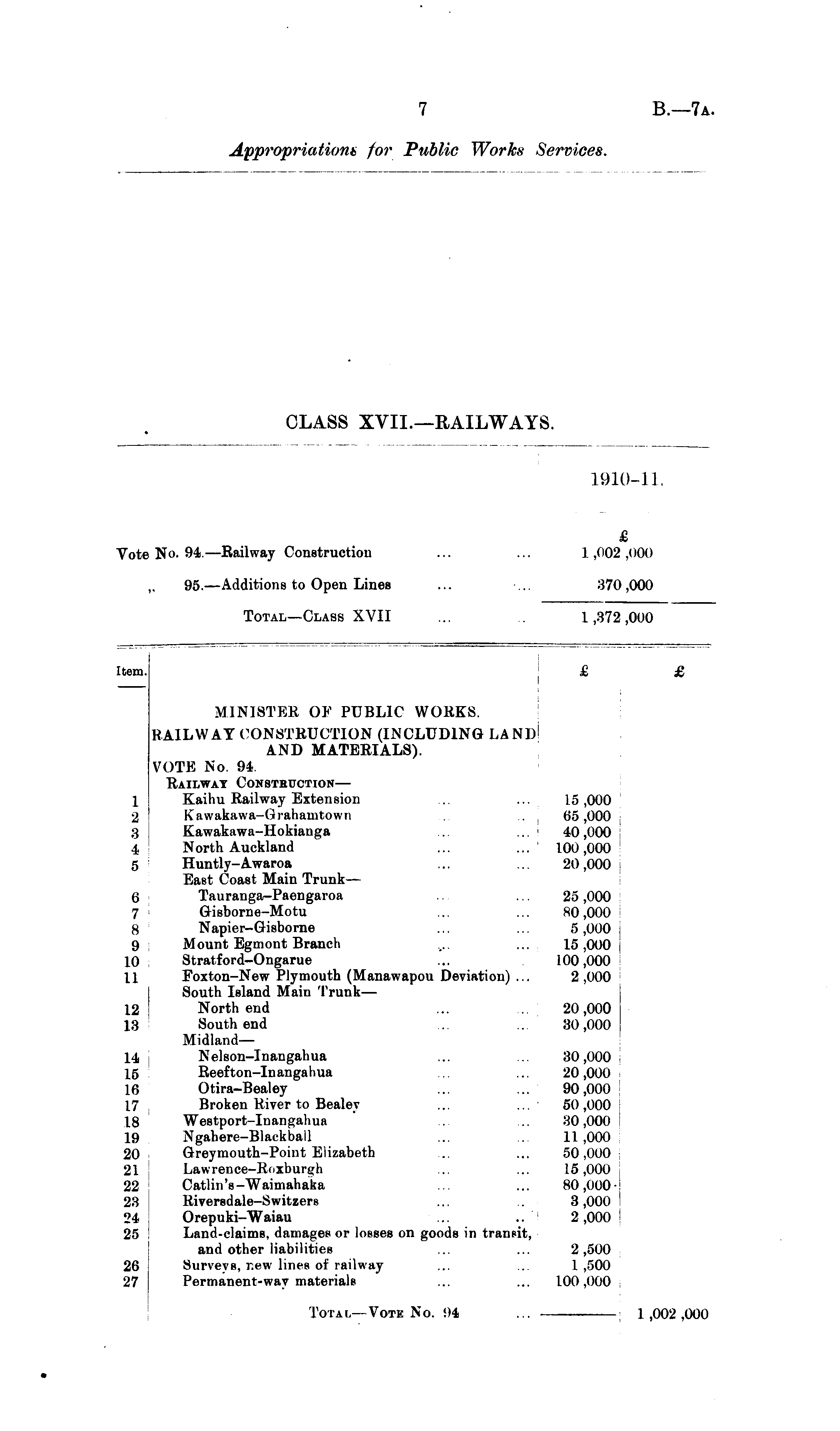 1910-11, ote No. 94. —Railway Construction £ 1,002 ,000 „ 95. —Additions to Open Lines 370 ,000 Total—Class XVII 1,372 ,000 1,372 ,000 ;tem. tern. £ MINISTER OF PUBLIC WORKS. £ RAILWAY CONSTRUCTION (INCLUDING LAND AND MATERIALS). 1 2 3 4 5 6 7 8 9 10 11 12 13 14 15 16 17 18 19 20 21 22 23 24 25 26 27 VOTE No. 94. Railway Construction — Kaihu Railway Extension ... ... 15,000 Kawakawa-Grahamtown ... 65,000 Kawakawa-Hokianga ... ... 40,000 North Auckland ... ... 100,000 Huntly-Awaroa ... ... 20,000 East Coast Main Trunk — Tauranga-Paengaroa ... ... 25,000 Gisborne-Motu ... ... 80,000 Napier-Gisborne ... ... 5,000 Mount Egmont Branch .... ... 15,000 Stratford-Ongarue ... 100,000 Foxton-New Plymouth (Manawapou Deviation) ... 2 ,000 South Island Main 'Trunk — North end ... 20,000 Southend ... ... 30,000 Midland — Nelson-Inangahua ... ... 30,000 Reefton-Inangahua ... ... 20,000 Otira-Bealey ... ... 90,000 Broken River to Bealey ... 50,000 Westport-Inangahua ... ... 30,000 Ngahere-Blackball ... ... 11,000 Greymouth-Point Elizabeth ... ... 50,000 , Lawrence-Roxburgh ... ... 15,000 Catlin's-Waimahaka ... ... 80,000- 1 Riversdale-Switzers ... 3,000 I Orepuki-Waiau ... .. 2,000 ! Land-claims, damages or losses on goods in transit, and other liabilities ... ... 2,500 Surveys, r.ew lines of railway ... ... 1 ,500 Permanent-way materials ... ... 100,000 Total —Vote No. 94 ... 1 ,002 ,000