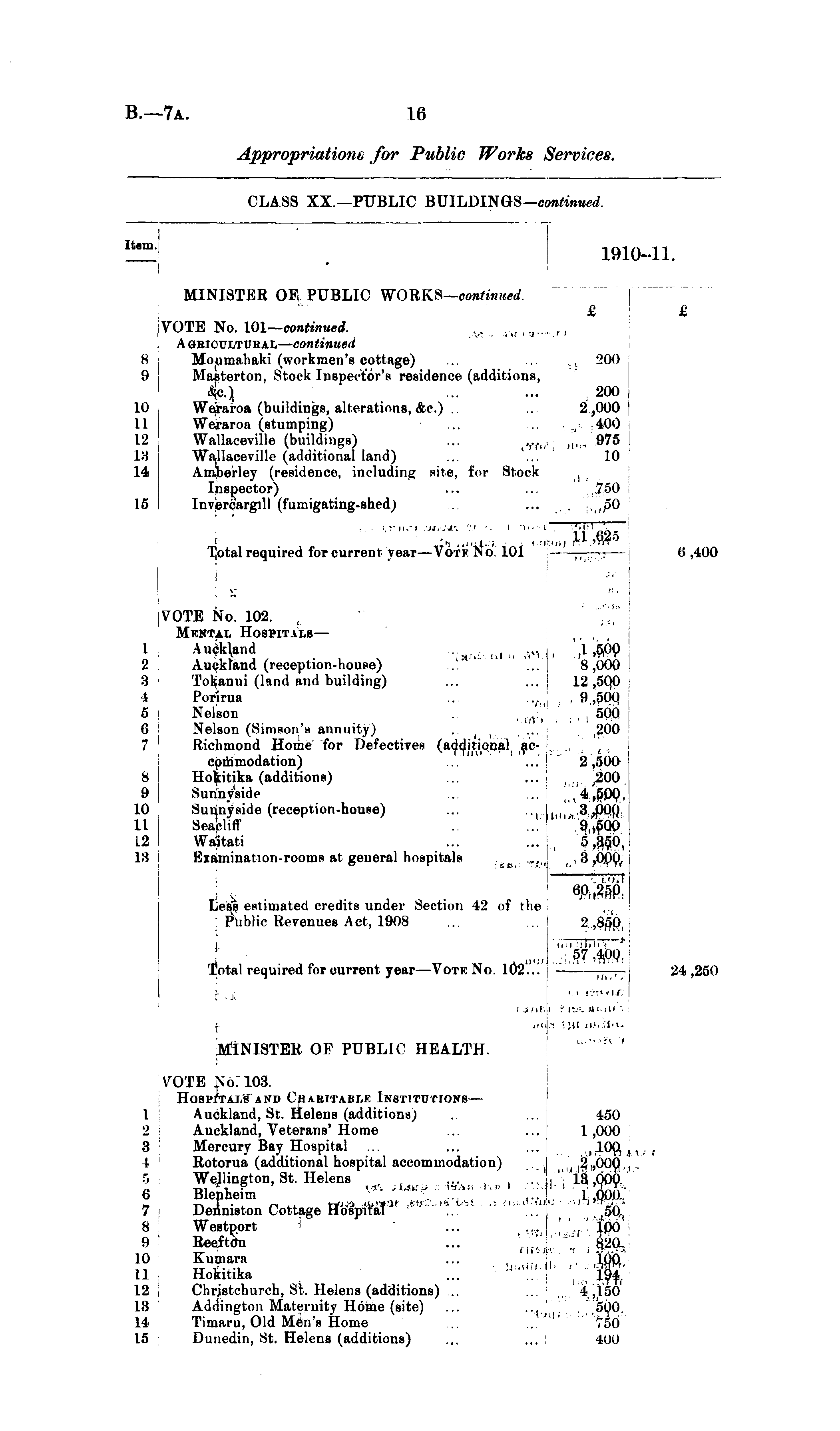item. . 1910-11. MINISTER OF, PUBLIC WORKS— continued. £ £ 8 9 10 ll 12 13 14 VOTE No. 101— continued. A gricultural— continued 8 Moumahaki (workmen's cottage) ... ... 200 9 Masterton, Stock Inspector's residence (additions, &c.) ... ... 200 10 Weraroa (buildings, alterations, Ac.) .. ... 2,000 ' 11 Weraroa (stumping) ... .. 400 12 Wallaceville (buildings) ... ... 975 13 Wajlaceville (additional land) ... 10 14 Amiberley (residence, including site, for Stock , ( Inspector) ... ... 750 15 Invercargill (fumigating-shed) ... ... 50 15 coTotal required for current year —Vote No. 101 — 6 ,400 I 1 2 3 4 5 8 7 8 9 10 11 L2 13 VOTE No. 102. Mental Hospitals— 1 AudkUxnd 1,5,00 | 2 Auckland (reception-house) ... 8,000 3 Tokanui (land and building) ... ... 12,5Q0 4 Porirua ... ... 9,500, 5 i Nelson .. 500 0 Nelson (Simson's annuity) .. 200 7 I Richmond Home for Defectives (additional, accommodation) . ... 2,500 8 Hokitika (additions) ... ... 200 9 Sunny side ... ... 4,500 10 Sunnyside (reception-house) ... 3.000 11 Seapliff ... ... 9,500 12 Waitati ... ... 5,350 13 Examination-rooms at general hospitals 3,000 '. (.Oil 60 ,250 Les v s estimated credits under Section 42 of the i Public Revenues Act, 1908 ... ... 2,850 I Y.I! .'llllil * 57 .400 Total required for current year —Vote No. l02..i -— 24,250 i _,>>! I } IM O MINISTER OF PUBLIC HEALTH. VOTE No; 103. Hospitals and Charitable Institutions— 1 Auckland, St. Helens (additions; .. ... 450 2 Auckland, Veterans' Home ... ... 1 ,000 3 Mercury Bay Hospital ... ... ... ,100,,,,, 4 Rotorua (additional hospital accommodation) 2 ,000 Wellington, St. Helens ... 13,000 6 Blenheim ... 1 ,000 7 Denniston Cottage Hospital .. ... o0 8 , Westport go 9 Reefton ... 820 10 Kumara ... 100 11 Hokitika ... 194 12 ! Chrjstchurch, Sf. Helens (additions) ... I.lfjo 13 Addington Maternity Home (site) ... ... 500 14 Timaru, Old Men's Home ... ...' 7")0 15 Dunedin, St. Helens (additions) ... ... 400