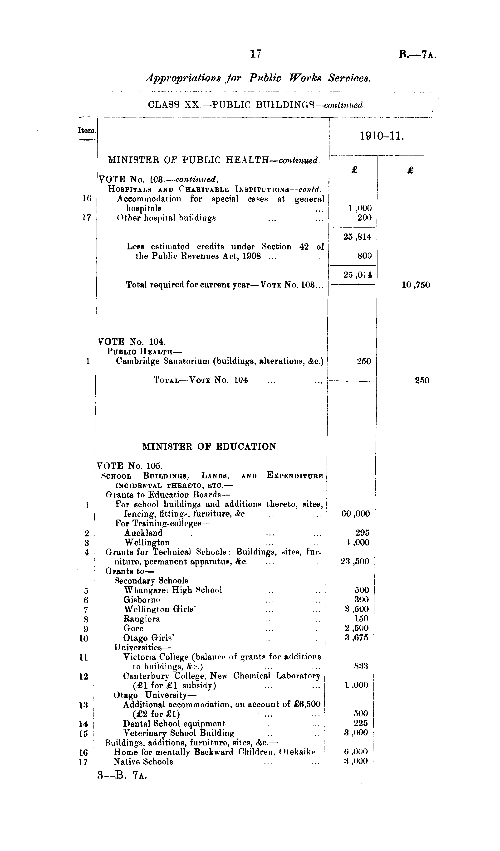 Item. 1910-11. MINISTER OF PUBLIC HEALTH— continued. it; 17 VOTE No. 108.— continued. j Hospitals and Charitable Institutions - coutii. Accommodation for special cases at general hospitals Other hospital buildings £ 1 ,000 200 £ 16 1 ,000 200 17 Less estimated credits under Section 42 of the Public Revenues Act, 1908 ... Total required for current year—Vote No. 108... - 25 .814 800 25 ,014 25 ,814 sou 25 ,01 i 10 ,750 l VOTE No. 104. Public Health— Cambridge Sanatorium (buildings, alterations, Ac.) 250 250 250 'Total—Vote No. 104 ... ... - MINISTER OF EDUCATION. VOTE No. 105. School Buildings, Lands, and Expenditure l 2 3 4 5 6 7 8 9 10 11 12 13 14 15 16 17 2 8 4 incidental thereto, etc. — Grants to Education Boards — For school buildings and additions thereto, sites, fencing, fittings, furniture, &c. For Training-colleges— Auckland Wellington Grants for Technical Schools: Buildings, sites, furniture, permanent apparatus, Ac. Grants to — Secondary Schools — Whangarei High School Gisborne Wellington Girls' Rangiora Gore Otago Girls' Universities — Victoria College (balance of grants for additions to buildings, Ac.) Canterbury College, New Chemical Laboratory (£lfor £1 subsidy) Otago University— Additional accommodation, on account of £6.500 I (£2for£l) Dental School equipment ... ... j Veterinary School Building Buildings, additions, furniture, sites, Ac.— Home for mentally Backward Children, Otekaike Native Schools 60,000 295 1,000 23 ,500 500 300 3,500 150 2 ,500 3 ,675 833 1,000 500 225 8 .000 6 ,000 3 ,000