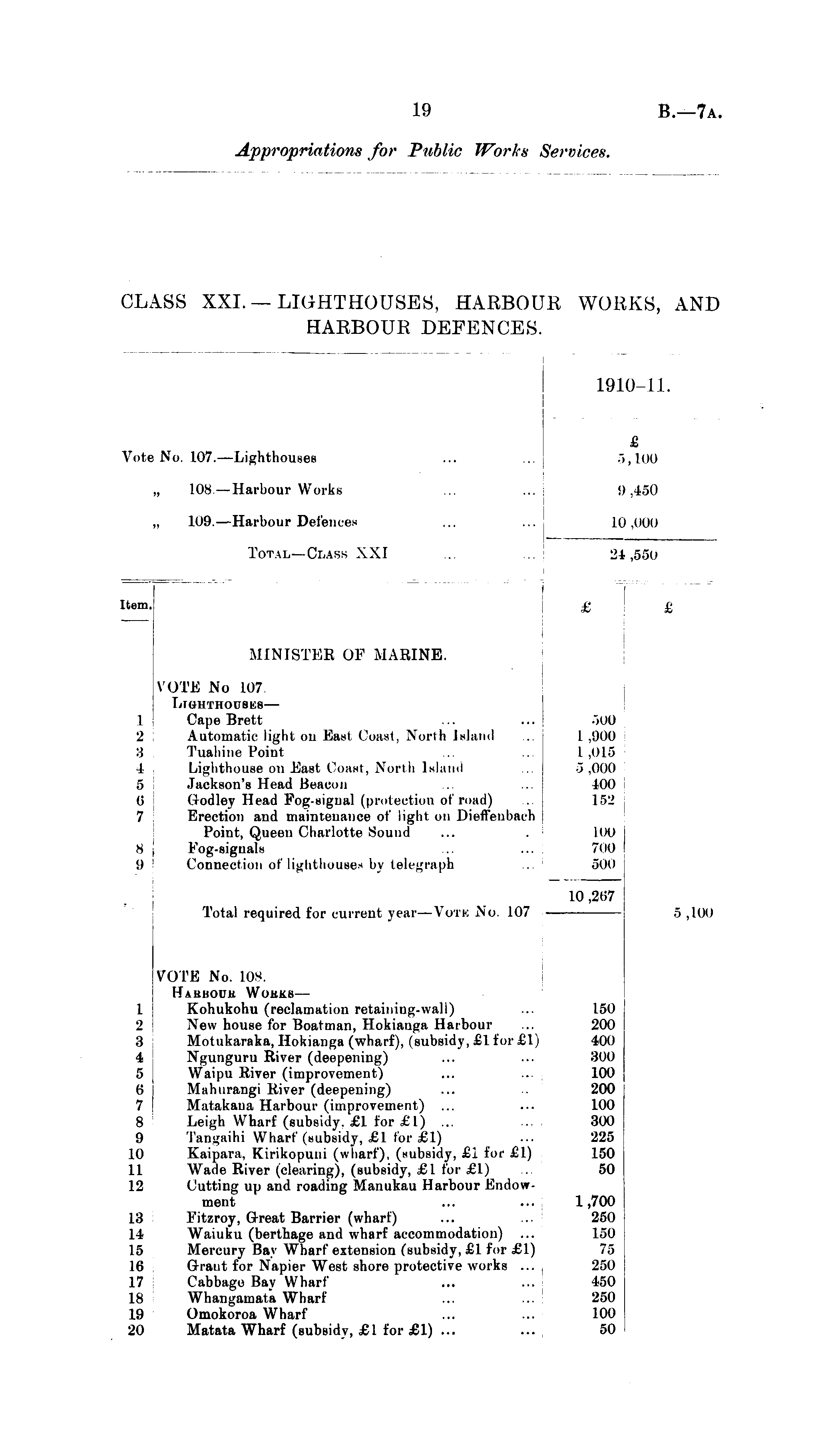 1910-11. £ 5,100 Vote No. 107.—Lighthouses 5 108— Harbour Works 9 9 ,450 „ 109.—Harbour Defences 10 io ,000 Total—Class XXI 21 21,550 Item. £ £ £ MINISTER OF MARINE. VOTE No 107 Lighthouses— 1 Cape Brett 2 ; Automatic light ou East Coast, North Island 3 Tuahine Point I Lighthouse ou East Coast, North Island 5 Jackson's Head Beacon 0 Godley Head Fog-signal (protection of road) 7 Erection aud maintenance of light on Dieffenbach Point, Queen Charlotte Sound 8 , Fog-signals ... ... 9 Connection of lighthouses by telegraph I 2 3 1 5 (i 7 500 1 ,900 1,015 5,000 400 152 100 700 500 8 9 10 ,267 Total required for current year —Vote No. 107 5 ,10( VOTE No. 10S. Harbour Works — 1 | Kohukohu (reclamation retainiug-wall) 2 New house for Boatman, Hokiauga Harbour 3 Motukaraka, Hokianga (wharf), (subsidy, £1 for £1) 4 Ngunguru River (deepening) 5 ; Waipu River (improvement) 6 I Mahurangi River (deepening) 7 Matakana Harbour (improvement) ... 8 Leigh Wharf (subsidy. £1 for £ I) ... 9 Tangaihi Wharf (subsidy, £1 for £1) 10 Kaipara, Kirikopuni (wharf), (subsidy, £1 for £1) 11 Wade River (clearing), (subsidy, £1 for £1) 12 Cutting up and roading Manukau Harbour Endowment 13 Fitzroy, Great Barrier (wharf) ... ... 14 Waiuku (berthage and wharf accommodation) 15 Mercury Bay Wharf extension (subsidy, £1 for £1) 16 Grant for Napier West shore protective works ... 17 Cabbage Bay Wharf 18 Whangamata Wharf 19 Omokoroa Wharf 20 Matata Wharf (subsidy, £1 for £1) ... 150 200 400 300 100 200 100 300 225 150 50 1,700 250 150 75 250 450 250 100 50