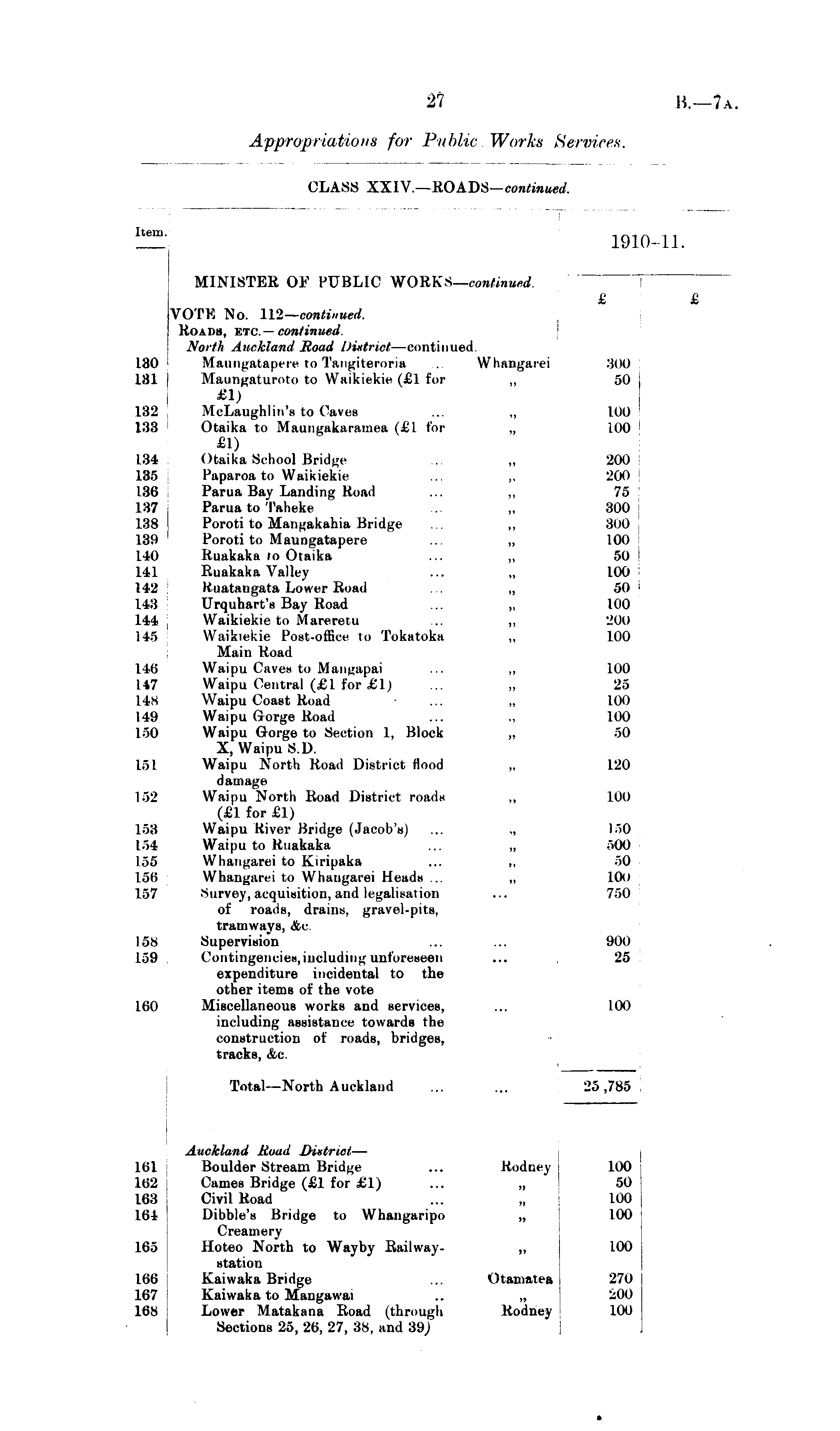 tern. 1910-11. MINISTER OF PUBLIC WORKS— continued. I £ 130 181 | 132 133 134 135 136 137 138 ! 139 140 141 142 143 144 145 146 147 148 149 150 151 152 153 154 155 156 157 158 159 160 VOTE No. 112— continued. Roads, etc.— continued. North Auckland Road District —continued. Maungatapere to Tangiteroria ... Whangarei Maungaturoto to Waikiekie (£l for „ £1) McLaughlin's to Caves ... „ Otaika to Maungakaramea (£1 for „ Otaika School Bridge ... ,, Paparoa to Waikiekie ... ,, Parua Bay Landing Road ... ,, Parua to Taheke . ,, Poroti to Mangakahia Bridge ... ,, Poroti to Maungatapere ... „ Ruakaka to Otaika ... ,, Ruakaka Valley ... „ Ruatangata Lower Road ... „ Urquhart's Bay Road ... „ Waikiekie to Mareretu ... ,, Waikiekie Post-office to Tokatoka „ Main Road Waipu Caves to Mangapai ... ,, Waipu Central (£1 for £1) Waipu Coast Road ... „ Waipu Gorge Road Waipu Gorge to Section 1, Block „ X, Waipu S.D. Waipu North Road District flood ,. damage Waipu North Road District roads ,, (£1 for £1) Waipu River Bridge (Jacob's) ... „ Waipu to Ruakaka ... „ Whangarei to Kiripaka ... ,, Whangarei to Whangarei Heads ... „ Survey, acquisition, and legalisation of roads, drains, gravel-pits, tramways, Ac Supervision ( 1 ontingencies,iucluding unforeseen expenditure incidental to the other items of the vote Miscellaneous works and services, including assistance towards the construction of roads, bridges, tracks, Ac 300 50 100 100 200 200 75 300 300 100 50 100 50 ; 100 20(> 100 100 25 100 100 50 120 100 150 500 50 100 750 900 25 100 I Total—North Auckland 25 ,785 161 162 163 164 165 166 167 168 .61 62 .63 61 Auckland Road District — Boulder Stream Bridge ... Rodney Cames Bridge (£1 for £1) ... „ Civil Road ... „ Dibble's Bridge to Whangaripo „ Creamery Hoteo North to Wayby Railway- ,, station Kaiwaka Bridge ... Otamatea Kaiwaka to Mangawai .. „ Lower Matakana Road (through Rodney Sections 25, 26, 27, 38, and 39J 100 50 100 100 100 270 200 100 65 66 .67 .68