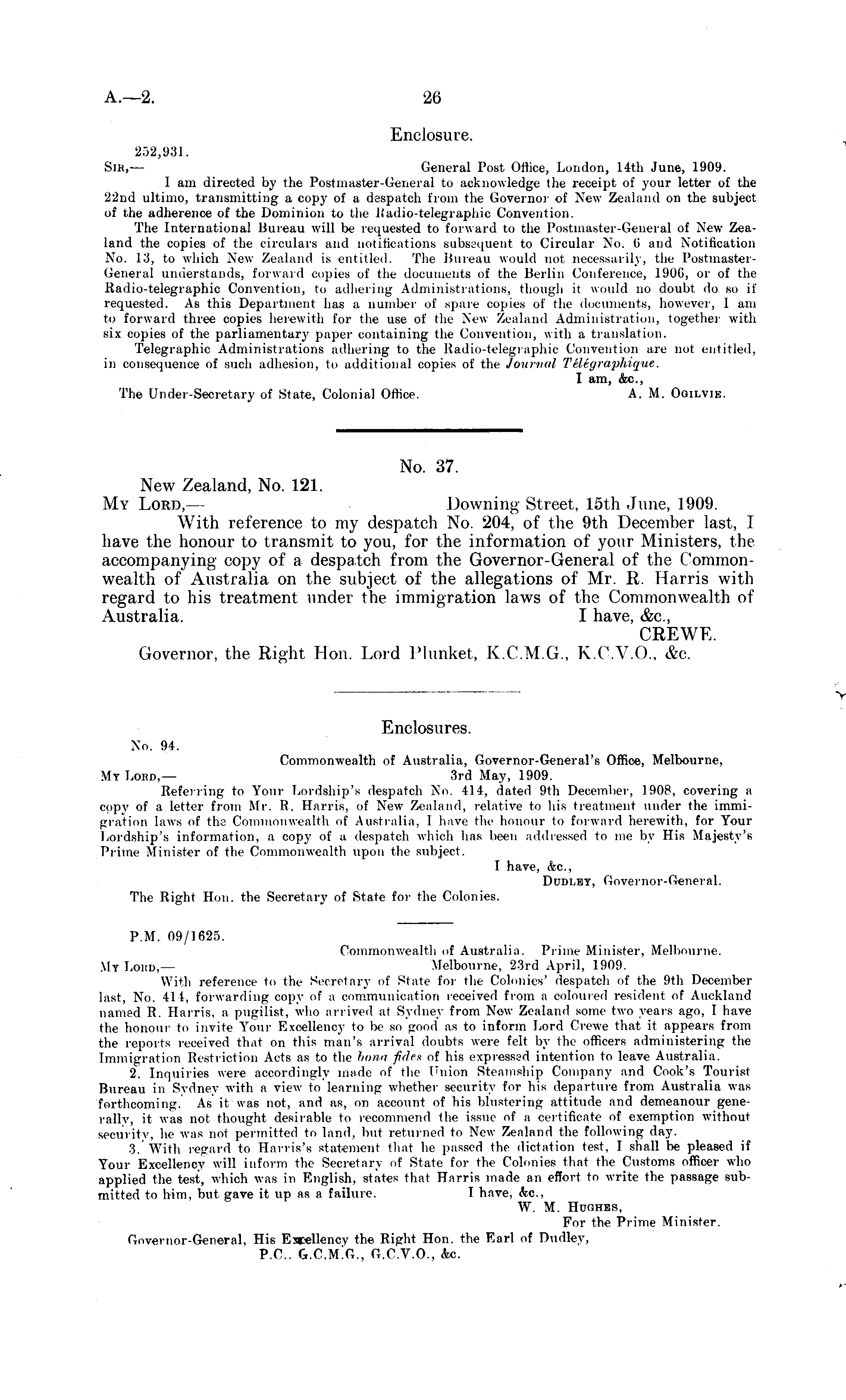 Enclosures. No. 94. Commonwealth of Australia, Governor-General's Office, Melbourne, My Lord,— 3rd May, 1909. Referring to Your Lordship's despatch No. +14, dated 9th December, 1908, covering a copy of a letter from Mr. R. Harris, of New Zealand, relative to his treatment under the immigration laws of the Commonwealth of .Australia, I have the honour to forward herewith, for Your Lordship's information, a copy of a despatch which has been addressed to me by His Majesty's Prime Minister of the Commonwealth upon the subject. I have, <fee, Dudley, Governor-General. The Right Hon. the Secretary of State for the Colonies. P.M. 09/1625. Commonwealth of Australia. Prime Minister, Melbourne. My Lord,— Melbourne, 23rd April, 1909. With reference to the Secretary of State for the Colonies' despatcli of the 9th December last. No. 411, forwarding copy of a comrmmication received from a coloured resident of Auckland named R. Harris, a pugilist, who arrived at Sydney from New Zealand sonic two years ago, I have the honour to invite Your Excellency to be so g 1 as to inform Lord Crewe that it appears from the reports received that on this man's arrival doubts were felt by the officers administering the [mmigratipn Restriction Acts as to the bona fides of his expressed intention to leave Australia. 2. Inquiries were accordingly made of the Union Steamship Company and Cook's Tourist Bureau in Sydney with a view to learning whether security for his departure from Australia was forthcoming. As it was not, and as, on account of his blustering attitude and demeanour generally, it was not thought desirable to recommend the issue of a certificate of exemption without security, he was noi permitted to land, but returned to New Zealand the following day. .!. With regard t<. Harris's statement that he passed the dictation test, I shall be pleased if Your Excellency will inform the Secretary of State for the Colonies that the Customs officer who applied the test, which was in English, states that Harris made an effort tn write the passage submitted to him, but gave it up as a failure. I have, &c, W. M. Hughes, For the Prime Minister. Governor-General, His Excellency the Right Hon. the Earl of Dudley, P.C.. G.C.V.0., (fee.