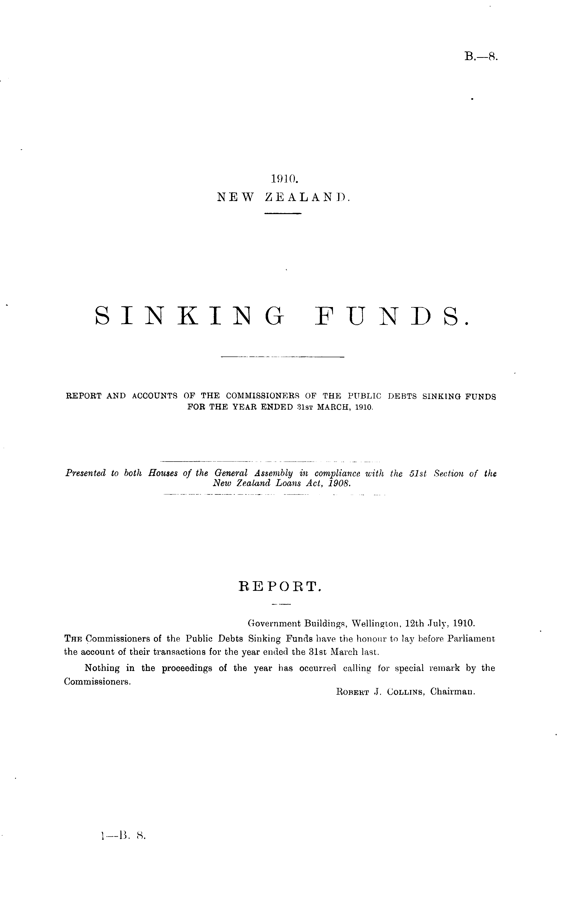 Government Buildings, Wellington, 12th July, 1910. The Commissioners of the Public Debts Sinking Funds have the honour to lay before Parliament the account of their transactions for the year ended the 31st March last. Nothing in the proceedings of the year has occurred calling for special remark by the Commissioners. Robert J. Collins, Chairman.
