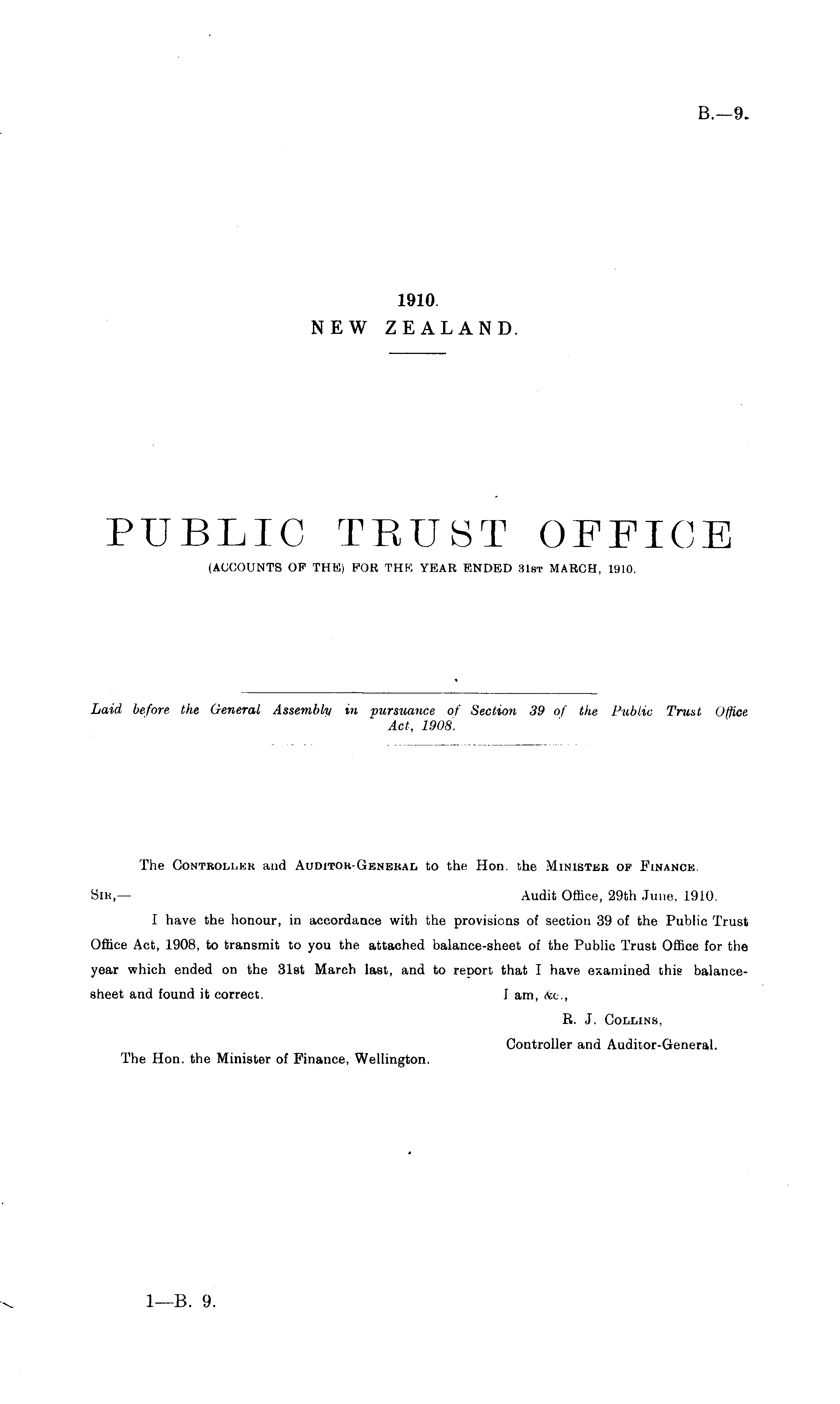 The Control,i.kk and Auditor-General to the Hon. the Minister op Finance Sir,— Audit Office, 29th June, 1910. I have the honour, in accordance with the provisions of section 39 of the Public Trust Office Act, 1908, to transmit to you the attached balance-sheet of the Public Trust Office for the year which ended on the 31st March last, and to report that I have examined this balancesheet and found it correct. I am, *c, R. J. Collins, Controller and Auditor-General. The Hon. the Minister of Finance, Wellington.