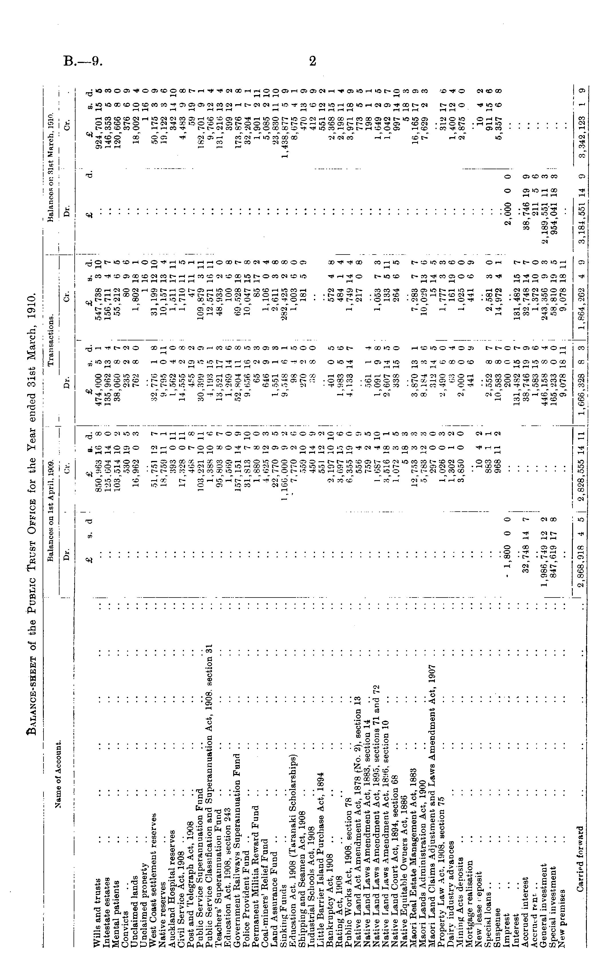 Name of Account. Balances on 1st April, 1909. Dr. Cr. Transactions. Dr. Gr. Balances on 31st March, 1910. Dr. Cr. Wills ana trusts Intestate estates .. .. .. Mental patients Convicts TJnclaimea lanas Unolaimea property West Coast settlement reserves .. .. Native reserves Aucklana Hospital reserves Civil Service Act, 1908 Post ana Telegraph Act, 1908 Public Service Superannuation Funa Public Service Classification ana Superannuation Act, 1908, section 31 Teachers' Superannuation Puna .. .. .. Eaucation Act, 1908, section 243 Government Railways Superannuation Puna Police Proviaent Funa Permanent Militia Reward Fund .. ... Coal-miners' Relief Fund Lana Assurance Fund Sinking Funds .. .. Education Act. 1908 (Taranaki Scholarships) Shipping and Seamen Act, 1908 Industrial Schools Act, 1908 Little Barrier Island Purchase Act, 1894 Bankruptcy Act, 1908 Rating Act, 1908 Public Works Act, 1908. section 78 Native Land Act Amendment Act, 1878 (No. 2), section 13 Native Land Laws Amendment Act, 1883, section 14 Native Land Laws Amendment Act, 1895, sections 71 and 72 Native Land Laws Amendment Act, 1896, section 10 Native Land Court Act, 1894, section 68 Native Equitable Owners Act, 1886 Maori Real Estate Management Act, 1883 Maori Lands Administration Act, 1900 Maori Land Claims Adjustment and Laws Amendment Act, 1907 .. Property Law Act, 1908, section 75 Dairy industry advances Mining Acts deposits Mortgage realisation New lease neposit Special loans .. .. Suspense Imprest Interest .. .. .. .. ., Accrued interest Accrued rent .. .. .. .. General investment .. .. Special investment New premises £ s. a - 1,800 0 0 32,748 14 7 1,986,749 12 2 847,619 17 8 £ s. a. £ a. a. 850,963 16 8 474,000 5 1 125,604 14 0 135,962 13 4 103,514 10 2 38,060 8 7 530 19 5 235 2 2 16,962 0 3 762 8 0 51,751 12 7 32,776 1 8 18,759 11 1 9,795 0 11 393 0 11 1,562 4 0 17,328 0 11 14,555 2 8 468 7 8 455 19 2 103,221 10 11 30,399 5 9 1,388 10 6 4,193 15 1 95,803 8 7 13,521 17 3 1,569 0 0 1,269 14 6 157,151 14 9 52,804 11 8 31,813 7 10 9,656 16 5 1,880 8 0 65 2 3 4,625 12 3 646 9 9 22,770 9 5 1,551 1 3 1,166,000 9 2 9,548 6 1 - 7,770 2 6 98 4 5 559 10 0 270 2 0 450 14 9 38 8 0 551 12 2 2,197 10 10 401 0 5 3,697 15 6 1,983 5 6 6,355 19 0 4,133 14 7 556 4 9 759 2 5 561 1 4 1,687 4 10 1,091 9 8 3,516 18 1 2,607 14 5 1,072 3 5 338 15 0 5 18 3 12,753 3 3 3,870 13 1 5,783 12 3 8,184 3 6 297 0 0 312 14 5 1,026 0 3 2,490 6 0 1,302 12 63 8 4 3,850 0 0 2,000 0 0 441 6 9 10 4 2 883 1 1 2,552 8 7 968 11 2 10,583 8 7 200 0 0 131,482 15 7 38,746 19 9 1,583 15 6 446,158 8 4 165,233 0 0 9,078 18 11 £ s. a. 547,738 3 10 156,711 4 7 55,212 6 5 80 9 6 1,802 18 1 1 16 0 31,199 12 10 10,157 13 4 1,511 17 11 1,710 11 5 47 11 1 109,879 3 11 12,571 16 11 ■ 48,935 2 0 100 6 8 69,528 18 7 10,047 15 8 85 17 2 1,106 0 4 2,611 3 8 282,425 2 8 1,003 6 0 181 5 9 572 4 8 484 1 4 1,749 14 4 217 0 8 1,053 7 3 133 5 11 264 6 5 7,283 7 7 10,029 13 6 15 14 5 1,777 3 3 161 19 6 1,025 0 0 j 441 6 9 2,581 3 0 14,972 4 1 131,482 15 7 32,748 14 7 1,372 10 0 I 243,356 9 3 58,810 19 5 9,078 18 11 £ a. £ s. a. 924,701 15 5 146,353 5 3 120,666 8 0 376 6 9 18,002 10 4 1 16 0 50,175 3 9 19,122 3 6 342 14 10 4,483 9 8 59 19 7 182,701 9 1 9,766 12 4 131,216 13 4 399 12 2 173,876 1 8 32,204 7 1 1,901 2 11 5,085 2 10 23,830 11 10 1,438,877 5 9 8,675 4 1 470 13 9 412 6 9 551 12 2 2,368 15 1 2,198 11 4 3,971 18 9 773 5 5 198 1 1 1,649 2 5 1,042 9 7 997 14 10 5 18 3 16,165 17 9 7,629 2 3 312 17 6 1,400 12 4 2,875 0 0 '.'. 10 4 2 911 15 6 5,357 6 8 2,000 0 0 38,746 19 9 .. 211 5 6 2,189,551 11 3 954,041 18 3 , Carried forward 2,868,918 4 5 2,828,555 14 11 1,666,328 8 3 : 1,864,262 4 9 1,864,262 4 9 3,184,551 14 9 3,342,123 1 9
