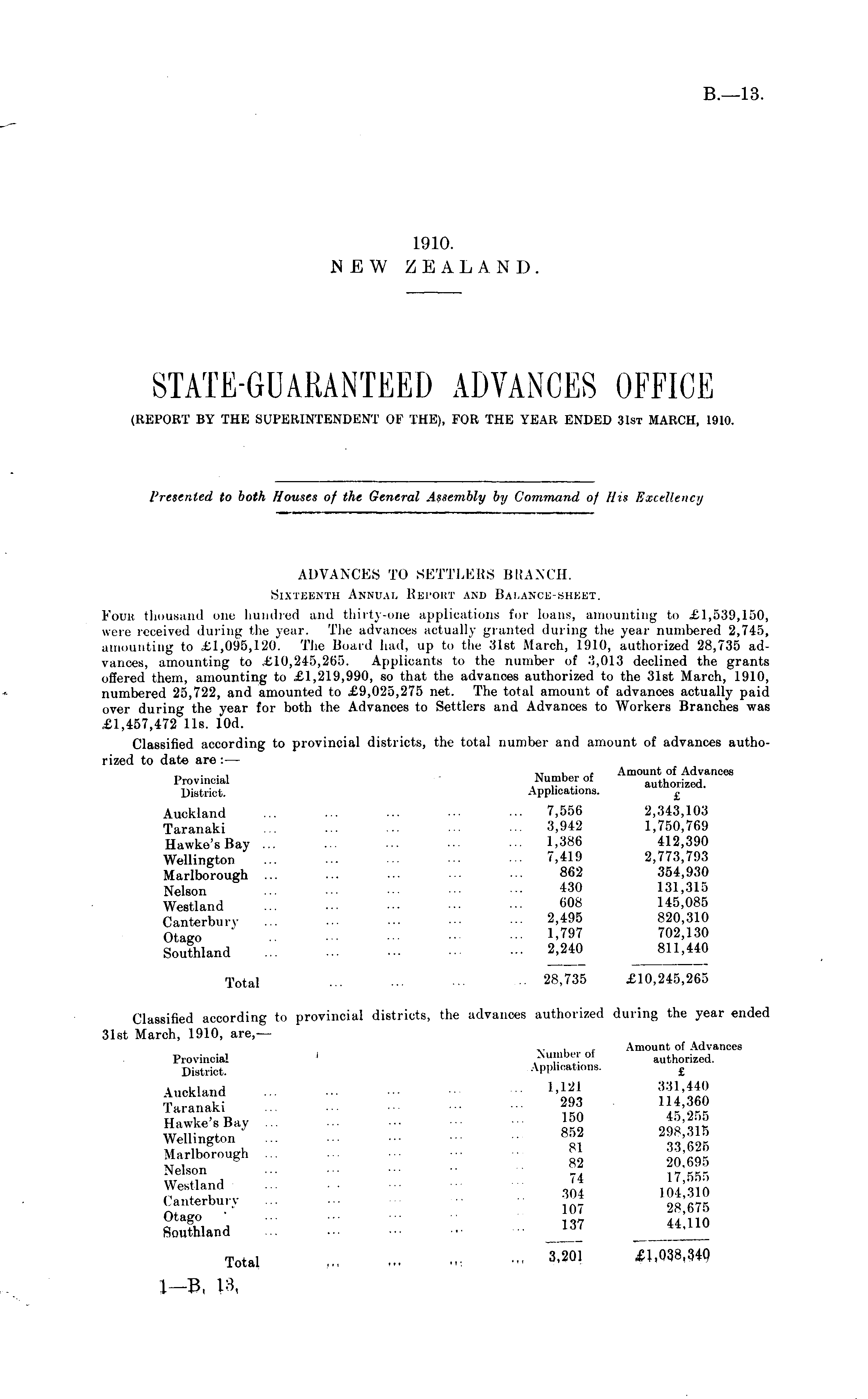 ADVANCES TO SETTLERS BKANCH. Sixteenth Annual Report and Balance-sheet. Four thousand one hundred and thirty-one applications for loans, amounting to £ 1,539,150, were received during ilie year. The advances actually granted during the year numbered 2,745, amounting to £1,095,120. The Board had, up to the 31st .March, 1910, authorized 28,735 advanoes, amounting to £10,245,265. Applicants to the number of 3,013 declined the grants offered them, amounting to £1,219,990, so that the advanoes authorized to the 31st March, 1910, numbered 25,722, and amounted to £9,025,275 net. The total amount of advances actually paid over during the year for both the Advances to Settlers and Advances to Workers Branches was £1,457,472 lis. lOd. Classified according to provincial districts, the total number and amount of advances authorized to date are : — XT . , Amount of Advances Pltmnoial . Nu J? b " of authorized. District. Applications. £ Auckland 7,556 2,343,103 Taranaki 3,942 1,750,769 Hawke'sßay 1,386 412,390 Wellington 7,419 2,773,793 Marlborough ... ... ■•■ ••■ • •• 862 354,930 Nelson 430 131,315 Westland ... ... •■• ••• 608 145,085 Canterbury 2 > 495 820 >310 Otago ' 1,797 702,130 Southland .- .- 811,440 Total ... ... ••• 28,735 £10,245,265 Classified according to provincial districts, the advances authorized during the year ended 31st March, 1910, are, — , , Amount of Advances Provincial ' Number oi authorized. District. Applications. £ Auckland • LgJ 331,440 Taranaki - "^BO Hiwke'sßav ••■ ••• ••• 15 ° 40,255 H.i kesl-.tv ... 298,316 Wellington ... ' Marlborough - g 38 625 Nelson ... ••■ ••• •• _. ..'.., ... ~ , 14 17,555 ... 304 104,310 Canterbury ... 675 Siand ::: ::: ::: ::: .:: j* 4uio Total , , .., 3.201 £1,038,340