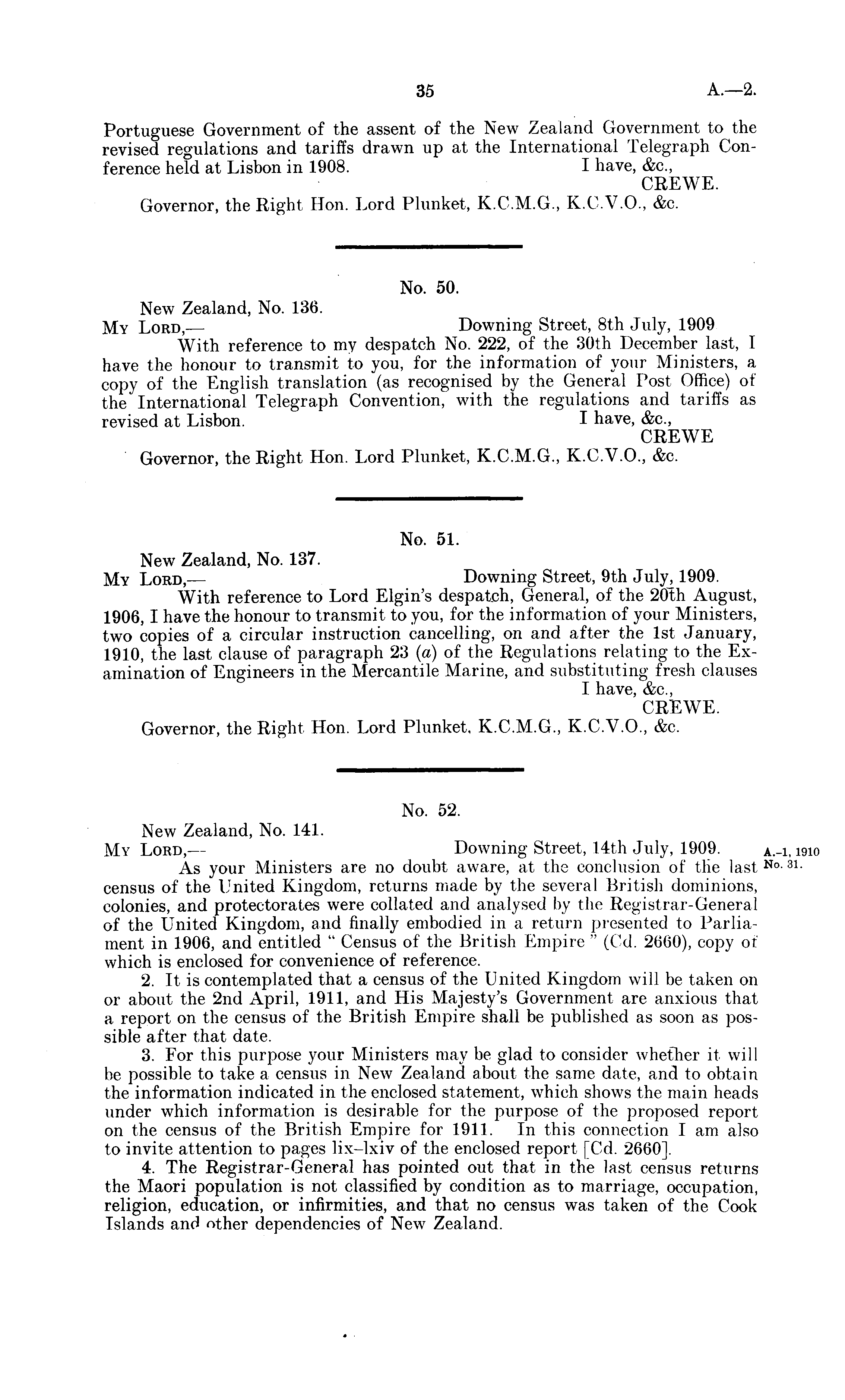 No. 52. New Zealand, No. 141. My Lord,— Downing Street, 14th July, 1909. As your Ministers are no doubt aware, at the conclusion of the last census of the United Kingdom, returns made by the several British dominions, colonies, and protectorates were collated and analysed by the Registrar-General of the United Kingdom, and finally embodied in a return presented to Parliament in 1906, and entitled " Census of the British Empire " (Cd. 2660), copy of which is enclosed for convenience of reference. 2. It is contemplated that a census of the United Kingdom will be taken on or about the 2nd April, 1911, and His Majesty's Government are anxious that a report on the census of the British Empire shall be published as soon as possible after that date. 3. For this purpose your Ministers may be glad to consider whether it will be possible to take a census in New Zealand about the same date, and to obtain the information indicated in the enclosed statement, which shows the main heads under which information is desirable for the purpose of the proposed report on the census of the British Empire for 1911. In this connection lam also to invite attention to pages lix-lxiv of the enclosed report [Cd. 2660]. 4. The Registrar-General has pointed out that in the last census returns the Maori population is not classified by condition as to marriage, occupation, religion, education, or infirmities, and that no census was taken of the Cook Islands and other dependencies of New Zealand.