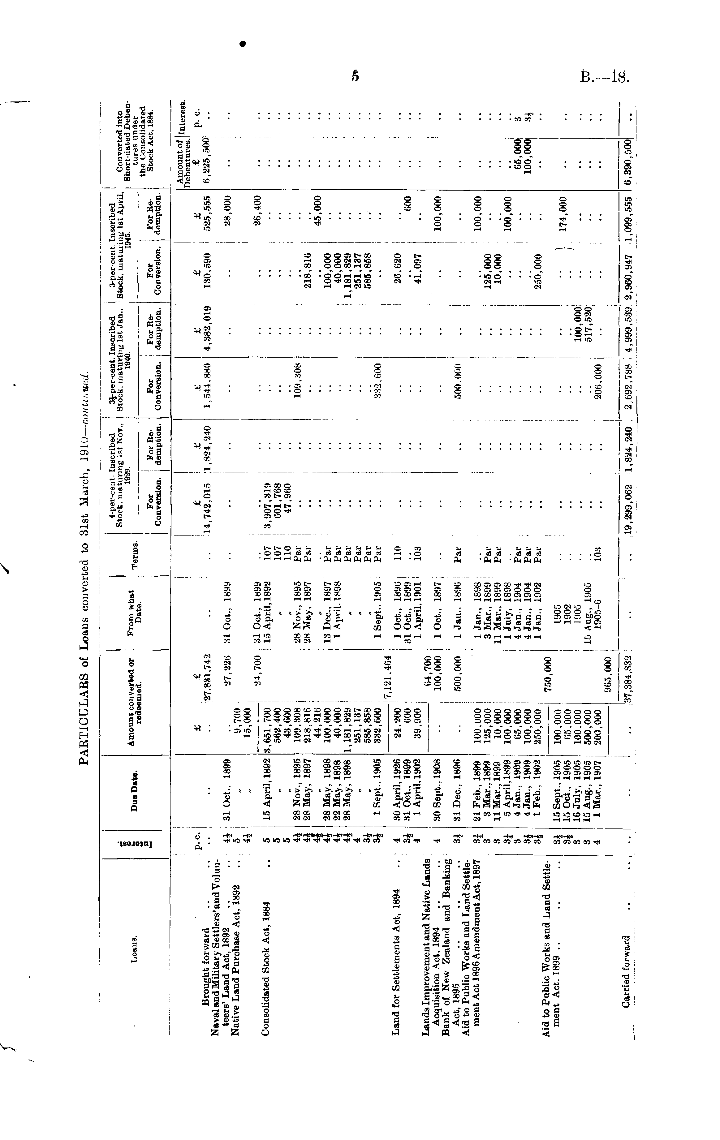 From what Date. I Ti 4-per-cent. Inscribed Stock, maturing 1st Nov., 1929. 3J-per-cent. Inscribed Stock, maturing 1st Jan., 1940. 3-per-cent. Inscribed Stock, maturing 1st April, 1945. Converted into Short-dated Debentures under the Consolidated Stock Act, 1884. Loans. £ \H __ a. I a Due Date. Amount converted or redeemed. For For Re- | Conversion, demption. For For Reconversion, demption. For For KeCouversion. 1 demption. p. c. Brought forward Naval and Military Settlers' and Volunteers' Land Act, 1892 .. .. 41 Native Land Purchase Act, 1892 .. 5 27,831.742 £ £ 14,742,015 1,824,240 e 1,544,880 ii £ £ 4,382.019 130,590 525,555 Amount of (interest. Debentures. I £ p. c. 0,225,500! 31 Oct., 1899 27,226 31 Oct.. 1899 11,700 15,000 24,700 31 Oct.. 1899 3.651,700 : 15 April, 1892 562.400 43,600 109,308 28 Nov.. 1895 218.816 28 Mav. 181)7 44,210 100,000 13 Dec, 181)7 40,000 1 April, 1898 1,181,829 251, 137 585,858 332,000 1 Sept.. 1905 ; 7,121. 404 24.200 1 Oct.. 1896 600 31 Oct.. 1899 39,900 1 April. 1901 64,700 100,000 1 Oct., 181)7 500,000 1 Jan.. 1896 100,000 1 Jan., 1898 125,000 '. 3 Mar., 1899 10,000 11 Mar., 1899 100.000 Uuly, 1S98 65,000 ' 4 Jan., 1904 100,000 4 Jan., 1904 250,000 i Uan., 1902 i 750,000 100,000 ! 1905 05,000 1902 100.000 1905 500,000 15 Aug., 1905 200,000 1905-6 965,000 107 3,907,319 107 601,768 110 47,960 Par Par Par V. '.'. Par Par Par Par Par 110 103 .. '.'. Par Par Par Par !! !! Par Par 103 '.'. '.'. 109. 308 332,600 SOO.OdO 206,000 28,000 Consolidated Stock Act, 1884 .. 5 5 5 4i 4. 4 34 3i 15 April, 1892 26,400 .: .. .. 28 Nov.. 1895 28 May, 1897 .. .. 218,816 45,000 100,000 40,000 1,181,829 251,137 585,858 .. 1 28 May. 1898 22 May, 1898 28 Mav, 1898 .. .. .. 1 Sept.. 1905 .. Land for Settlements Act, 1894 4 4 30 April, 1926 31 Oct., 1899 1 April, 1902 26,620 600 41,097 .. Lands Improvement and Native Lands Acquisition Act, 1894 .. .. 4 Bank of New Zealand and Banking Act, 1895 .. .. 31 Aid to Public Works and Land Settlement Act J 896 Amendment Aot, 1897 3J 3 3 3 3J Aid to Public Works and Land Settlement Act, 1899 .. .. .. 3j 34 3 3 4 30 Sept.. 1908 31 Dec. 181)0 21 Feb., 1899 3 Mar., 1899 11 Mar., 18111) 5 April, 1899 4 Jan., 1909 4 Jan., 1909 1 Feb., 1902 100,000 .. .. 100,000 125,000 10,000 100,000 65,000 3 100,000 34 .. '.'. 250.000 '.'. 15 Sept., 1905 15 Oct., 1905 16 Julv, 1905 15 Aug., 1905 1 Mar., 1907 I 174,000 100,000 '.'. 517,520 Carried forward .. 37,384,832 . 19,299,062 1,824,240 2.692,788 4,999,539: 2,960,947 1,099,555 6,390,500 137,384,832 . 19,299,062 1,824,240 , 2,692,788