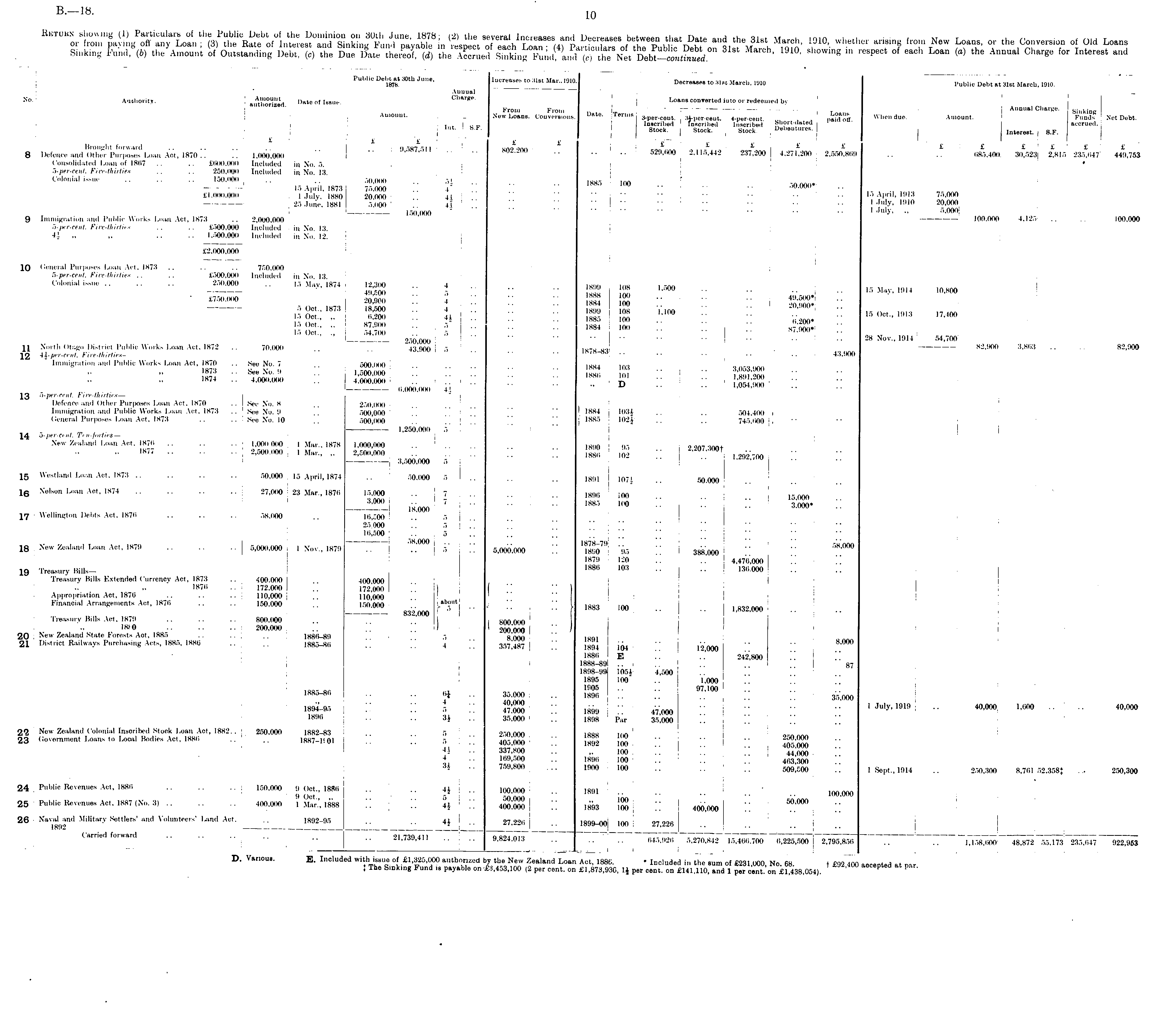 Return showing (1) Particulars of the Public Debt of the Dominion on 30th June, 1878; (2) the several Increases and Decreases between that Date and the 31st March, 1910, whether arising from New Loans, or the Conversion of Old Loans or from paying off any Loan; (3) the Rate of Interest and Sinking Fund payable in respect of each Loan ; (4) Particulars of the Public Debt on 31st March, 1910, showing in respect of each Loan (a) the Annual Charge for Interest and Sinking Fund (b) the Amount of Outstanding Debt, (c) the Due Date thereof, (d) the accrued Sinking Fund, and (c) the Net Debt—continued.