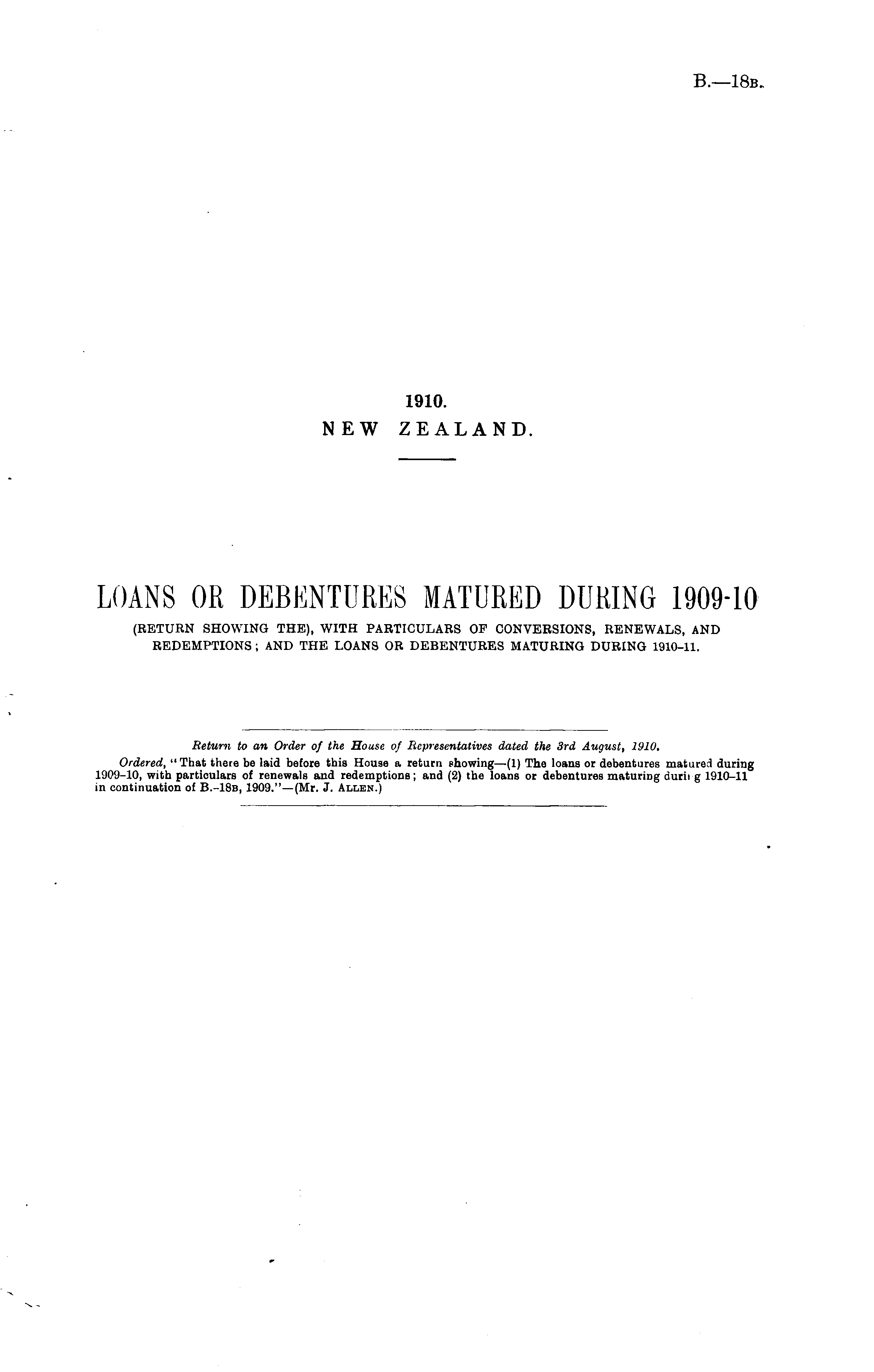 Return to an, Order of the House of Representatives dated the 3rd August, 1910, Ordered, "That there be laid before this House a return showing—(l) The loans or debentures matured during 1909-10, with particulars of renewals and redemptions; and (2) the loans ot debentures maturing duri, g 1910-11 in continuation of 8.-188, 1909."—(Mr. J. Allen.)