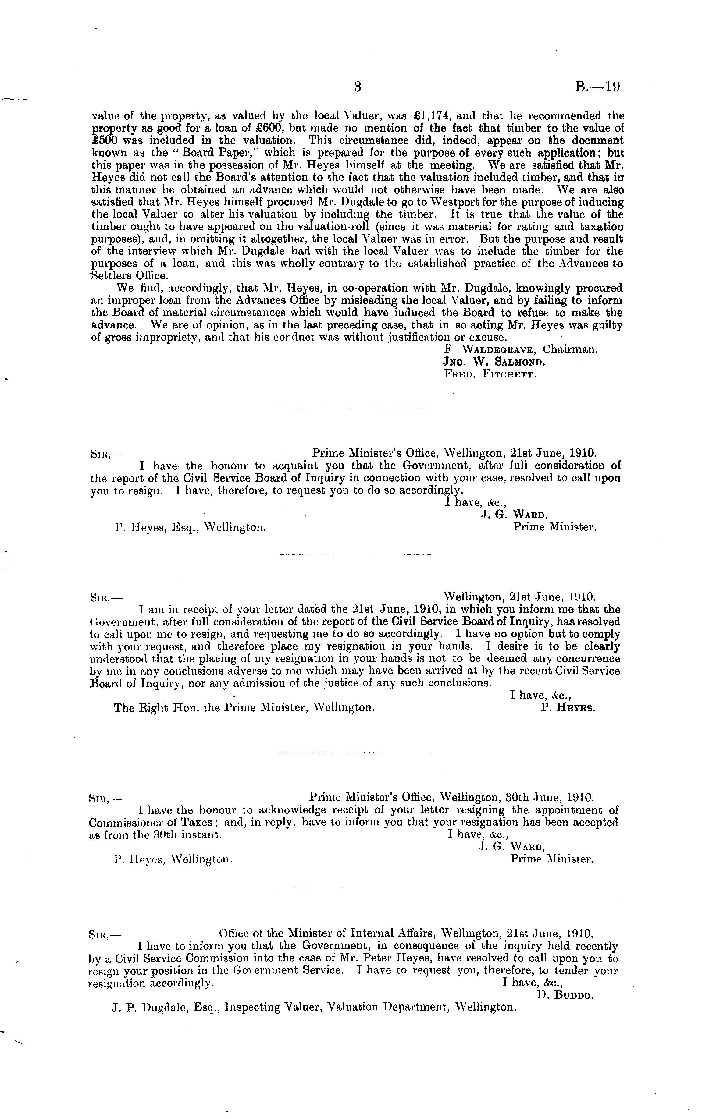 Sid,—- Wellington, 21st June, 1910. I am in receipt of your letter dated the 21st June, 1910, in which you inform me that the Government, after full consideration of the report of the Civil Service Board of Inquiry, has resolved to call upon me to resign, and requesting me to do so accordingly. I have no option but to comply with your request, and therefore place my resignation in your hands. I desire it to be clearly understood that the placing of my resignation in your hands is not to be deemed any concurrence by me in any conclusions adverse to me which may have been arrived at by the recent Civil Service Board of Inquiry, nor any admission of the justice of any such conclusions. I have, Ac, The Right Hon. the Prime Minister, Wellington. P. Heyes.