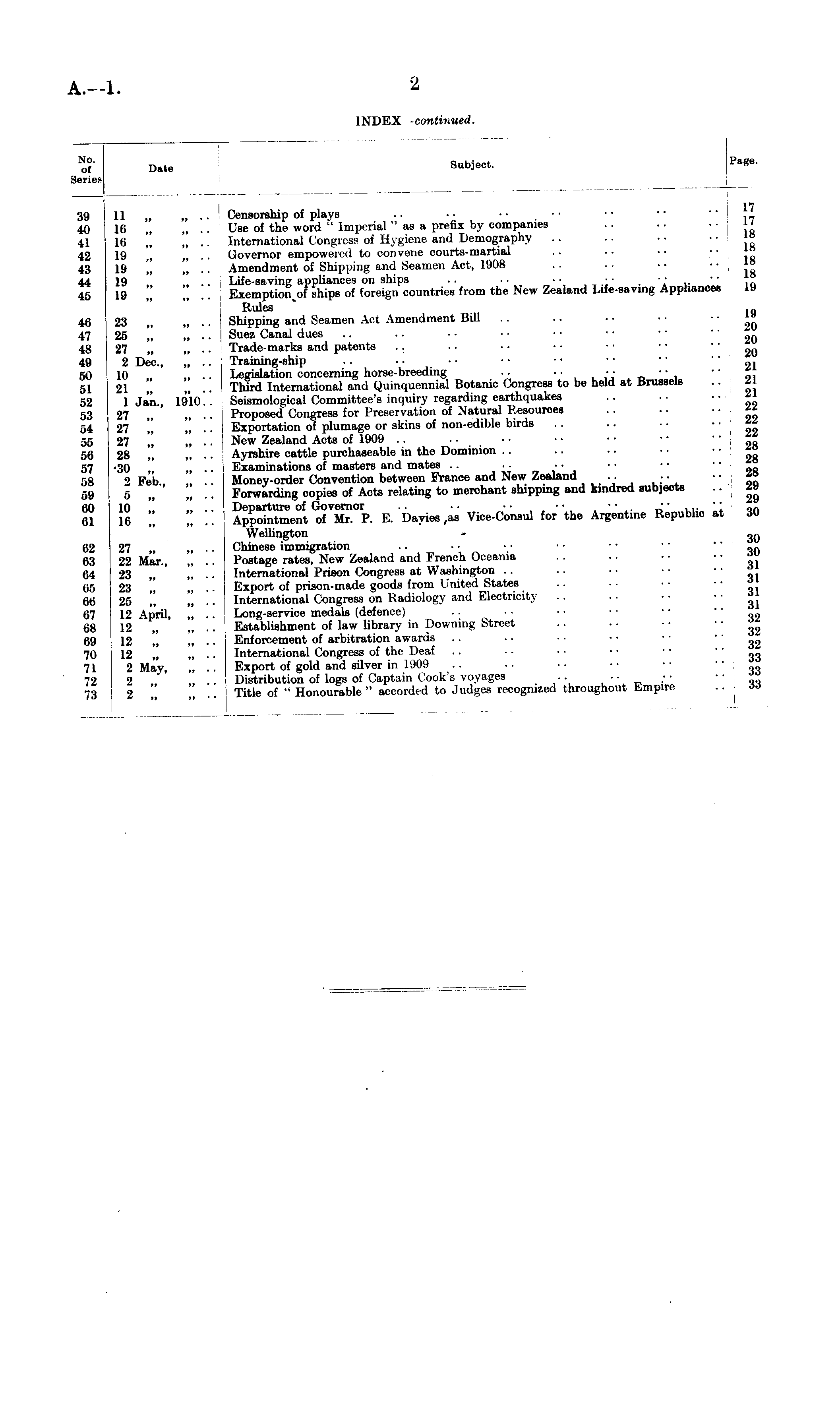 i No. of leries Date Subject. P«e. 39 40 41 42 43 44 45 46 47 48 49 50 51 52 53 54 55 56 57 58 59 60 61 17 11 I Censorship of plays .. .. ■• ■■ ■• ■• ._ 16 „ „ .. Use of the word " Imperial" as a prefix by companies .. •■ •• j' 16 „ „ .. International Congress of Hygiene and Demography .. .. • • " } a 19 jp „ .. Governor empowered to convene courts-martial .. •• •• •• j 19 \\ ',',.. Amendment of Shipping and Seamen Act, 1908 .. .. • • " ia 19 .. .... Life-saving appliances on ships .. "..,,'.' , '» u io 19 I " .. ships of foreign countries from the New Zealand Lile-savmg Appliances 19 Rules . q 23 Shipping and Seamen Act Amendment Bill .. • • • • '■ 25 „ „ .. | Suez Canal dues .. .. • • • • • - • ■ 20 27 „ „ .. Trade-marks and patents .. • • • ■ ■ • • • 2 Dec ; Training-ship .. . ■ • • • • ■ • „i 10 Legislation concerning horse-breeding .. ■ • • • • • • • 21 ! Third International and Quinquennial Botanic Congress to be held at Brussels .. 1 Jail 1910 . ! Seismological Committee's inquiry regarding earthquakes .. . ■ " «« 27 | Proposed Congress for Preservation of Natural Resources .. . ■ • • £j 27 "„ ',',..', Exportation of plumage or skins of non-edible birds -. • • " ii 27 „ „ .. I New Zealand Acts of 1909 .. .. • • • • • • • • "28 28 „ „ .. Ayrshire cattle purchaseable in the Dominion .. .. • • • • "28 •30 " „ .. Examinations of masters and mates .. .. • • • • • ■ " S 2 Feb . Money-order Convention between France and New Zealand • • • • "90 5 Forwarding copies of Acts relating to merchant shippmg and kindred subjects .. z» 10 .. .... Departure of Governor .. ■•.."", . " *• r>l_ui;- 11 90 16 " „ .. Appointment of Mr. P. E. Dayies ,as Vice-Consul for the Argentine Republic at 30 Wellington on 27 „ „ .. Chinese immigration ■ • ■ • ■ ■ • • „„ 22 Mar Postage rates, New Zealand and French Oceania .. ■ • • • 23 International Prison Congress at Washington .. .. • • • • 23 " „ .. Export of prison-made goods from United States .. •• •■ •• • 25 „ „ .. International Congress on Kadiology and Electricity 12 April Long-service medals (defence) . • • • • • • • „„ 12 „ „ .. Establishment of law library in Downing Street .. . ■ • • "32 12 „ „ .. Enforcement of arbitration awards .. .. • • 12 „ „ .. International Congress of the Deaf .. .. • • • • 2 May Export of gold and silver in 1909 ■ • ■ • • • • „.. 2 " ... Distribution of logs of Captain Cook's voyages .. •• _ ." ■ " ,., 2 Title of " Honourable " accorded to Judges recognized throughout Lmpire .. 00 62 63 64 65 66 67 68 69 70 71 72 73 1