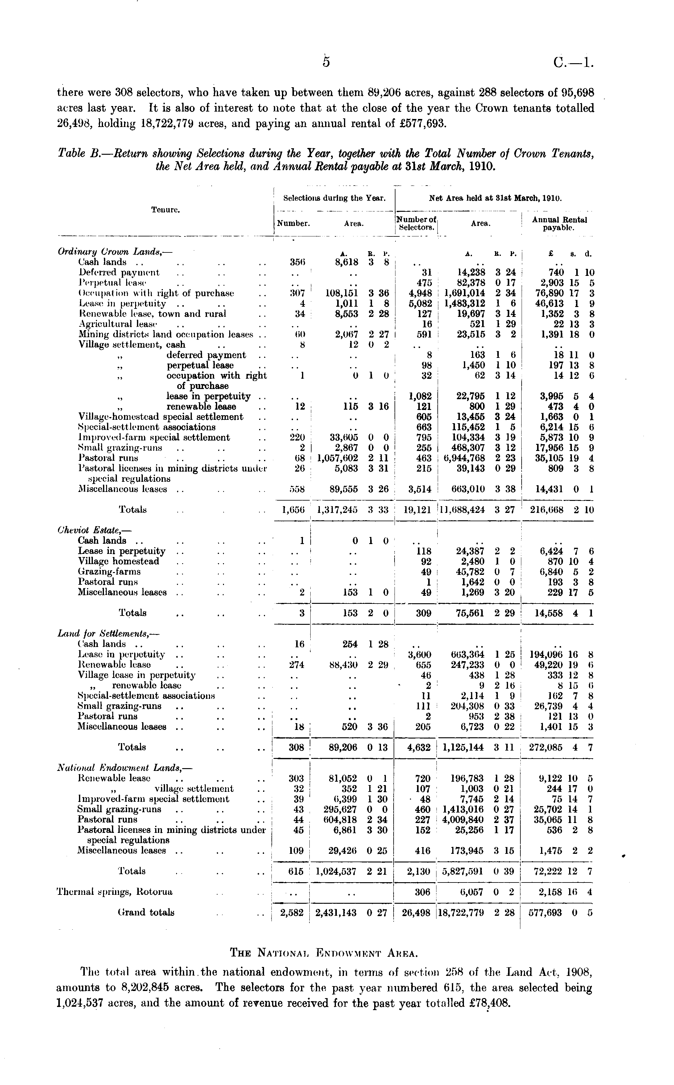 Table B. — Return showing Selections during the Year, together with the Total Number of Crown Tenants, the Net Area held, and Annual Rental payable at 31st March, 1910.