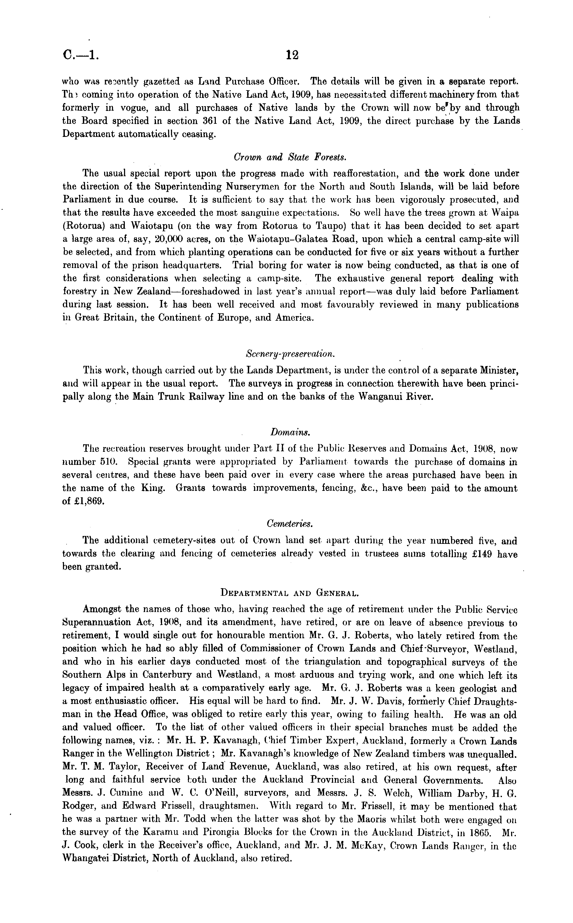 who was recently gazetted as Land Purchase Officer. The details will be given in a separate report. Th; coming into operation of the Native Land Act, 1909, has necessitated different machinery from that formerly in vogue, and all purchases of Native lands by the Crown will now be f by and through the Board specified in section 361 of the Native Land Act, 1909, the direct purchase by the Lands Department automatically ceasing. Crown and State Forests. The usual special report; upon the progress made with reafforestation, and the work done under the direction of the Superintending Nurserymen for the North and South Islands, will be laid before Parliament in due course. It is sufficient to say that the work has been vigorously prosecuted, and that the results have exceeded the most sanguine expectations. So wel] have the trees grown at Waipa (Rotorua) and Waiotapu (on the way from Rotorua to Taupo) that it has been decided to set apart a large area of, say, 2<).<XK) acres, on the Waiotapu-Galatea Road, upon which a central camp-site will be selected, and from which planting operations can be conducted for five or six years without a further removal of the prison headquarters. Trial boring for water is now being conducted, as that is one of the first considerations when selecting a camp-site. The exhaustive general report dealing with forestry in New Zealand—foreshadowed in last year's annual report —was duly laid before Parliament during last session. It has been well received and mosi favourably reviewed in many publications in Great Britain, the Continent of Europe, and America. Scenery-preservation. This work, though carried out by the Lands Department, is under the control of a separate Minister, and will appear in the usual report. The surveys in progress in connection therewith have been principally along the Main Trunk Railway line and on the banks of the Wanganui River. Domains. The recreation reserves brought under Part II of the Public Reserves and Domains Act, 1908. now number 510. Special grants were appropriated by Parliameni towards the pin-chase of domains in several centres, and these have been paid over in every case where the areas purchased have been in the name of the King. Grants towards improvements, fencing, &c, have been paid to the amount of £1,869. Cemeteries. The additional cemetery-sites out of Crown land set apart during the year numbered five, and towards the clearing and fencing of cemeteries already vested in trustees sums totalling £149 have been granted. Departmental and General. Amongst the names of those who. having reached the age of retirement under the Public Service Superannuation Act. I9<>B, and its amendment, have retired, or are on leave of absence previous to retirement, I would single out for honourable mention Mr. G. J. Roberts, who lately retired from the position which he had so ably filled of Commissioner of Crown Lands and Chief-Surveyor, Westland, and who in his earlier days conducted most of the triangulation and topographical surveys of the Southern Alps in Canterbury and Westland. a most arduous and trying work, and one which left its legacy of impaired health at a comparatively early age. Mr. G. J. Roberts was a keen geologist and a most enthusiastic officer. His equal will be hard to find. Mr. J. W. Davis, formerly Chief Draughtsman in the Head Office, was obliged to retire early this year, owing to failing health. He was an old and valued officer. To the list of other valued officers in their special branches must be added the following names, viz. : Mr. H. P. Kavanagh, Chief Timber Expert, Auckland, formerly :i Crown Lands Ranger in the Wellington District; Mr. Kavanagh , s knowledge of New Zealand timbers was unequalled. Mr. T. M. Taylor, Receiver of Land Revenue, Auckland, was also retired, at his own request, after long and faithful service loth under the Auckland Provincial and General Governments. Also Messrs. .). Cumine and W. G. O'Neill, surveyors, and Messrs. J. S. Welch, William Darby, H. G. Rodger, and Edward Krissell. draughtsmen. With regard to Mr. Frissell, it may be mentioned that he w.is a partner with Mr. Todd when the latter was shot by the Maoris whilst both were engaged on the survey of the Kaiainn and Pirongia Blocks for the Crown in the Auckland District, in 1865. Mr. J. Cook, clerk in the Receiver's office, Auckland, and Mr. J. M. McKay, Crown Lands Ranger, in the Whangarei District, North of Auckland, also retired.