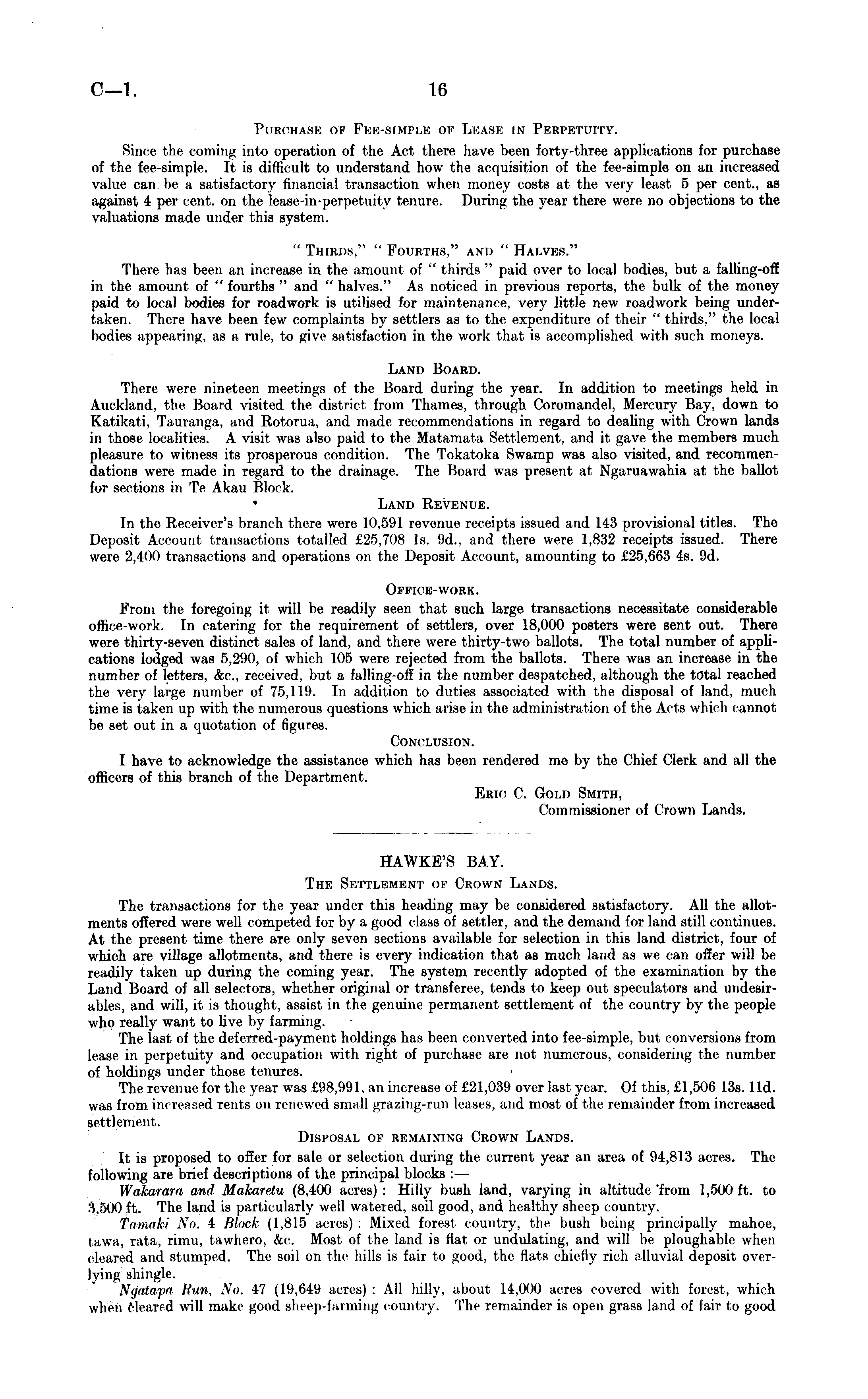 Purchase of Fee-simple ok Lease in Perpetuity. Since the coming into operation of the Act there have been forty-three applications for purchase of the fee-simple. It is difficult to understand how the acquisition of the fee-simple on an increased value cm be a satisfactory financial transaction when money costs at the very least 5 per cent., as against 4 per cent, on the lease-in-perpetuitv tenure. During the year there were no objections to the valuations made under this system. "Thirds," "Fourths," and " Ealves." There has been an increase in the amount of " thirds " paid over to local bodies, but a falling-off in the amount of " fourths " and "halves." As noticed in previous reports, the bulk of the money paid to local bodies for roadwork is utilised for maintenance, very little new roadwork being undertaken. There have been few complaints by settlers as to the expenditure of their "thirds." the local bodies appearing, as a rule, to give satisfaction in the work that is accomplished with such moneys. Land Board. There were nineteen meetings of the Board during the year. In addition to meetings held in Auckland, the Board visited the district from Thames, through Coromandel, Mercury Bay, down to Katikati. Tauranga, and Rotorua, and made recommendations in regard to dealing with Crown lands in those localities. A visit was also paid to the Matamata Settlement, and it gave the members much pleasure to witness its prosperous condition. The Tokatoka Swamp was also visited, and recommendations were made in regard to the drainage. The Board was present at Ngaruawahia at the ballot for sections in Te Akau Block. Land Revenue. In the Receiver's branch there were 10,591 revenue receipts issued and 143 provisional titles. The Deposit Account transactions totalled £25,708 Is. 9d., and there were 1,832 receipts issued. There were 2,400 transactions and operations on the Deposit Account, amounting to £25,663 4s. 9d. OFFrcE-WORK. From the foregoing it will be readily seen that such large transactions necessitate considerable office-work. In catering for the requirement of settlers, over 18,000 posters were sent out. There were thirty-seven distinct sales of land, and there were thirty-two ballots. The total number of applications lodged was 5.290, of which 105 were rejected from the ballots. There was an increase in the number of letters, &c, received, but a falling-off in the number despatched, although the total reached the very large number of 75,119. In addition to duties associated with the disposal of land, much time is taken up with the numerous questions which arise in the administration of the Acts which cannot be set out in a quotation of figures. Conclusion. I have to acknowledge the assistance which has been rendered me by the Chief Clerk and all the officers of this branch of the Department. Eric C. Gold Smith, Commissioner of Crown Lands.