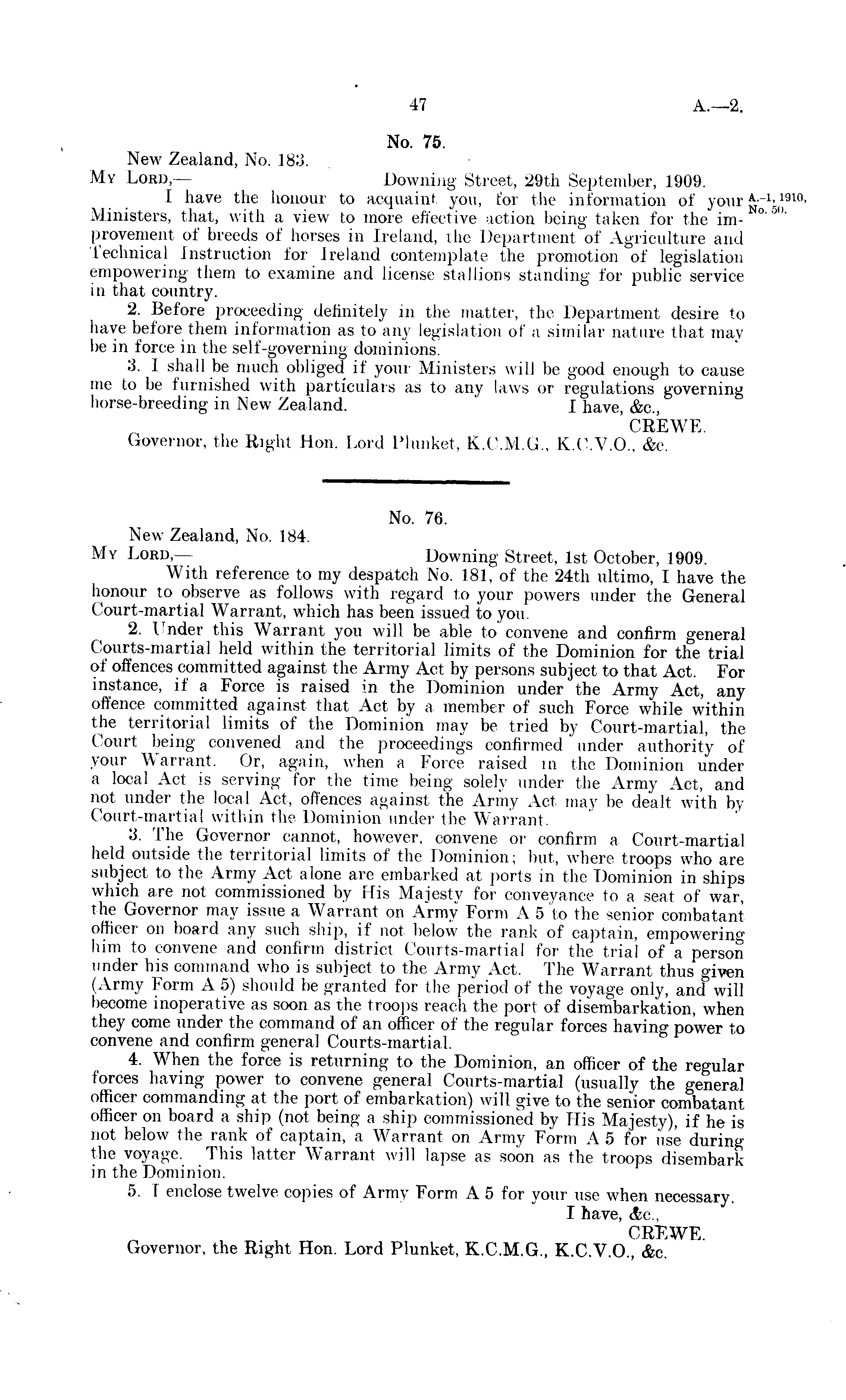 No. 76. New Zealand, No. 184. My Lord,— Downing Street, Ist October, 1909. With reference to my despatch No. 181, of the 24th ultimo, I have the honour to observe as follows with regard to your powers under the General Court-martial Warrant, which has been issued to you. 2. Under this Warrant you will be able to convene and confirm general Courts-martial held within the territorial limits of the Dominion for the trial of offences committed against the Army Act by persons subject to that Act. For instance, if a Force is raised in the Dominion under the Army Act, any offence committed against that Act by a member of such Force while within the territorial limits of the Dominion may be tried by Court-martial, the Court being convened and the proceedings confirmed under authority of your Warrant. Or, again, when a Force raised in the Dominion under a local Act is serving for the time being solely under the Army Act, and not under the local Act, offences against the Army Act may be dealt with by Court-martial within the Dominion under the Warrant. 3. The Governor cannot, however, convene or confirm a Court-martial held outside the territorial limits of the Dominion; but, where troops who are subject to the Army Act alone are embarked at ports in the Dominion in ships which are not commissioned by His Majesty for conveyance to a seat of war, the Governor may issue a Warrant on Army Form A 5 to the senior combatant officer on board any such ship, if not below the rank of captain, empowering him to convene and confirm district Courts-martial for the trial of a person under his command who is subject to the Army Act. The Warrant thus given (Army Form A 5) should be granted for the period of the voyage only, ancf will become inoperative as soon as the troops reach the port of disembarkation, when they come under the command of an officer of the regular forces having power to convene and confirm general Courts-martial. 4. When the force is returning to the Dominion, an officer of the regular forces having power to convene general Courts-martial (usually the general officer commanding at the port of embarkation) will give to the senior combatant officer on board a ship (not being a ship commissioned by His Majesty), if he is not below the rank of captain, a Warrant on Army Form A 5 for use during the voyage. This latter Warrant will lapse as soon as the troops disembark in the Dominion. 5. [ enclose twelve copies of Army Form A 5 for your use when necessary. I have, <fee, CREWE. Governor, the Right Hon. Lord Plunket, K.C.M.G., X.C.V.0., &c.