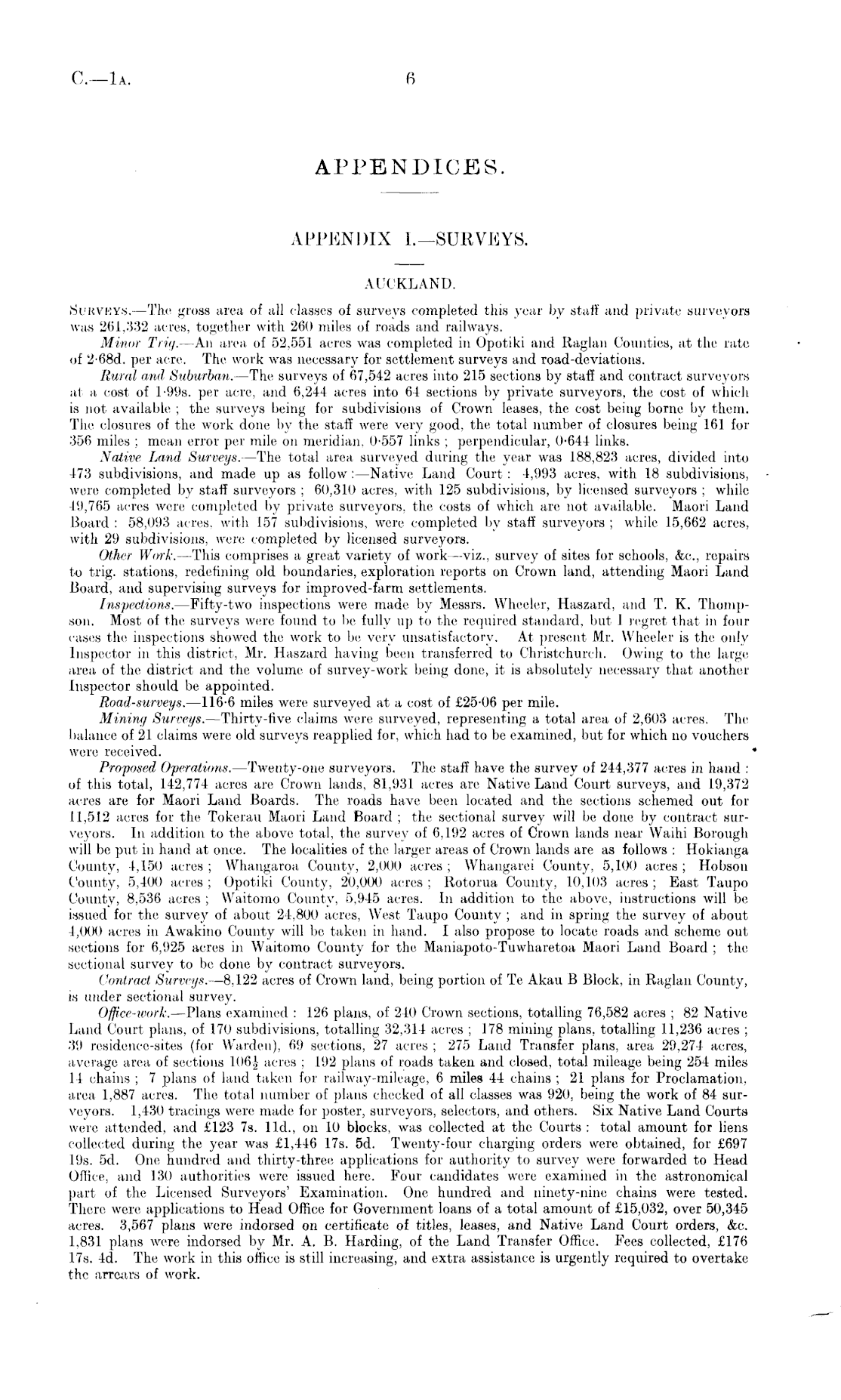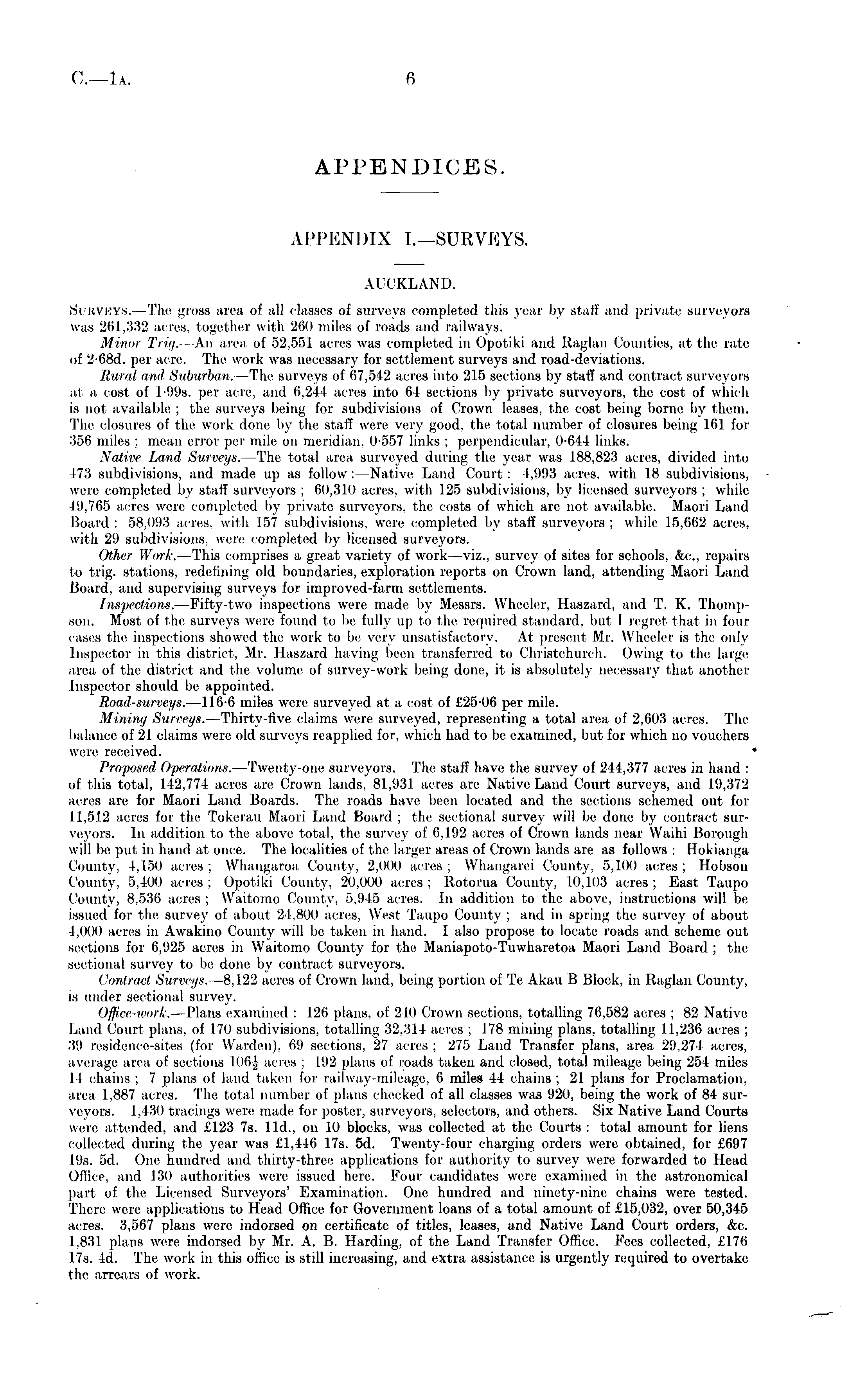 AUCKLAND. Si i:\kys.—The gross area of all classes of surveys completed this year by Staff and private surveyors was 261,332 acres, together with 260 miles of roads and railways. Miliar Trig. An area of 52,551 acres was completed ill Opotiki and Raglan Counties, at the rate of 2-68 d. per acre. The work was necessary for settlement surveys and road-deviations. Rural and Suburban. —The surveys of 67,542 acres into 215 sections by staff and contract surveyors at a cost of l'99s. per acre, and 6,244 acres into til sections by private surveyors, the cost of which is not available : the surveys being for subdivisions of Crown leases, the cost being borne by them. The closures of the work done by the staff were very good, the total number of closures being 161 for 356 miles : mean error per mile on meridian. 0-557 links ; perpendicular, 0-64 I links. Native Land Surveys. —The total area surveyed during the year was 188,823 acres, divided into 173 subdivisions, and made up as follow: —Native Land Court: 1,993 acres, with 18 subdivisions. weie completed by staff surveyors ; 60,310 acres, with 125 subdivisions, by licensed surveyors : while -19,765 acres were completed by private surveyors, the costs of which are not available. Maori Land Board: 58,093 acres, with 157 subdivisions, were completed by staff surveyors; while 15,662 acres, with 29 subdivisions, were completed by licensed surveyors. Other Work. —This comprises a great variety of work —viz., survey of sites for schools, &c, repairs to trig, stations, redefining old boundaries, exploration reports on Crown land, attending Maori Land Board, and supervising surveys for improved-farm settlements. Inspections. —Fifty-two inspections were made by Messrs. Wheeler, llaszard. and T. K. Thompson. Most of the surveys were found to be fully up to the required standard, but I regret that in four cases the inspections showed the work to be very unsatisfactory. At present Mr. Wheeler is the only Inspector in this district, Mr. llaszard having been transferred to Christchurch. Owing to the large area of the district and the volume of survey-work being done, it is absolutely accessary that another Inspector should be appointed. Road-surveys. —ll6-6 miles were surveyed at a cost of £25-06 per mile. Minim/ Surveys. Thirty-five claims were surveyed, representing a total area of 2,603 acres. The balance of 21 claims were old surveys reapplied for, which had to be examined, but for which no vouchers were received. Proposed Operations. —Twenty-one surveyors. The staff have the survey of 244,377 acres in hand : of this total, 142,774 acres are Crown lands, 81,931 acres are Native Land Court surveys, and 19,372 acres are for Maori Land Boards. The roads have been located and the sections schemed out for 11,512 acres for the Tokerau Maori Land Board ; the sectional survey will be done by contract surveyors. In addition to the above total, the survey of 6,192 acres of Crown lands near Waihi Borough will be put in hand at once. The localities of the larger areas of Crown lands are as follows : Hokianga County. 4,150 acres: Whangaroa County, 2,000 acres; Whangaiei County, 5,100 acres; Hobson County. 5.100 acres; Opotiki County, 20,000 acres; llotorua County, 10,103 acres; East Taupo County, 8,536 acres ; Waitomo County, 5,945 acres. In addition to the above, instructions will be issued for the survey of about 21.800 acres, West Taupo County; and in spring the survey of about 4,000 acres in Awakino County will be taken in hand. I also propose to locate roads and scheme out sections for 6,925 acres in Waitomo County for the Maniapoto-Tuwharetoa Maori Land Board; the sectional survey to be done by contract surveyors. <'milrail Surveys. -8.122 acres of Crown land, being portion of Te Akau B Block, in Raglan County, is under sectional survey. Office-work. -Plans examined : 126 plans, of 240 Crown sections, totalling 76,582 acres ; 82 Native Land Court plans, of 170 subdivisions, totalling 32,314 acres ; 178 mining plans, totalling 11,236 acres : 39 residence-sites (for Warden). (19 sections. 27 acres ; 275 Land Transfer plans, area 29,27-1 acres, average area of sections 106J aen-s : 192 plans of roads taken and closed, total mileage being 254 miles I I chains ; 7 plans of land taken for railway-mileage. 6 miles 44 chains ; 21 plans for Proclamation, area 1,887 acres. The total number of plans checked of all classes was 920, being the work of 84 surveyors. 1,-130 tracings were made for poster, surveyors, selectors, and others. Six Native Land Courts were attended, and £123 7s. lid., on 10 blocks, was collected at the Courts : total amount for liens collected during the year was £1,446 17s. sd. Twenty-four charging orders were obtained, for £697 19s. sd. One hundred and thirty-three applications for authority to survey were forwarded to Head Office, and 130 authorities were issued here. Four candidates were examined in the astronomical part of the Licensed Surveyors' Examination. One hundred and ninety-nine chains were tested. There were applications to Head Office for Government loans of a total amount of £15,032, over 50,345 acres. 3,567 plans were indorsed on certificate of titles, leases, and Native Land Court orders, &c. 1,831 plans were indorsed by Mr. A. B. Harding, of the Land Transfer Office. Fees collected, £176 17s. 4d. The work in this office is still increasing, and extra assistance is urgently required to overtake the arrears of work.