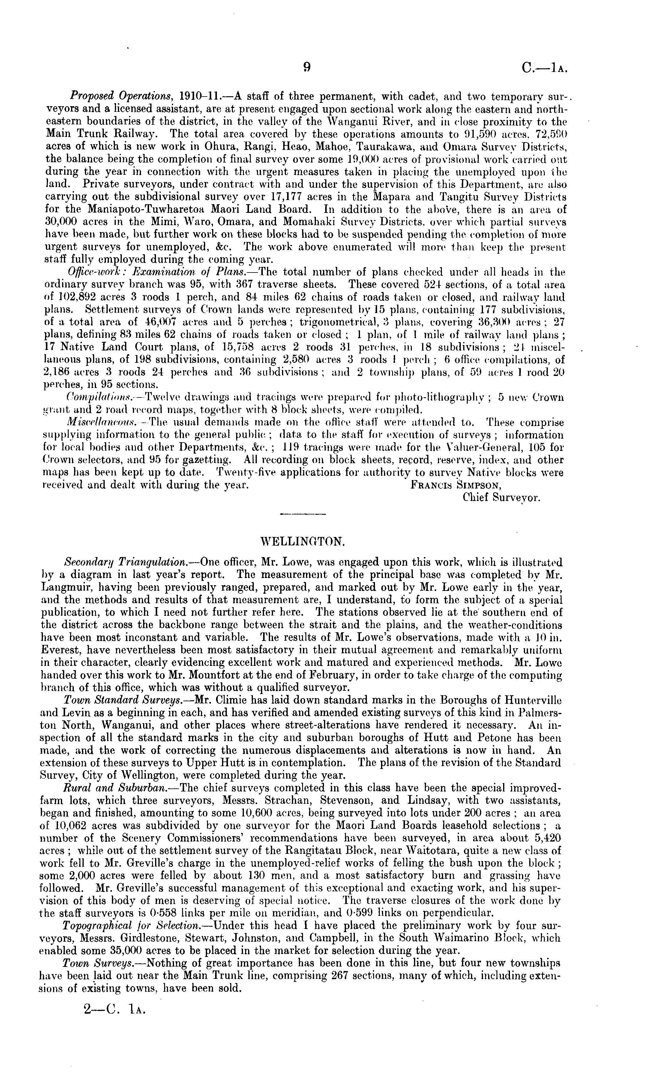 Proposed Operations, 1910-11.—A staff of three permanent, with cadet, and two temporary surveyors and a licensed assistant, are at present engaged upon sectional work along the eastern and northeastern boundaries of the district, in the valley of the Wanganui River, and in close proximity to the Main Trunk Railway. The total area covered by these operations amounts to 91.590 acres. 72,590 acres of which is new work in Ohura, Rangi, Heao, Mahoe, Taurakawa, and Omara Survey Districts, the balance being the completion of final survey over some 19,000 acres of provisional work carried out during the year in connection with the urgent measures taken in placing the unemployed upon the land. Private surveyors, under contract with and under the supervision of this Department, are also carrying out the subdivisional survey over 17,177 acres in the Mapara and Tangitu Survey Dist rids for the Maniapoto-Tuwharetoa Maori Land Board. In addition to the aboVe, there is an area of 30,000 acres in the Mimi, Waro, Omara, and Momahaki Survey Districts, over which partial sin have been made, but further work on these blocks had to be suspended pending the completion of more urgent surveys for unemployed, &c. The work above enumerated will more than keep the pre Staff fully employed during the coming year. Office-work: Examination of Plans. —The total number of plans checked under all heads in the ordinary survey branch was 95. with 367 traverse sheets. These covered 521 sections, of a total area of 102.892 acres 3 roods 1 perch, and 81 miles 62 chains of roads taken or closed, and railway land plans. Settlement surveys of Crown lands were represented by 15 plans, containing 177 subdivisions, of a tolal area, of 46,007 acres and 5 perches; trigonometrical, 3 plans, covering 36,300 acres; 27 plans, defining 83 miles 62 chains of roads taken or closed ; 1 plan, id' 1 mile of railway land plans ; 17 Native Land Court plans, of 15.758 acres 2 roods 31 perches, in 18 subdivisions: 2! mi laneoiis plans, of 198 subdivisions, containing 2.580 acres 3 roods I perch; 6 office compilations, of 2,186 acres 3 roods 21 perches and. 36 subdivisions: and 2 township plans, of 59 acres I rood 20 perches, in 95 sections. Compilations. Twelve drawings and tracings were prepared for photo-lithography ; 5 new Crown grant and 2 road record maps, together wiih 8 block sin els. were compiled. Miscellaneous. The usual demands made on the office stall' were attended to. These comprise supplying inform,it ion to the general public ; data to the staff I'm- execution of surveys : information for local bodies and oilier Departments, Ac. ; 119 tracings were made for Ihe Valuer Ceneiul. 105 for Crown selectors, and 95 for gazetting, All recording on block sheer, record reserve, index, and other is has been kepi up io dale. Tweniv live applications for authority to sui'vev Native blocks were received and dealt with during the year. Francis Simpson, Chief Surveyor.