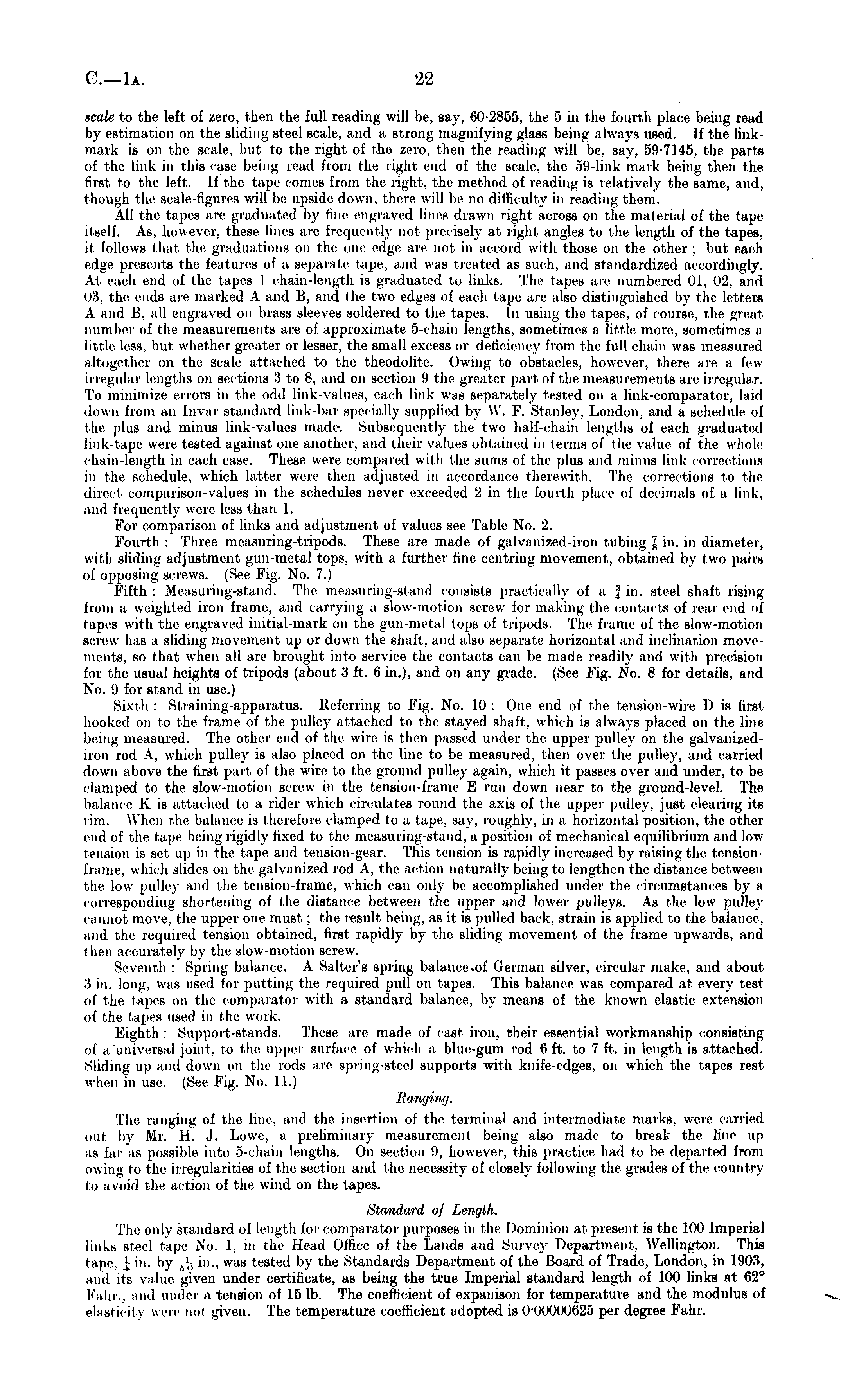 scale to the left of zero, then the full reading will be, say, 60-2855, the 5 in the fourth place being read by estimation on the sliding steel scale, and asi rung magnifying glass being always used. If the linkmark is on the scale, but to the right of the zero, then the reading will be. say. 59-7145, the parts of the link in this case being read from the right end of the scale, the 59-link mark being then the first to the left. If the tape comes from the right, the method of reading is relatively the same, and though the scale-figures will be upside down, there will be no difficulty in reading them. All the tapes are graduated by line engraved lines drawn right across on the material of the tape itself. As. however, these lines are frequently not precisely at right angles to the length of the tapes, it follows that the graduations on the ot dge are not in accord with those on the other ; but each edge presents the features of a separate tape, and was treated as such, and standardized accordingly. At each end of the tapes I chain-length is graduated to links. The tapes are numbered 01, 02, and 03, the ends are marked A and B, and the two edges of each tape are also distinguished by the letters A and B, all engraved on brass sleeves soldered to the tapes. In using the tapes, of course, the great number of the measurements are of approximate 5-chain lengths, sometimes a little more, sometimes a little less, but whether greater or lesser, the small excess or deficiency from the full chain was measured altogether on the scale attached to the theodolite. Owing to obstacles, however, there ate a few ii regular lengths on sections 3 to 8, and on section ( .) the greater part of the measurements are irregular. To minimize errors in the odd link-values, each link was separately tested on a link-comparator, laid down from an Invar standard link-bar specially supplied by W. F. Stanley, London, and a schedule of tic plus and minus link-values made. Subsequently the two half-chain lengths of each graduated link-tape were tested against one another, and their values obtained in terms of the value of the whole chain length in each case. These were compared with the sums of the plus and minus link corrections in the schedule, which latter were then adjusted in accordance therewith. The corrections to the direct comparison-values in the schedules never exceeded 2 in the fourth place of decimals of a link, and frequently were less than 1. For comparison of links and adjustment of values see Table No. 2. Fourth: Three measuring-tripods. These are made of galvanized-iron tubing \ in. in diameter, with sliding adjustment gun-metal tops, with a further line centring movement, obtained by two pairs of opposing screws. (See Fig. No. 7.) Fifth : Measuring-stand. The measuring-stand consists practically of a ; ,' in. steel shaft rising from a weighted iron frame, and carrying a slow-motion screw for making the contacts of rear end of tapes with the engraved initial-mark on the gun-metal tops of tripods. The frame of the slow-motion screw has a sliding movement up or down the shaft, and also separate horizontal and inclination movements, so that when all are brought into service the contacts can be made readily and with precision for the usual heights of tripods (about 3 ft. 6 in.), and on any grade. (See Fig. No. 8 for details, and No. 9 for stand in use.) Sixth : Straining-apparatus. Referring to Fig. No. 10: One end of the tension-wire Dis first hooked on to the frame of the pulley attached to the stayed shaft, which is always placed on the line being measured. The other end of the wire is then passed under the upper pulley on the galvanizediron rod A, which pulley is also placed on the line to be measured, then over the pulley, and carried down above the first part of the wire to the ground pulley again, which it passes over and under, to be clamped to the slow-motion screw in the tension-frame E run down near to the ground-level. The balance X is attached to a rider which circulates round the axis of the upper pulley, just clearing its rim. When the balance is therefore clamped to a tape, say, roughly, in a horizontal position, the other end of the tape being rigidly fixed to the measuring-stand, a position of mechanical equilibrium and low tension is set up in the tape and tension-gear. This tension is rapidly increased by raising the tensionframe, which slides on the galvanized rod A, the action naturally being to lengthen the distance between the low pulley and the tension frame, which can only be accomplished under the circumstances by a corresponding shortening of the distance between the upper and lower pulleys. As the low pulley cannot move, the upper one must ; the result being, as it is pulled back, strain is applied to the balance, and the required tension obtained, first rapidly by the sliding movement of the frame upwards, and then accurately by the slow-motion screw. Seventh : Spring balance. A Salter's spring balance.of German silver, circular make, and about :! in. long, was used for pulling the required pull on tapes. This balance was compared at every test of the tapes on the comparator with a standard balance, by means of the known elastic extension of I he tapes used in t he work. Eighth : Support-stands. These are made of cast iron, their essential workmanship consisting of a'universal joint, to the upper surface of which a blue-gum rod 6 ft. to 7 ft. in length is attached. Sliding up and down on the rods are .spring-steel supports with knife-edges, on which the tapes rest when in use. (See Fig. No. 1 I.) Hanging. The ranging of the line, and the insertion of the terminal and intermediate marks, were carried otil by Mr. H. .J. Lowe, a preliminary measurement being also made to break the line up as far as possible into 5-chain lengths. On section il. however, this practice had to be departed from owing to the irregularities of the section ami the necessity of closely following the grades of
