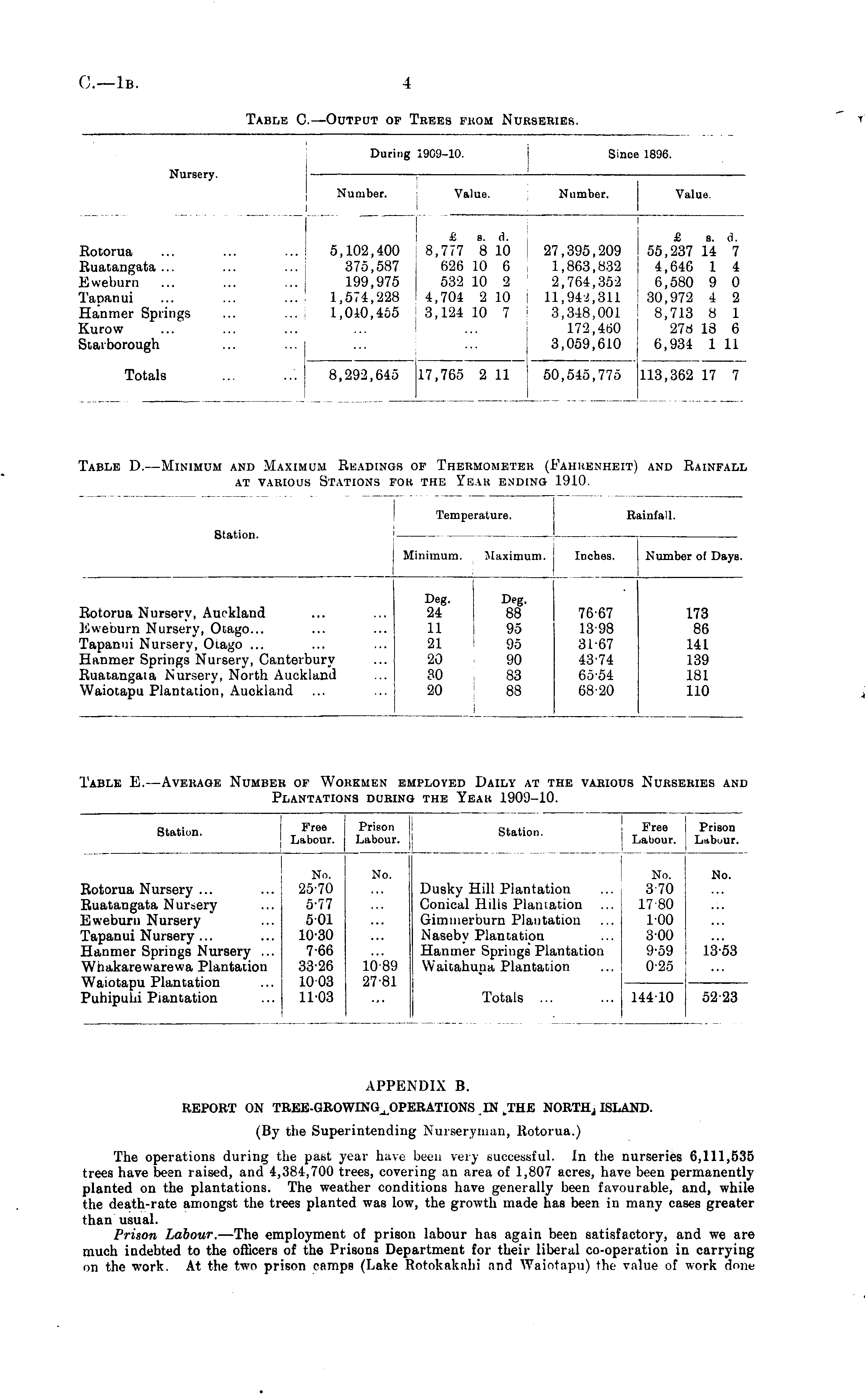 Station. Temperature. Rainfall. Minimum. Maximum. Inches. Number of Days. Rotorua Nursery, Auckland Eweburn Nursery, Otago... Tapanui Nursery, Otago ... Hanmer Springs Nursery, Canterbury Ruatangaia Nursery, North Auckland Waiotapu Plantation, Auckland Deg. 24 11 21 20 30 20 Deg. 88 95 95 90 83 88 76-67 13-98 31-67 43-74 65-54 68-20 173 86 141 139 181 110