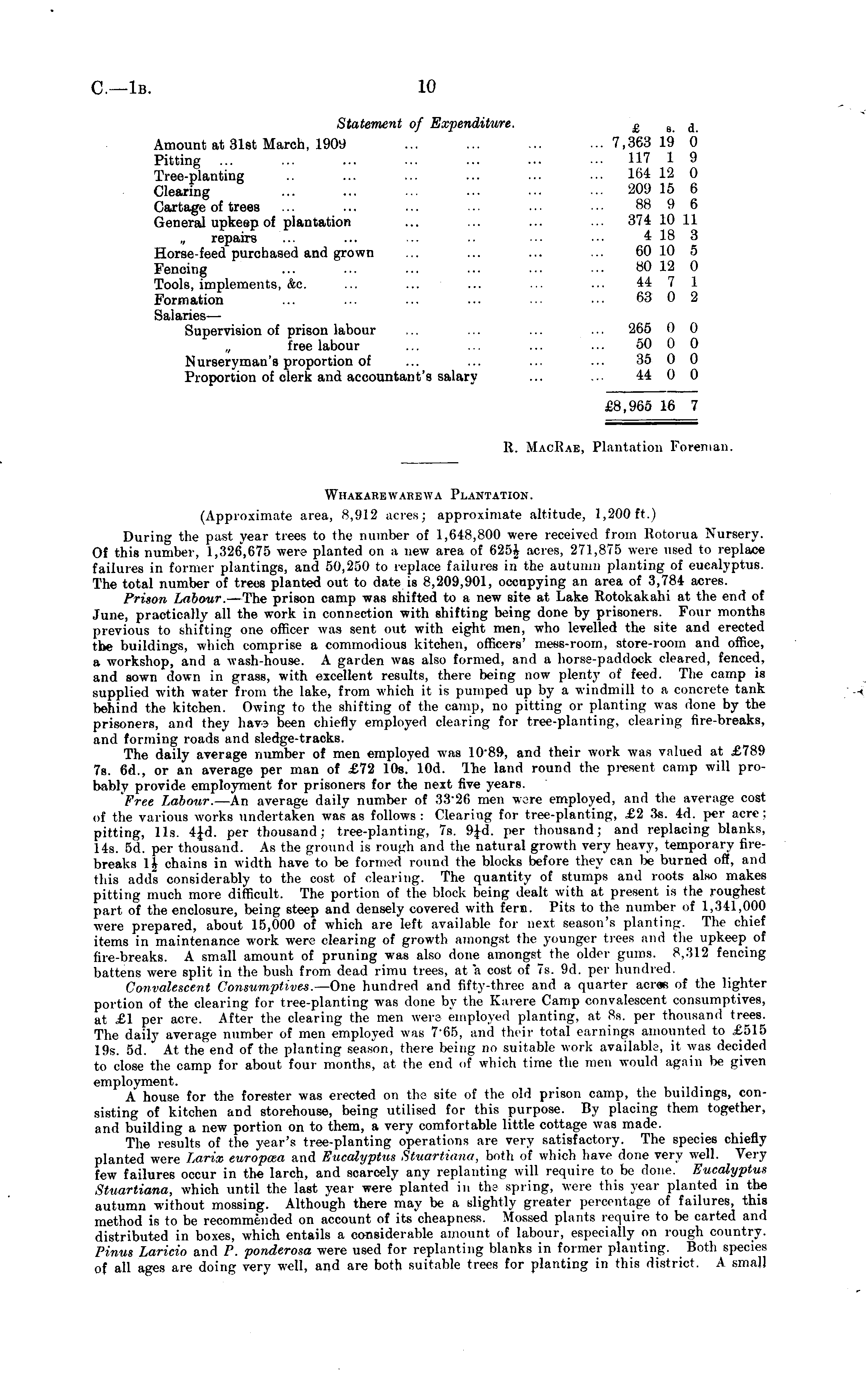 Statement of Expenditure. & t d Amount at 31st March, 1909 ... ... ... ...7,363 19 0 Pitting 117 1 9 Tree-planting .. ... ... ... ... ••• 164 12 0 Clearing 209 15 6 Cartage of trees ... ... ... ... •••• • • 88 9 6 General upkeep of plantation ... ... ... ... 374 10 11 „ repairs ... ... ... .. ■■■ ••• 418 3 Horse-feed purchased and grown ... ... ... ... 60 10 5 Fencing 80 12 0 Tools, implements, &c. ... ... ... ... ... 44 7 1 Formation ... ... ... ... ... ... 63 0 2 Salaries— Supervision of prison labour ... ... ... ... 265 0 0 free labour ... ... ... ... 50 0 0 Nurseryman's proportion of ... ... ... ... 35 0 0 Proportion of clerk and accountant's salary ... ... 44 0 0 £8,965 16 7 R. Maoßab, Plantation Foreman.