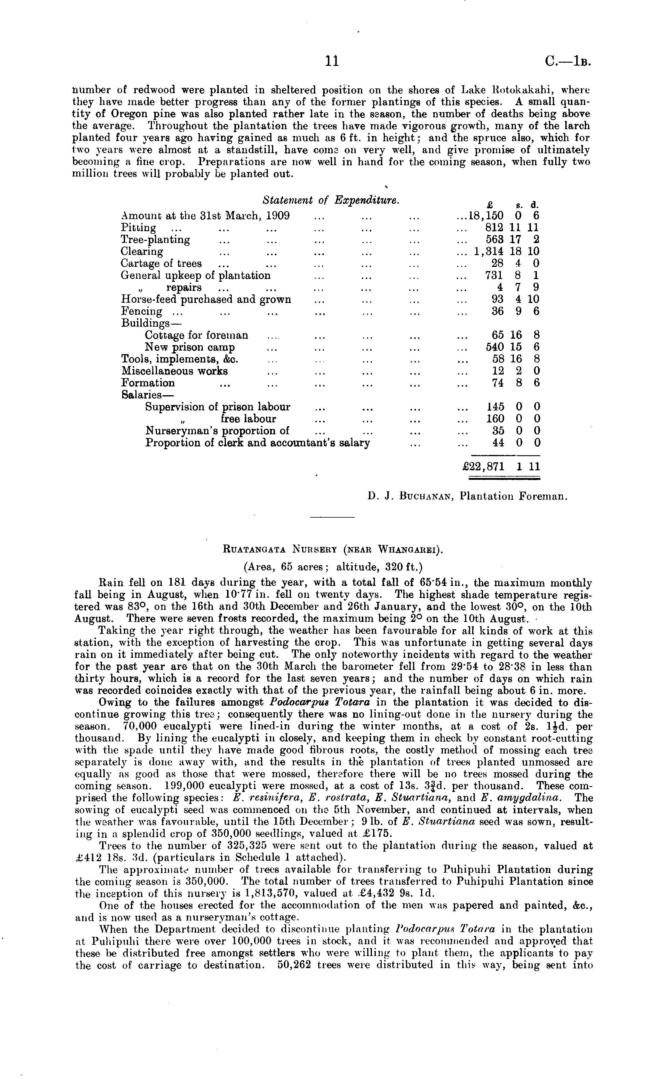 number of redwood were planted in sheltered position on the shores of Lake Rotdkakahi, where they have made better progress than any of the former plantings of this species. A small quantity of Oregon pine was also planted rather late in the season, the number of deaths being above the average. Throughout the plantation the trees have made vigorous growth, many of the larch planted four years ago having gained as much as 6ft. in height; and the spruce also, which for two years were almost at a standstill, have coins on very well, and give promise of ultimately becoming a line crap. Preparations are now well in hand for the coming season, when fully two million trees will probably be planted out. Statement of Expenditure. £ s d Amount at the 31st March, 1909 ... ... ... ...18,150 0 6 Pitting ... ... ... ... ... ... ... 812 11 11 Tree-planting ... ... ... ... ... ... 563 17 2 Clearing ... ... ... ... ... ... 1,314 18 10 Cartage of trees ... ... ... ... ... ... 28 4 0 General upkeep of plantation ... ... ... ... 731 8 1 „ repairs ... ... ... ... ... ... 479 Horse-feed purchased and grown ... ... ... ... 93 4 10 Fencing ... ... ... ... ... ... ... 36 9 6 Buildings— Cottage for foreman .... ... ... ... ... 65 16 8 New prison camp ... ... ... ... ... 540 15 6 Tools, implements, &c. ... ... ... ... ... 58 16 8 Miscellaneous works ... ... ... ... ... 12 2 0 Formation ... ... ... ... ... ... 74 8 6 Salaries—• Supervision of prison labour ... ... ... ... 145 0 0 free labour ... ... ... ... 160 0 0 Nurseryman's proportion of ... ... ... ... 35 0 0 Proportion of clerk and accountant's salary ... ... 44 0 0 £22,871 1 11 D. J. Buchanan, Plantation Foreman.