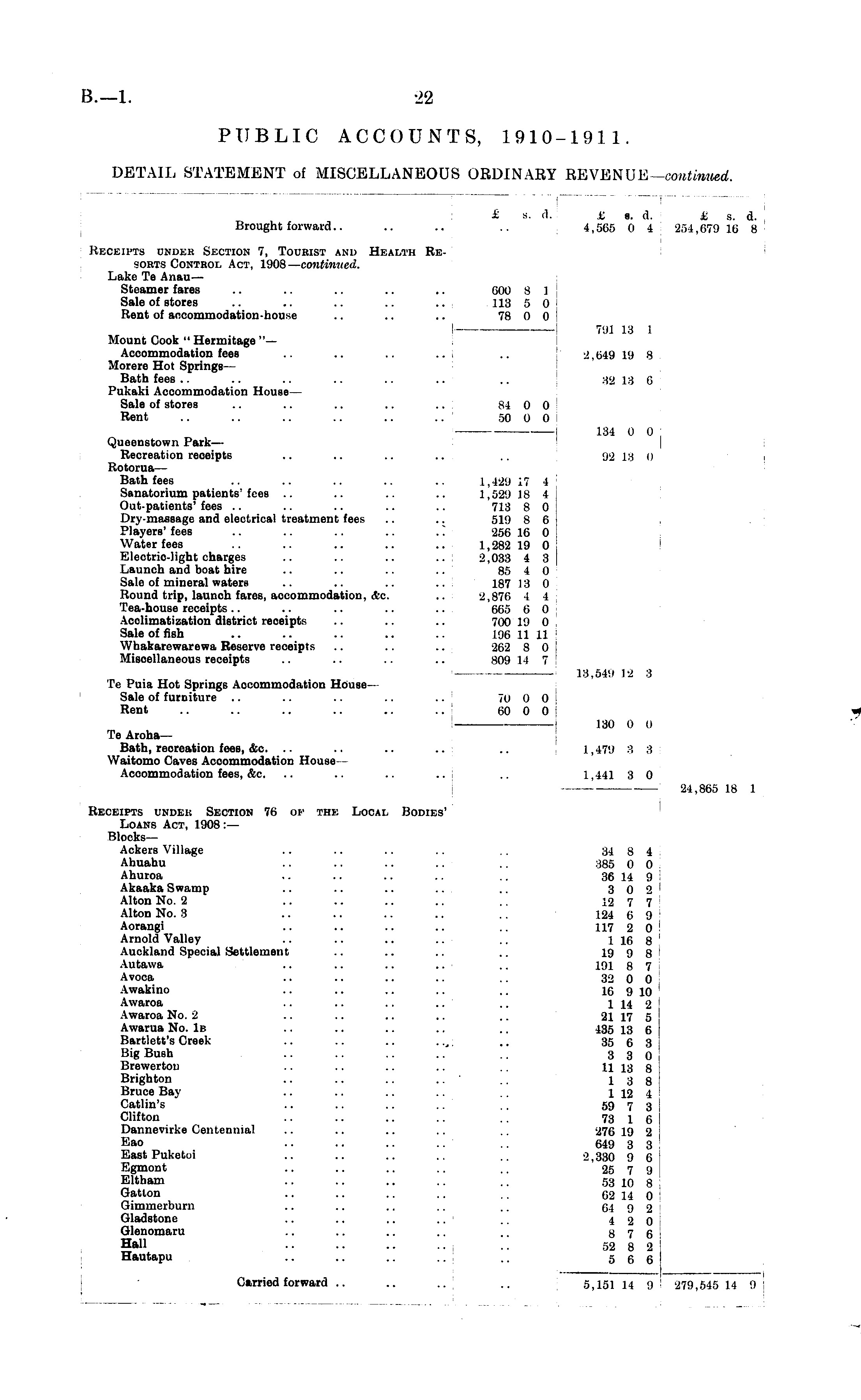 I i I £ s. d. Brought forward.. £ s. d. £ s. d. 4,565 0 4 254,679 16 8 tECElPTS UNDER SECTION 7, TOURIST AND HEALTH RESORTS Control Act, 1908— continued. Lake Te Anau— Steamer fares .. .. .. .. .. 600 8 1 Sale of stores .. .. .. .. .. 113 5 o Rent of accommodation-house .. .. .. 78 0 0 Mount Cook " Hermitage "— Accommodation fees Morere Hot Springs— Bath fees Pukaki Accommodation House— Sale of stores .. .. .. .. .. 84 0 0 Rent .. .. .. .. .. .. 50 0 0 T'.ll 13 I 2.649 19 8 32 13 6 Queenstown Park— Recreation reoeipts Rotorua— Bath fees .. .. .. .. .. 1,429 17 4 Sanatorium patients'fees .. .. .. .. 1,529 IS i Out-patients' fees .. .. .. .. .. 713 8 0 Dry-massage and electrical treatment fees .. .. 519 8 6 Players' fees .. .. .. .. .. 256 16 0 Water fees .. .. .. .. .. 1,282 19 0 Electric-light charges .. .. .. .. 2,033 4 3 Launch and boat hire .. .. .. 85 4 0 Sale of mineral waters .. .. .. 187 13 0 Round trip, launch fares, accommodation, Ac. .. 2,870 1 1 Tea-house receipts .. .. .. .. .. 665 6 0 Acclimatization district receipts .. .. .. 700 19 0 Sale of fish .. .. .. .. 196 11 11 Whakarewarewa Reserve receipts .. .. .. 262 8 0 Miscellaneous receipts .. .. .. .. 809 14 7 134 0 0 ; 92 13 0 Te Puia Hot Springs Accommodation House— Sale of furniture .. .. .. 70 0 0 Rent .. .. .. .. .. .. 60 0 0 Te Aroha— Bath, reoreation fees, &c. Waitomo Caves Accommodation House— Accommodation fees, &c. 13,549 12 3 130 0 0 1,479 3 3 1,441 3 0 24,865 18 1 1bceipts under section 76 op the local bodies' Loans Act, 1908:— Blocks— Ackers Village Ahuahu Ahuroa Akaaka Swamp Alton No. 2 Alton No. 3 Aorangi Arnold Valley Auckland Special Settlement Autawa .. .. .. Avoca Awakino Awaroa Awaroa No. 2 Awarua No. 1b Bartlett's Creek Big Bush Brewertou Brighton .. .. .. .. Bruce Bay Catlin's Clifton Dannevirke Centennial Eao East Puketoi Egmont Eltham Gatton Gimmerburn Gladstone Glenomaru Hall Hautapu 34 8 4 385 0 0 : 36 14 9 3 0 2 12 7 7 124 6 9 117 2 0 ! 1 16 8 19 9 8 j 191 8 7 i 32 0 0 | 16 9 10 ' 1 14 2 21 17 5 435 13 6 35 6 3 3 3 0 U 13 8 13 8 1 12 4 59 7 3 73 1 6 276 19 2 649 3 3 2,330 9 6 25 7 9 53 10 8 ; 62 14 0 ' 64 9 2 4 2 0 8 7 6 52 8 2 5 6 6 Carried forward .. 5,151 14 9 279,545 14 9