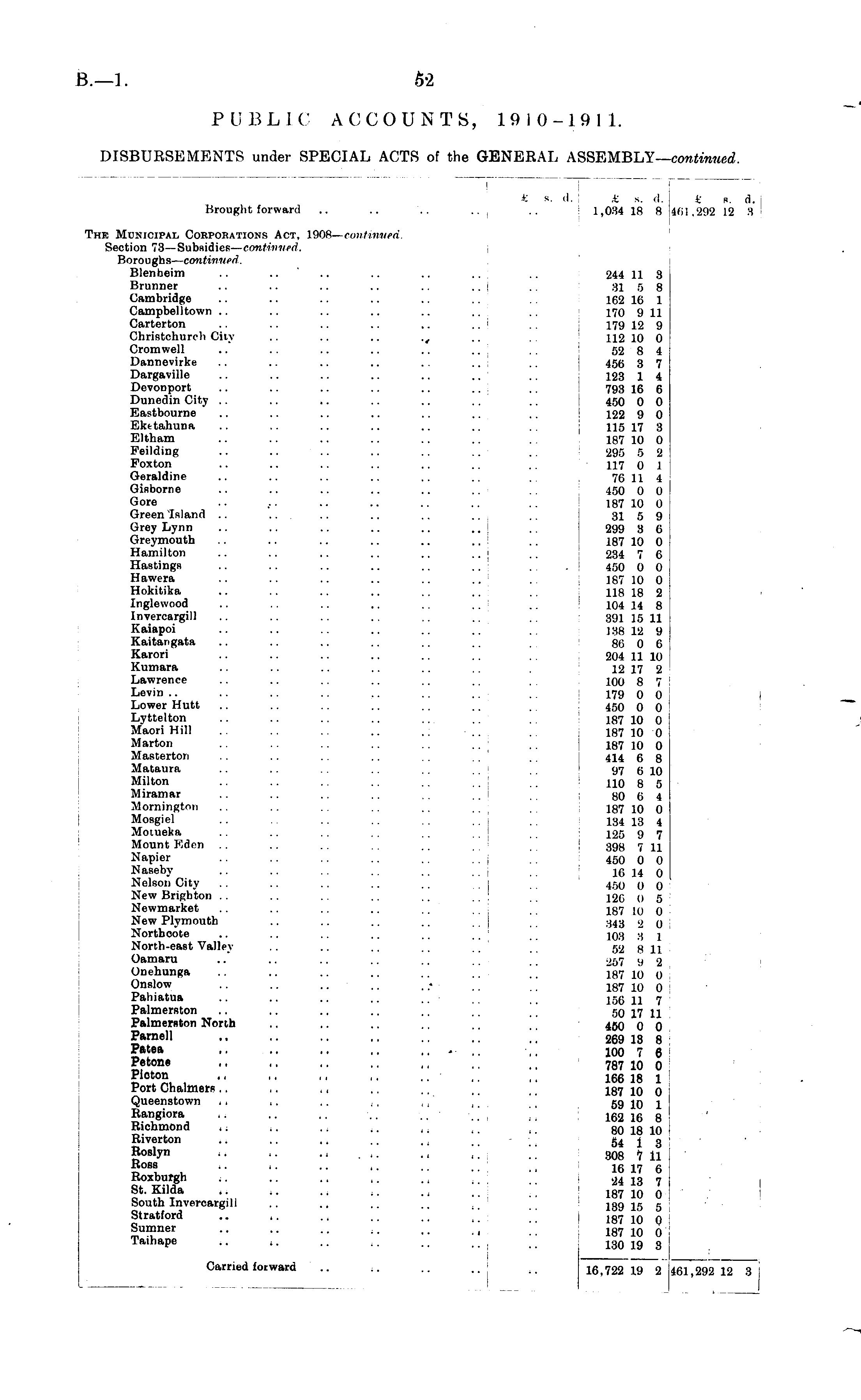 I Brought forward ■ ■ t st. d. t r. d. 1,034 18 8 i: n. d, 461,292 12 8 'he Municipal Corporations Act, 1908—continued Section 73—Subsidies — continued. Boroughs— continued. Blenheim Brunner Cambridge Campbell town Carterton Christchurrli Citv Cromwell Dannevirke Dargaville DevoDport Dunedin City Eastbourne Ekttahuna Eltham Feilding Foxton Geraldinp Gisborne Gore Green Island .. .. Grey Lynn Greymouth Hamilton Hastings Hawera Hokitika Inglewood Invercargill Kaiapoi Kaitangata Karori Kumara Lawrence Levin Lower Hutt Lyttelton Maori Hill Martoi! Masterton Mataura Milton Miramar Morningtnn MoRgiel Moiueka Mount Eden Napier N aseby Nelson City New Brighton Newmarket New Plymouth Northoote North-east Valley Oamaru Unebunga Onslow Fahiatua PalmerRton PalmerRton North Parnell Patea Pefcone Ploton ,, ,. ,, Port Chalmers .. Queenstown .. ,. ,. ,, Eangiora Richmond ,, >. Riverton Roslyn i. .. ., Ross .. ,. Roxburgh .. .. ., , St. Kilda South Invereargill Stratford Sumner .. .. ,, ,, Taihape .. ,. Carried forward •v :: ■■ ;: 244 11 8 31 5 8 162 16 1 170 9 11 179 12 9 112 10 0 52 8 4 456 3 7 123 1 4 793 16 6 450 0 0 122 9 0 115 17 3 187 10 0 295 5 2 117 0 1 76 11 4 450 0 0 187 10 0 31 5 9 299 8 0 187 10 0 234 7 6 450 0 0 187 10 0 118 18 2 104 14 8 391 15 11 188 12 9 86 0 C 204 11 10 12 17 2 100 8 7 179 0 0 450 0 0 187 10 0 187 10 0 187 10 0 414 6 8 97 6 10 110 8 5 80 0 4 187 10 0 134 13 4 125 9 7 398 7 11 450 0 0 16 14 0 450 0 0 126 0 5 187 10 0 348 2 0 103 3 1 52 8 11 267 9 2 187 10 0 187 10 0 156 11 7 50 17 11 450 0 0 269 18 8 100 7 6 787 10 0 166 18 1 187 10 0 59 10 1 162 16 8 80 18 10 54 1 3 308 7 11 16 17 6 24 13 7 187 10 0 189 15 5 187 10 0 187 10 0 130 19 3 16,722 19 2 461,292 12 3