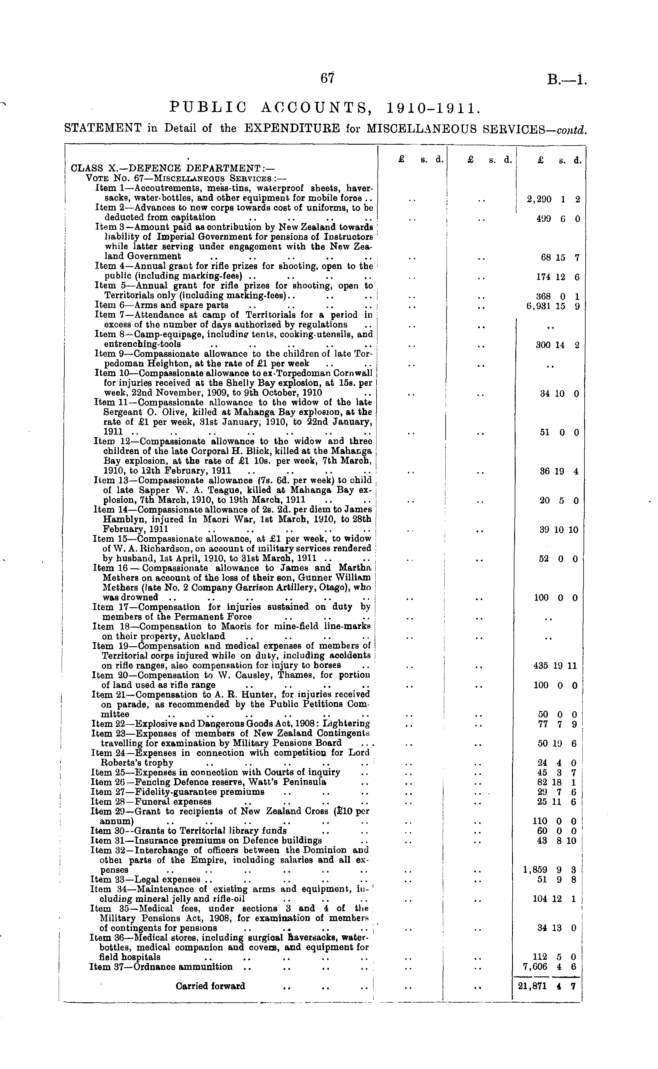 CLASS X.—DEFENCE DEPARTMENT:— Vote No. 67—Miscellaneous Services :— Item 1—Accoutrements, mess-tins, waterproof sheets, haversacks, water-bottles, and other equipment for mobile force .. Item 2—Advances to new corps towards cost of uniforms, to be i deducted from capitation .. .. .. .. I Item 3—Amount paid as contribution by New Zealand towards liability of Imperial Government for pensions of Instructors while latter serving under engagement with the New Zealand Government Item 4—Annual grant for rifle prizes for shooting, open to the public (including marking-fees) .. Item 5—Annual grant for rifle prizes for shooting, open to Territorials only (including marking-fees) Item 6 —Arms and spare parts Item 7 —Attendance at camp of Territorials for a period in excess of the number of days authorized by regulations Item 8—Camp-equipage, including tents, cooking-utensils, and entrenching-tools Item 9—Compassionate allowance to the children of late Torpedoman Heigliton, at the rate of £1 per week .. Item 10—Compassionate allowance toex-Torpedoman Cornwall for injuries received at the Shelly Bay explosion, at 15s. per week, 22nd November, 1909, to 9th October, 1910 Item 11—Compassionate allowance to the widow of the late Sergeant O. Olive, killed at Mahanga Bay explosion, at the rate of £1 per week, 31st January, 1910, to 22nd January, 1911 .. Item 12—Compassionate allowance to tho widow and three children of the late Corporal H. Blick, killed at the Mahar.ga Bay explosion, at the rate of £1 10s. per week, 7th March, 1910, to 12th February, 1911 Item 13 —Compassionate allowance (7s. Gd. per week) to child of late Sapper W. A. Teague, killed at Mahanga Bay explosion, 7th March, 1910, to 19th March, 1911 Item 14—Compassionate allowance of 2s. 2d. per diem to James Hamblyn, injured in Maori War, 1st March, 1910, to 28th February, 1911 Item 15—Compassionate allowance, at £1 per week, to widow of W. A. Richardson, on account of military services rendered by husband, 1st April, 1910, to 31st Maroh, 1911 Item 16 — Compassionate allowance to James and Martha Methers on account of the loss of their eon, Gunner William Mothers (late No. 2 Company Garrison Artillery, Otago), who was drowned Item 17—Compensation for injuries sustained on duty by members of the Permanent Force Item 18—Compensation to Maoris for mine-field line-marks on their property, Auckland .. .. .. Item 19 —Compensation and medical expenses of members of ! Territorial corps injured while on duty, including acoidents on rifle ranges, also compensation for injury to horses Itom 20—Compensation to W. Causley, Thames, for portion of land used as rifle range Itom 21—Compensation to A. R. Hunter, for injuries received on parade, as recommended by the Public Petitions Committee Item 22 —Explosive and Dangerous Goods Act, 1908: Lightering Item 23 —Expenses of members of New Zealand Contingents travelling for examination by Military Pensions Board Item 24—Expenses in connection with competition for Lord Roberta's trophy Item 25—Expenses in connection with Courts of inquiry Item 26—Fencing Defenco reserve, Watt's Peninsula Item 27 —Fidelity-guarantee premiums Item 28—Funeral expenses Item 29—Grant to recipients of New Zealand Cross (£10 per annum) Item 30—Grants to Territorial library funds Item 31 —Insurance premiums on Defence buildings Item 32—Interchange of officers between the Dominion and othei parts of the Empire, including salaries and all expenses Item 33 —Legal expenses Item 34 —Maintenance of existing arms and equipment, iuoluding mineral jolly and rifle-oil Item 35 —Medical fees, under sections 3 and 4 of the Military Pensions Act, 1908, for examination of members of contingents for pensions .. .. .. Item 36—Medical stores, including surgical haversacks, waterbottles, medical companion and covers, and equipment for field hospitals Item 37 —Ordnance ammunition £ > s. d. £ S s. d. £ s. d. 2,290 1 2 4'J'J 0 0 68 15 7 174 12 6 368 0 1 6,931 15 9 300 14 2 34 10 0 51 0 0 36 19 4 20 5 0 39 10 10 52 0 0 100 0 0 435 19 11 100 0 0 50 0 0 77 7 9 50 19 6 24 4 0 45 3 7 82 18 1 29 7 6 25 11 6 110 0 0 60 0 0 43 8 10 1,859 9 3 51 9 8 104 12 1 34 13 0 112 5 0 7,606 i 6 Carried forward 21,871 4 7
