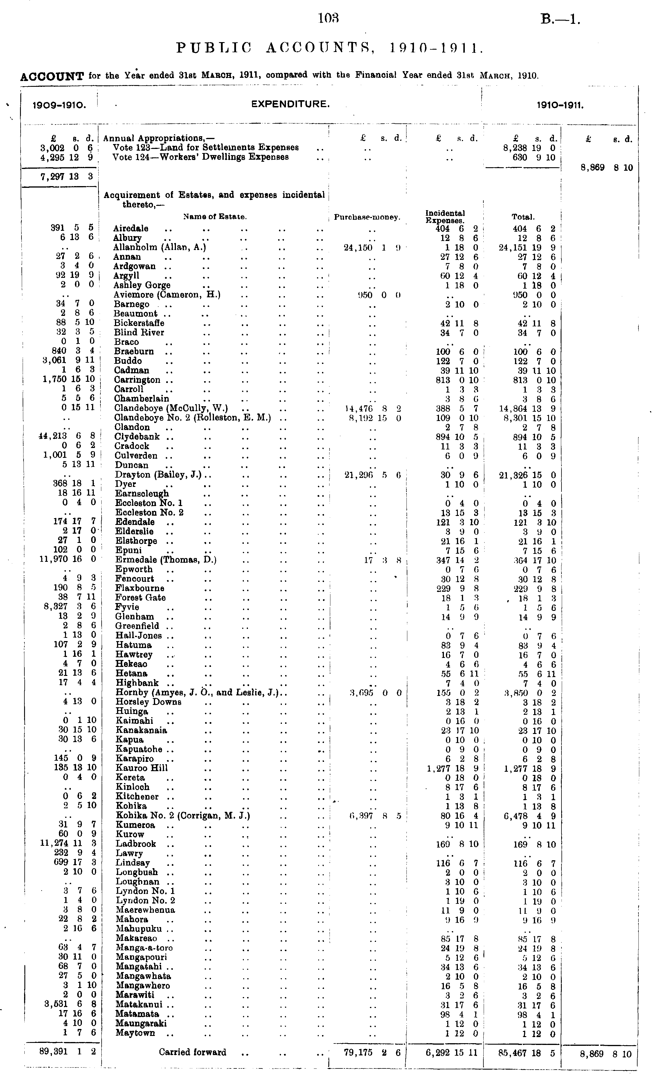 19O9-191O. • EXPENDITURE. 191O ■1911. £ 8. d. Annual Appropriations,— t s. d. 3,002 0 6 Vote 123—Land for Settlements Expenses 4,295 12 9 Vote 124—Workers'Dwellings Expenses 8 g. d. £ s. d. 8,238 19 0 630 9 10 £ s. d. 8,869 8 10 7,297 13 3 Acquirement of Estates, and expenses incidental thereto,— Name of Estate. Pnrohaae-money. 391 5 5 Airedale 6 13 6 Albury Allanholm (Allan, A.) . .. .. '24,150 1 <) 27 2 6 Annan 3 4 0 Ardgowan 92 19 9 Argyll 2 0 0 Ashley Gorge Aviemore (Cameron, H.) .. .. .. !)50 0 0 34 7 0 Barnego 2 8 6 Beaumont 88 5 10 Bickerstaffe 32 3 5 Blind River 0 10 Braco 840 3 4 Braeburn 3,061 9 11 Buddo 1 6 3 Cadman 1,750 15 10 Carrington .. 1 6 8 Carroll 5 5 G Chamberlain 0 15 11 Clandeboye (McCully, W.) .. .. .. 14,476 8 2 Clandeboye No. 2 (Rolleston, E. M.) .. .. 8,192 18 0 Clandon 44,213 G 8 ! Clydebank .. 0 6 2 Cradock 1,001 5 9 i Culverden .. 5 13 11 Duncan Drayton (Bailey, J.) .. .. .. .. 21,296 5 6 368 18 1 Dyer 18 16 11 Earnsoleugh 0 4 0 Ecoleston No. 1 Eccleston No. 2 174 17 7 Edendale .. '2 17 0 Elderslie .. 27 1 0 Elsthorpe .. 102 0 0 Epuni 11,970 16 0 Ermedale (Thomas, D.) .. .. .. L7 3 8 Epworth 4 9 S Pencourt .. .. .. .. .. 190 8 5 Plaxbourne 38 7 11 Forest Gate 8,327 3 6 Pyvie 13 2 9 Glenham .. 2 8 6 Greenfield .. 1 13 0 Hall-Jones .. 107 2 9 Hatuma 1 16 1 Hawtrey 4 7 0 Hekeao 21 13 6 Hetana 17 4 i Highbank .. Hornby (Amyes, J. t>., and Leslie, J.).. .. 8,695 0 0 4 13 0 j Horsley Downs Huinga 0 1 10 I Kaimahi 30 15 10 I Kanakanaia 30 13 6 Kapua Kapuatohe 145 0 9 ! Karapiro 135 13 10 Kauroo Hill 0 4 0 Kereta Kinlooh 0 6 2 Kitchener .. 2 S 10 Kobika .. .. .. .. .. Kohika No. 2 (Corrigan, M. J.) .. .. 6,897 8 S !1 9 7 Kumeroa .. 60 0 9 Kurow 11,274 11 3 Ladbrook .. 232 9 4 Lawry G99 17 3 Lindsay 2 10 0 Longbush Loughnan 3 7 6 Lyndon No. 1 14 0 Lyndon No. 2 '■': s 0 Maerewhenua •22 8 2 i Mahora .! L6 6 Wahupuku .. Makareao 03 4 7 Manga-a-toro 30 11 0 Mangapouri G8 7 0 Mangatahi 27 5 0 Mangawhata 3 1 10 Mangawhero 2 0 0 Marawiti .. 3,531 6 8 Matakanui.. 17 16 6 Matamata .. 4 10 0 Maungaraki 17 6 Maytown Incidental T . , Expenses. Iotal - 404 6 2 404 6 2 12 8 6 12 8 fi 1 18 0 24,151 19 9 27 12 6 27 12 6 7 8 0 7 8 0 60 12 4 60 12 4 1 18 0 1 18 0 950 0 0 2 10 0 2 10 0 42 11 8 42 11 8 34 7 0 34 7 0 100 6 0 100 6 0 122 7 0 122 7 0 39 11 10 39 11 10 813 0 10 813 0 10 13 8 13 3 3 8 6 8 8 6 388 5 7 14,864 13 9 109 0 10 8,301 15 10 2 7 8 2 7 8 894 10 8 894 10 5 11 3 3 I 11 3 3 (i 0 9 6 0 9 30 'J 6 21,326 18 0 1 10 () 1 10 0 0 4 0 0 4 0 13 15 3 18 15 8 121 8 10 121 3 10 8 9 0 8 i) 0 21 16 1 21 16 1 7 16 6 7 15 6 347 14 ■> 364 17 10 0 7 6 0 7 6 30 12 8 30 12 8 229 9 8 229 9 8 18 I 8 is 1 3 1 5 6 1 5 6 14 9 9 14 9 9 0 0 7 6 83 9 4 83 9 I 16 7 0 16 7 0 4 6 6 4 6 6 55 r> 11 r,r, 6 n 7 4 0 7 4 0 166 0 2 3,860 0 2 3 18 2 3 18 2 2 13 1 2 13 1 0 16 o 0 16 0 23 17 10 23 17 10 0 10 0 0 10 0 ODD 090 6 2 8 I 6 2 8 1,277 18 9 i 1,277 18 9 0 18 0 0 18 0 8 17 6 i 8 17 6 18 1 18 1 1 13 H 1 13 8 80 16 4 j 6,478 4 9 9 10 11 9 10 11 L69 8 10 j 169 8 10 116 6 7 116 6 7 2 0 (' -A 0 0 8 10 0 3 10 0 1 10 6 1 10 6 1 19 0 l 19 0 II 9 0 11 9 0 '.) Hi 9 9 16 9 85 17 8 86 17 8 24 19 8 : 34 19 8 5 12 6 ' B 12 6 34 13 6 34 13 6 2 10 0 2 10 0 16 5 8 16 5 8 3 2 6 3 2 6 31 17 6 81 17 6 98 4 1 98 4 1 1 12 0 1 12 0 1 12 0 I 1 12 0 89,391 1 2 Carried forward .. .. .. 79,175 2 6 89,391 1 2 79,175 2 6 6,292 15 11 85,467 18 5 6,292 15 11 85,467 18 5 8,869 8 10