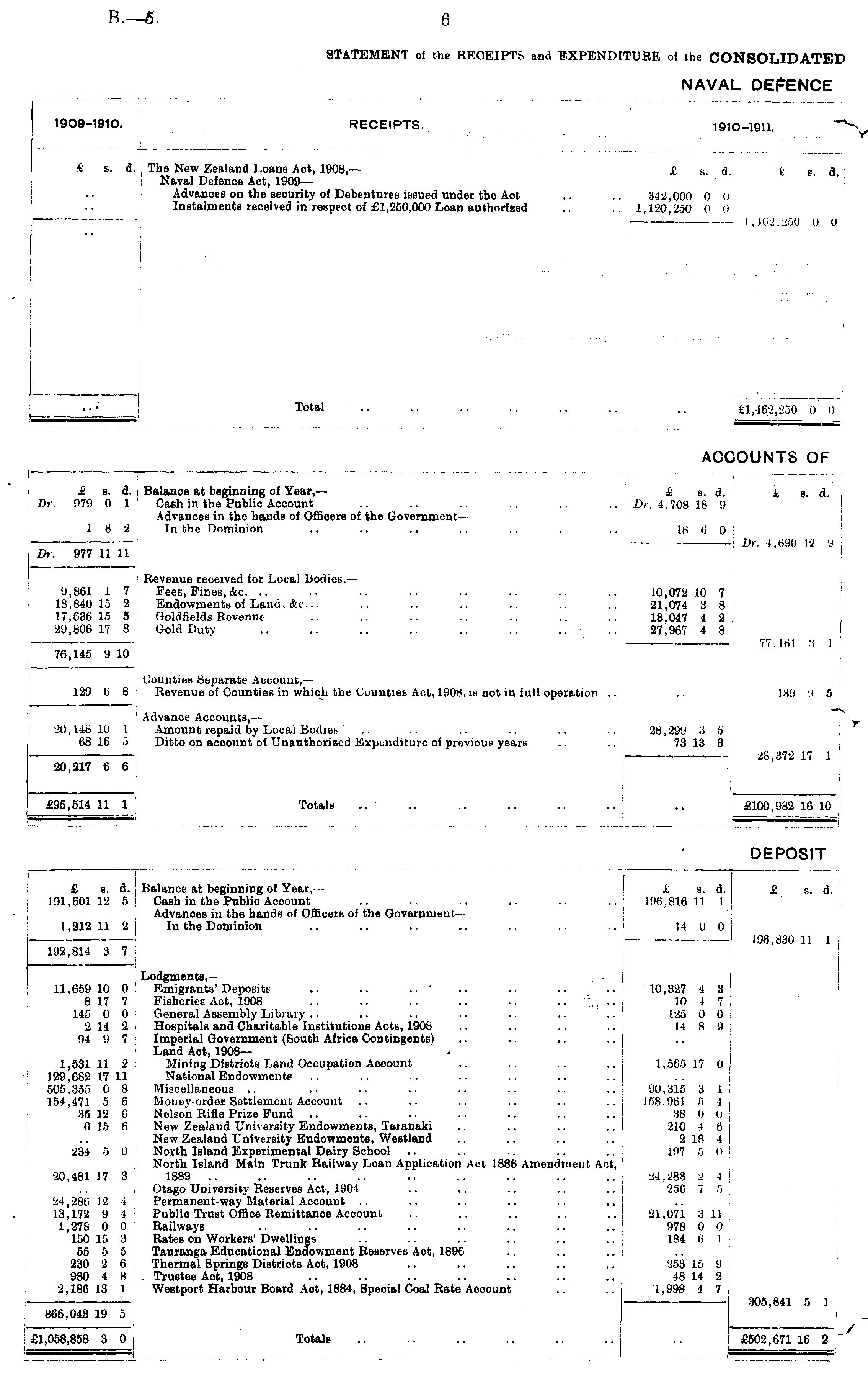 NAVAL DEFENCE 1909-1910. RECEIPTS. 1910-1911. C s. d. The New Zealand Loans Act, 1908, — £ s. d t s d Naval Defence Act, 1909— Advances on the security of Debentures issued under the Act .. .. 342,000 0 o Instalments received in respect of £1,250,000 Loan authorized .. 1.120,250 0 0 — " 1,462,250 0 (i ••'•' Total .. .. .. .. .. .. £1,462,250 0 0 ACCOUNTS OF £ s. d. Balance at beginning of Year, — £ s. d. £ s. d. Dr. 979 0 1 Cash in the Public Account .. .. .. .. .. Dr. 4.708 18 9 Advances in the hands of Officers of the Government--1 8 2 In the Dominion .. .. .. .. .. .. .. is 6 0 ■ Dr. 4,690 12 '.I Dr. 977 11 11 Revenue received for Local Bodies, — 9,861 1 7 Fees, Fines, &c. .. .. .. .. .. .. 10,072 10 7 18,840 15 2! Endowments of Land, &c... .. .. .. .. 21,074 3 8 17,636 15 5 Goldfields Revenue .. .. .. .. .. .. .. 18,047 4 2 29,806 17 8 Gold Duty .. .. .. .. .. .. .. .. 27,967 4 8 77.161 3 1 ii. it,I .; i 76,145 9 10 76,145 9 10 _ Counties Separate Account,— 129 6 8 Revenue of Counties in which the Counties Act, 1908, is not in full operation .. .. 189 9 5 Advance Accounts, — 20,148 10 1 Amount repaid by Local Bodiet .. .. .. 28,299 3 5 68 16 5 Ditto on acoount of Unauthorized Expenditure of previous yeari- .. 73 13 8 28,37,2 17 1 20,217 6 6 £95,514 11 1 Totals .. .. .. .. .. .. £100,982 16 10 I ■ ' £100,982 16 10 : — DEPOSIT DEPOSIT £ s. A. Balance at beginning of Year,— £ a. d. t s. d. I 191,601 12 6 Cash in the Publio Account .. .. .. .. .. 196.816 II I Advances in the hands of Officers of the Government— 1,212 11 2 In the Dominion .. .. .. .. .. .. .. 14 0 0 196,830 II 1 192,814 3 7 £ s. d. 196,816 11 I j L s. d. 14 0 0 196,830 II 1 Lodgments,— 11,659 10 0 Emigrants'Deposits .. .. .. .. .. .. .. Hi,327 4 3 8 17 7 Fisheries Act, 1908 .. .. .. .. ..... 10 145 0 0 General Assembly Library .. .. .. .. .. .. 125 0 0 2 14 2 Hospitals and Charitable Institutions Acts, 1908 .. .. .. .. U 8 9 94 9 7 Imperial Government (South Africa Contingents) Land Act, 1908— 1,531 11 2 . Mining Districts Land Occupation Aooount .. .. ,. .. 1,666 17 0 129,682 17 11 National Endowments 505,355 0 8 Miscellaneous .. .. .. .. .. .. .. 'JO, 315 8 1 154,471 5 6 Money-order Settlement Account .. .. .. .. .. I53.!ibl 5 I 35 12 6 Nelson Rifle Prize Fund .. .. .. .. .. .. .. 38 0 0 0 15 6 New Zealand University Endowments, Taianaki .. .. .. 210 I 6 New Zealand University Endowments, Westland .. .. .. .. 2 18 4 234 6 0 North Island Experimental Dairy School .. .. .. 197 5 0 North Island Main Trunk Railwav Loan Application Act 1886 Amendment Act, ■20,481 17 3 1889 .. .. .. .. .. .. .. .. .. 24,288 2 I Otago University Reserves Act, 1901 .. .. .. .. 256 7 5 24,286 12 i Permanent-way Material Account .. 13.172 9 1 Public Trust Office Remittance Account .. .. .. .. .. 21,071 8 11 1,278 0 0 Railways .. .. .. .. .. .. .. .. 978 0 0 150 15 3 Rates on Workers'Dwellings .. .. .. .. .. .. 184 6 I 56 5 5 Tauranga Educational Endowment Reserves Act, 1896 230 2 6 Thermal Springs Districts Act, 1908 .. .. .. .. .. 253 15 U 980 4 8 Trusteo Act, 1908 .. .. .. .. .. .. .. 48 14 2 2,186 18 1 Westport Harbour Board Aot, 1884, Special Coal Rate Aocount .. .. 1,998 4 7 305.841 5 1 HI.327 i 3 10 I 7 125 0 0 14 s [i 1,666 17 0 I 'JO. 315 3 1 168,961 6 1 38 li ti •210 I (> 2 18 4 197 5 it 24,288 2 l 356 7 5 21,071 8 11 978 0 0 184 6 I 253 15 9 48 14 2 I 1,998 4 7 -iuo,M+l o I 866,043 19 5 305,841 5 I ______ y / £1,058,858 3 0 Totals .. .. .. .. .. £502,671 16 2 " £1,058,858 3 0 £502,671 16 2