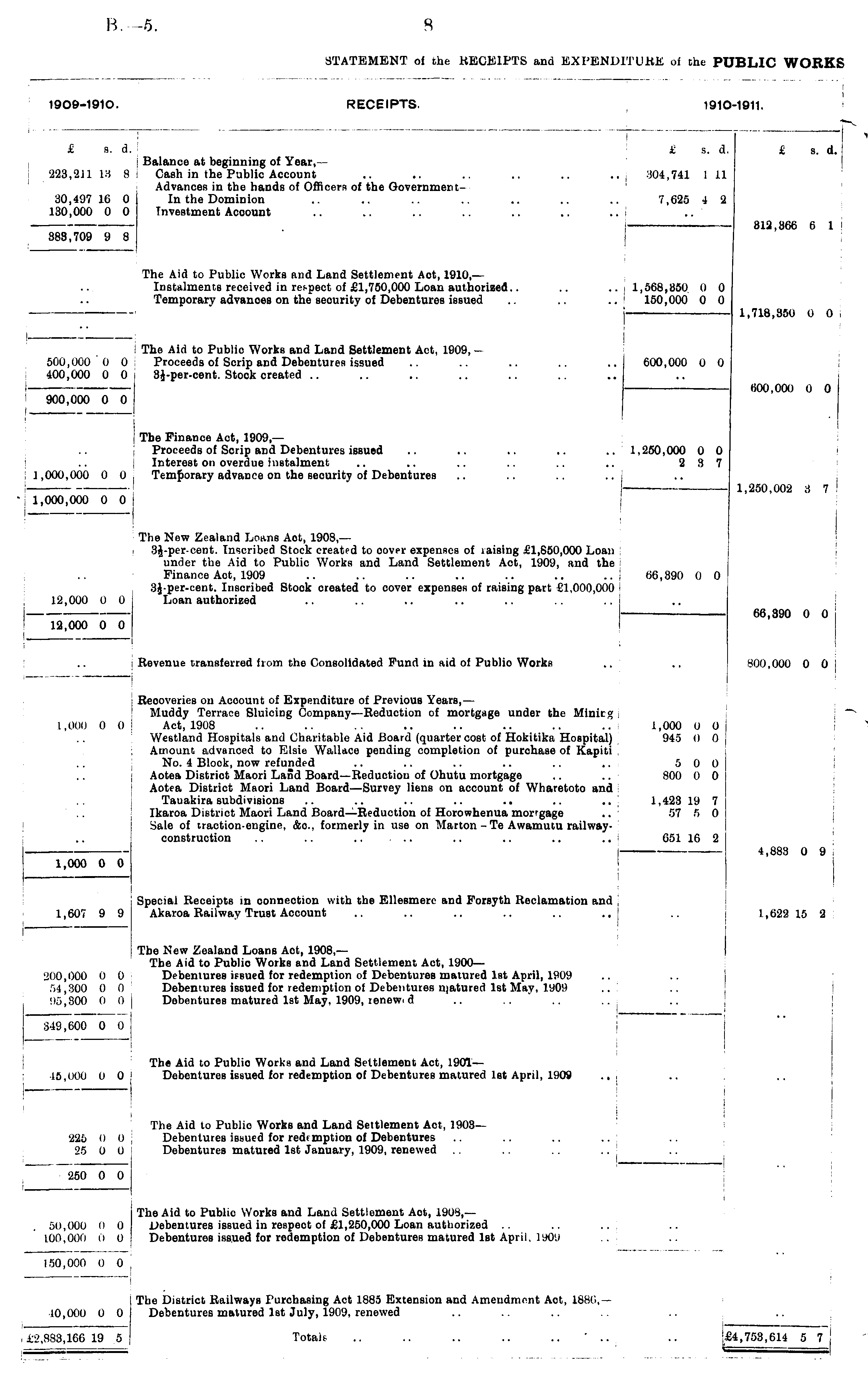 1909-1910. 1909-1910. RECEIPTS. 1910-1911. 1910-1911. ; . £ s. d. £ s. d. £ s. d. £ s. d. £ s. d. 223,211 13 8 223,211 13 8 30,497 16 0 130,000 0 0 Balance at beginning of Year,— Cash in the Public Account .. .. .. .. .. .. 304,741 1 11 Advances in the hands of Officers of the GovernmentIn the Dominion .. .. .. .. .. 7,625 4 2 Investment Acoount .. .. .. .. .. .. .. .. Qi o uaa c , 30,497 16 0 130,000 0 0 383,709 9 8 383,709 9 8 812,866 6 1 - 812,866 6 1 -I The Aid to Public Works and Land Settlement Aot, 1910 — Instalments received in respect of £1,750,000 Loan authorized.. .. .. 1,568,850 0 0 Temporary advances on the security of Debentures issued .. .. .. 150,000 0 0 j 1,718,350 0 0 1,568,850 0 0 150,000 0 0 1,718,850 0 0 500,000 ' 0 0 400,000 0 0 , 900,000 0 0 500,000 ' 0 0 400,000 0 0 The Aid to Public Works and Land Settlement Act, 1909, — Proceeds of Scrip and Debentures issued .. .. .. 600,000 0 0 SJ-per-cent. Stook created .. 600,000 0 0 600,000 0 0 600,000 0 0 900,000 0 0 ,000,000 0 0 . ,000,000 0 0 The Finance Act, 1909,— Proceeds of Scrip and Debentures issued .. .. .. .. .. 1,250,000 0 0 Interest on overdue instalment .. .. .. .. .. .. 237 Temporary advance on the security of Debentures 1,250,002 8 7 1,000,000 0 0 1,250,002 3 7 i 1,000,000 0 0 ,VW,WU U \J 12,000 0 0 12,000 0 0 The New Zealand Loans Aot, 1908 — 3J-percent. Inscribed Stock created to oover expenses of raising £1,850,000 Loan under the Aid to Public Works and Land Settlement Act, 1909, and the Finance Act, 1909 .. .. .. .. .. .. 60,390 0 0 3J-per-cent. Inscribed Stock created to cover expenses of raising part £1,000,000 Loan authorized 66,390 0 0 12,000 0 0 12,000 0 0 66,390 0 0 ■• i ■• Revenue transferred from the Consolidated Fund in aid of Publio Works .. .. 800,000 0 0 I 800,000 0 0 | i ,000 o o _ 1 : Recoveries on Acoount of Expenditure of Previous YearB, — Muddy Terrace Sluicing Company—Reduction of mortgage under the Minirg j Act, 1908 .. .. .. .. .. .. .. 1,000 u 0 Westland Hospitals and Charitable Aid Board (quarter cost of Hokitika Hospital) 945 0 0 Amount advanced to Elsie Wallace pending completion of purchase of Kapiti No. 4 Block, now refunded .. .. .. .. .. .. fi 0 0 Aotea District Maori Land Board—Reduction of Ohutu mortgage .. .. 800 0 0 Aotea District Maori Land Board —Survey liens on account of Wharetoto and Tauakira subdivisions .. .. .. .. .. .. .. 1,423 19 7 Ikaroa District Maori Land Board—Reduction of Horowhenua mortgage .. 57 B 0 Sale of traction-engine, &c, formerly in use on Marton -Te Awamutu railwayconstruction .. .. .. .. .. 051 16 2 i ,000 o o I 1,000 0 0 1,000 0 0 | 4,883 O 9 1,607 9 9 Special Receipts in connection with the EUesmere and Forsyth Reclamation and Akaroa Railway Trust Account .. .. .. .. .. ., 1,622 15 2 1,607 9 9 200,000 0 0 300 0 0 95,800 0 0 349,600 0 0 i The New Zealand Loans Act, 1908, — The Aid to Public Works and Land Settlement Act, 1900— Debentures issued for redemption of Debentures matured 1st April, 1909 Debentures issued for redemption of Debentures matured 1st May, 1909 Debentures matured 1st May. 1909, renew, d 45,000 0 0 j 225 0 0 I 25 0 0 250 0 0 The Aid to Publio Works and Land Settlement Act, 1901 — Debentures issued for redemption of Debentures matured 1st April, 1909 The Aid to Public Works and Land Settlement Act, 1908— Debentures issued for redfmption of Debentures Debentures matured 1st January, 1909, renewed , 250 0 0 . B0,000 0 0 loo.ooo ii o BO,OOO 0 0 ion.ooo 0 0 The Aid to Public Works and Land Settlement Aot, 1903,— Debentures issued in respect of £1,250,000 Loan authorized Debentures issued for redemption of Debentures matured 1st April, 1909 L50.000 0 0 150,000 0 0 IOU,UUU u u 10,000 0 0 The District Railways Purchasing Act 1885 Extension and Amendment Aot, 1880,— Debentures matured 1st July, 1909, renewed 10,000 0 0 ,883,166 19 5 1 Totals .. .. .. .. .. * .., .. [£4,753,614 5 7 £2,883,166 19 5