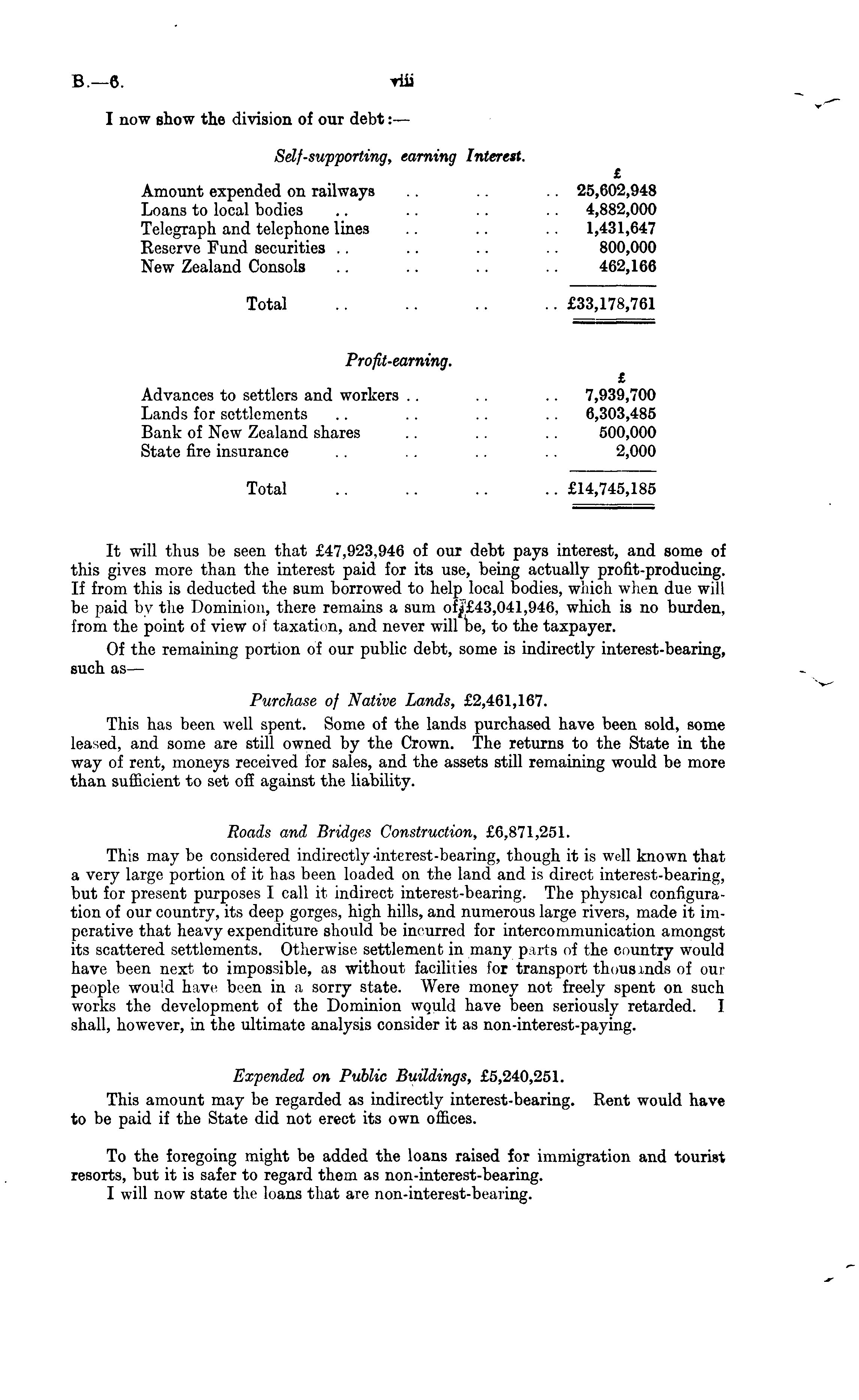I now show the division of our debt:— Self-supporting, earning Interest. £ Amount expended on railways .. .. .. 25,602,948 Loans to local bodies .. .. .. .. 4,882,000 Telegraph and telephone lines .. .. .. 1,431,647 Keserve Fund securities .. .. .. .. 800,000 New Zealand Consols .. .. .. .. 462,166 Total .. .. .. .. £33,178,761 Profit-earning. £ Advances to settlers and workers .. .. .. 7,939,700 Lands for settlements .. .. .. .. 6,303,485 Bank of New Zealand shares .. .. .. 500,000 State fire insurance .. .. .. .. 2,000 Total .. .. .. .. £14,745,185 It will thus be seen that £47,923,946 of our debt pays interest, and some of this gives more than the interest paid for its use, being actually profit-producing. If from this is deducted the sum borrowed to help local bodies, which when due will be paid by the Dominion, there remains a sum 0fj£43,041,946, which is no burden, from the point of view of taxation, and never will be, to the taxpayer. Of the remaining portion of our public debt, some is indirectly interest-bearing, such as— Purchase of Native Lands, £2,461,167. This has been well spent. Some of the lands purchased have been sold, some leased, and some are still owned by the Crown. The returns to the State in the way of rent, moneys received for sales, and the assets still remaining would be more than sufficient to set off against the liability. Roads and Bridges Construction, £6,871,251. This may be considered indirectly -interest-bearing, though it is well known that a very large portion of it has been loaded on the land and is direct interest-bearing, but for present purposes I call it indirect interest-bearing. The physical configuration of our country, its deep gorges, high hills, and numerous large rivers, made it imperative that heavy expenditure should be incurred for intercommunication amongst its scattered settlements. Otherwise settlement in many parts of the country would have been next to impossible, as without facilities for transport thousands of our people would have been in a sorry state. Were money not freely spent on such works the development of the Dominion would have been seriously retarded. I shall, however, in the ultimate analysis consider it as non-interest-paying. Expended on Public Buildings, £5,240,251. This amount may be regarded as indirectly interest-bearing. Rent would have to be paid if the State did not erect its own offices. To the foregoing might be added the loans raised for immigration and tourist resorts, but it is safer to regard them as non-interest-bearing. I will now state the loans that are non-interest-bearing.