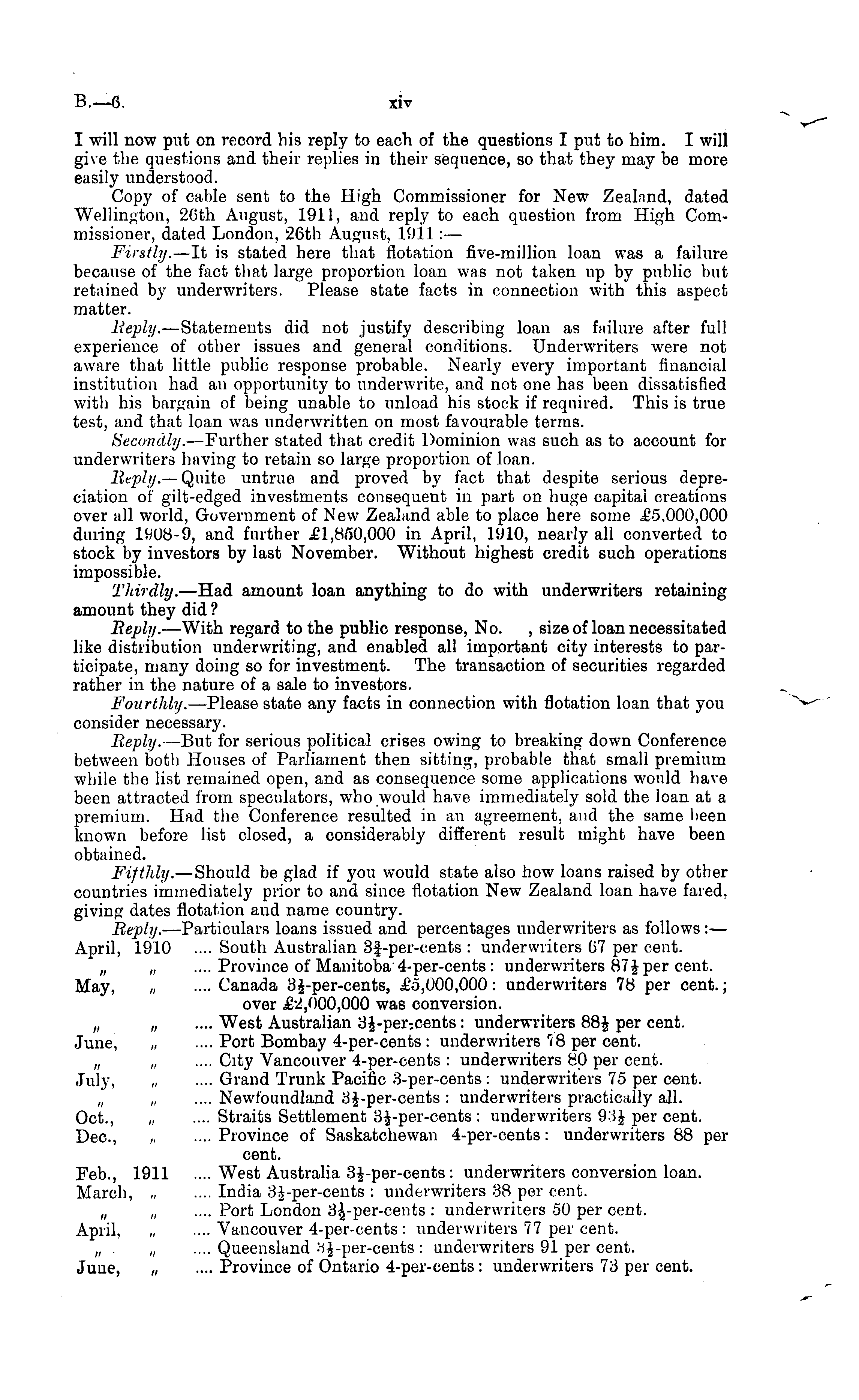I will now put on record his reply to each of the questions I put to him. I will give the questions and their replies in their sequence, so that they may be more easily understood. Copy of cable sent to the High Commissioner for New Zealnnd, dated Wellington, 2Gth August, 1911, and reply to each question from High Commissioner, dated London, 26th August, 1911:— Firstly. —lt is stated here that flotation five-million loan was a failure because of the fact that large proportion loan was not taken up by public but retained by underwriters. Please state facts in connection with this aspect matter. Reply. —Statements did not justify describing loan as failure after full experience of other issues and general conditions. Underwriters were not aware that little public response probable. Nearly every important financial institution had an opportunity to underwrite, and not one has been dissatisfied with his bargain of being unable to unload his stock if required. This is true test, and that loan was underwritten on most favourable terms. Secondly. —Further stated that credit Dominion was such as to account for underwriters having to retain so large proportion of loan. Reply.— Quite untrue and proved by fact that despite serious depreciation of gilt-edged investments consequent in part on huge capital creations over all world, Government of New Zealand able to place here some £5,000,000 during IV/08-9, and further £1,860,000 in April, 1910, nearly all converted to stock by investors by last November. Without highest credit such operations impossible. Thirdly. —Had amount loan anything to do with underwriters retaining amount they did ? Reply. —With regard to the public response, No. , size of loan necessitated like distribution underwriting, and enabled all important city interests to participate, many doing so for investment. The transaction of securities regarded rather in the nature of a sale to investors. Fourthlij. —Please state any facts in connection with flotation loan that you consider necessary. Reply. —But for serious political crises owing to breaking down Conference between both Houses of Parliament then sitting, probable that small premium while the list remained open, and as consequence some applications would have been attracted from speculators, who.would have immediately sold the loan at a premium. Had the Conference resulted in an agreement, and the same been known before list closed, a considerably different result might have been obtained. Fifthly. —Should be glad if you would state also how loans raised by other countries immediately prior to and since flotation New Zealand loan have fared, giving dates flotation and name country. Reply. —Particulars loans issued and percentages underwriters as follows :— April, 1910 .... South Australian 3|-per-cents : underwriters 07 per cent. „ „ .... Province of Manitoba 4-per-cents : underwriters 87 \ per cent. May, ~ .... Canada £5,000,000: underwriters 78 per cent.; over £2,000,000 was conversion. „ „ .... West Australian underwriters 88£ per cent. June, „ .... Port Bombay 4-per-cents : underwriters "J8 per cent. „ „ .... City Vancouver 4-per-cents : underwriters 80 per cent. July, „ .... Grand Trunk Pacific 3-per-cents: underwriters 75 per cent. „ „ .... Newfoundland 3£-per-cents : underwriters practically all. Oct., „ .... Straits Settlement : underwriters 93£ per cent. Dec, „ ....Province of Saskatchewan 4-per-cents: underwriters 88 per cent. Feb., 1911 .... West Australia underwriters conversion loan. March, „ .... India : underwriters 38 per cent. „ „ .... Port London 3|-per-cents : underwriters 50 per cent. April, „ .... Vancouver 4-per-cents : underwriters 77 per cent. „ „ .... Queensland HJ-per-cents : underwriters 91 per cent. June, „ .... Province of Ontario 4-per-cents: underwriters 73 per cent.