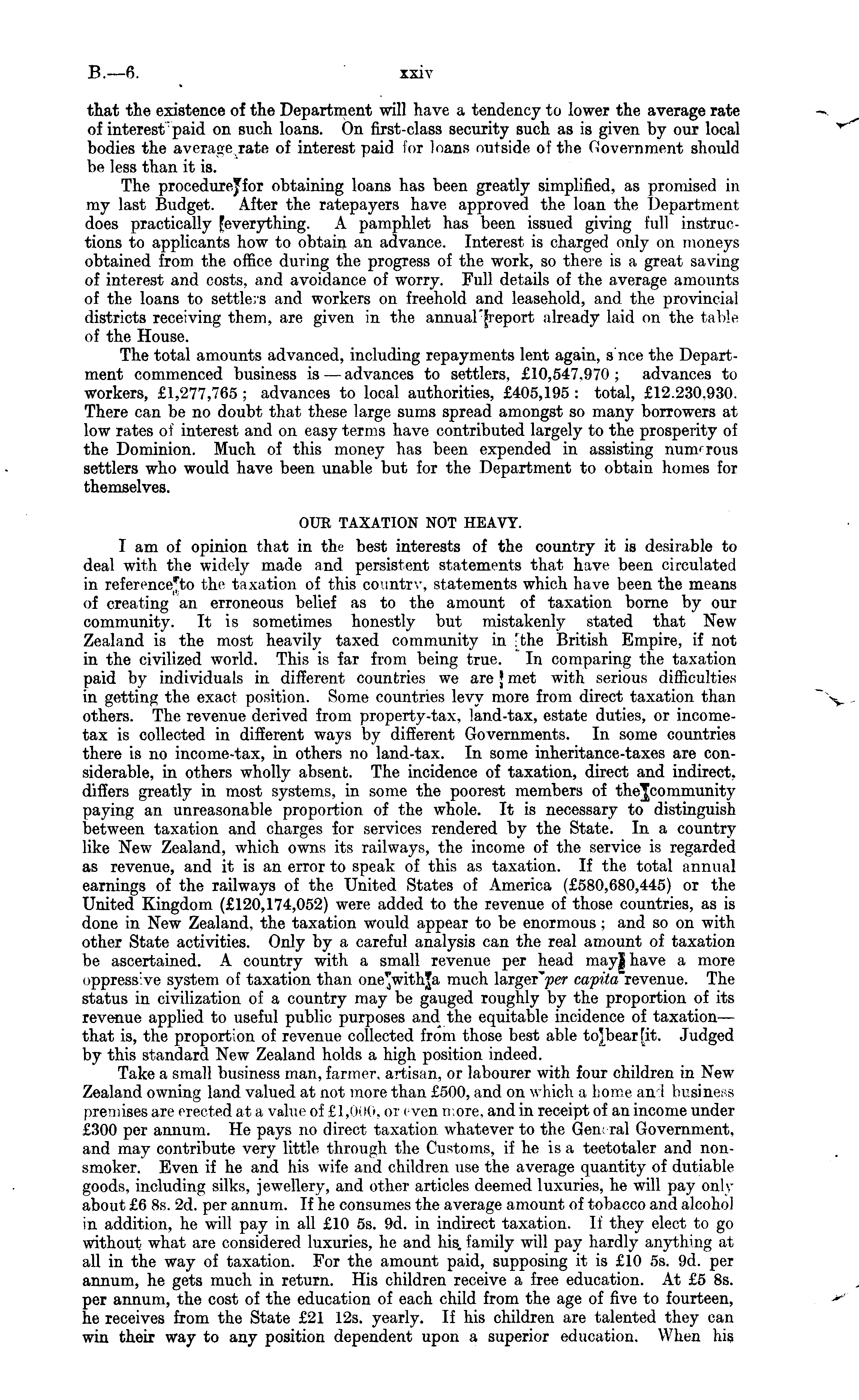 that the existence of the Department will have a tendency to lower the average rate of interest paid on such loans. On first-class security such as is given by our local bodies the average rate of interest paid for loans outside of the Government should be less than it is. The procedure*for obtaining loans has been greatly simplified, as promised in my last Budget. After the ratepayers have approved the loan the Department does practically A pamphlet has been issued giving full instructions to applicants how to obtain an advance. Interest is charged only on moneys obtained from the office during the progress of the work, so there is a great saving of interest and costs, and avoidance of worry. Full details of the average amounts of the loans to settlers and workers on freehold and leasehold, and the provincial districts receiving them, are given in the already laid on the table of the House. The total amounts advanced, including repayments lent again, s nee the Department commenced business is—advances to settlers, £10,547.970; advances to workers, £1,277,765 ; advances to local authorities, £405,195 : total, £12.230.930. There can be no doubt that these large sums spread amongst so many borrowers at low rates of interest and on easy terms have contributed largely to the prosperity of the Dominion. Much of this money has been expended in assisting numerous settlers who would have been unable but for the Department to obtain homes for themselves. OUE TAXATION NOT HEAVY. I am of opinion that in the best interests of the country it is desirable to deal with the widely made and persistent statements that have been circulated in reference'to the taxation of this country, statements which have been the means of creating an erroneous belief as to the amount of taxation borne by our community. It is sometimes honestly but mistakenly stated that New Zealand is the most heavily taxed community in 'the British Empire, if not in the civilized world. This is far from being true. In comparing the taxation paid by individuals in different countries we are ] met with serious difficulties in getting the exact position. Some countries levy more from direct taxation than others. The revenue derived from property-tax, land-tax, estate duties, or incometax is collected in different ways by different Governments. In some countries there is no income-tax, in others no land-tax. In some inheritance-taxes are considerable, in others wholly absent. The incidence of taxation, direct and indirect, differs greatly in most systems, in some the poorest members of the][community paying an unreasonable proportion of the whole. It is necessary to distinguish between taxation and charges for services rendered by the State. In a country like New Zealand, which owns its railways, the income of the service is regarded as revenue, and it is an error to speak of this as taxation. If the total annual earnings of the railways of the United States of America (£580,680,445) or the United Kingdom (£120,174,052) were added to the revenue of those countries, as is done in New Zealand, the taxation would appear to be enormous; and so on with other State activities. Only by a careful analysis can the real amount of taxation be ascertained. A country with a small revenue per head mayj have a more oppress : ve system of taxation than much larger'per capvta'revenue. The status in civilization of a country may be gauged roughly by the proportion of its revenue applied to useful public purposes and. the equitable incidence of taxation— that is, the proportion of revenue collected from those best able tojbearfit. Judged by this standard New Zealand holds a high position indeed. Take a small business man, farmer, artisan, or labourer with four children in New Zealand owning land valued at not more than £500, and on which a borne an i busine s premises are erected at a value of £1,000, or even more, and in receipt of an income under £300 per annum. He pays no direct taxation whatever to the General Government, and may contribute very little through the Customs, if he is a teetotaler and nonsmoker. Even if he and his wife and children use the average quantity of dutiable goods, including silks, jewellery, and other articles deemed luxuries, he will pay onlv about £6 8s. 2d. per annum. If he consumes the average amount of tobacco and alcohol in addition, he will pay in all £10 5s. 9d. in indirect taxation. If they elect to go without what are considered luxuries, he and his family will pay hardly anything at all in the way of taxation. For the amount paid, supposing it is £10 5s. 9d. per annum, he gets much in return. His children receive a free education. At £5 8s. per annum, the cost of the education of each child from the age of five to fourteen, he receives from the State £21 12s. yearly. If his children are talented they can win their way to any position dependent upon a superior education. When his
