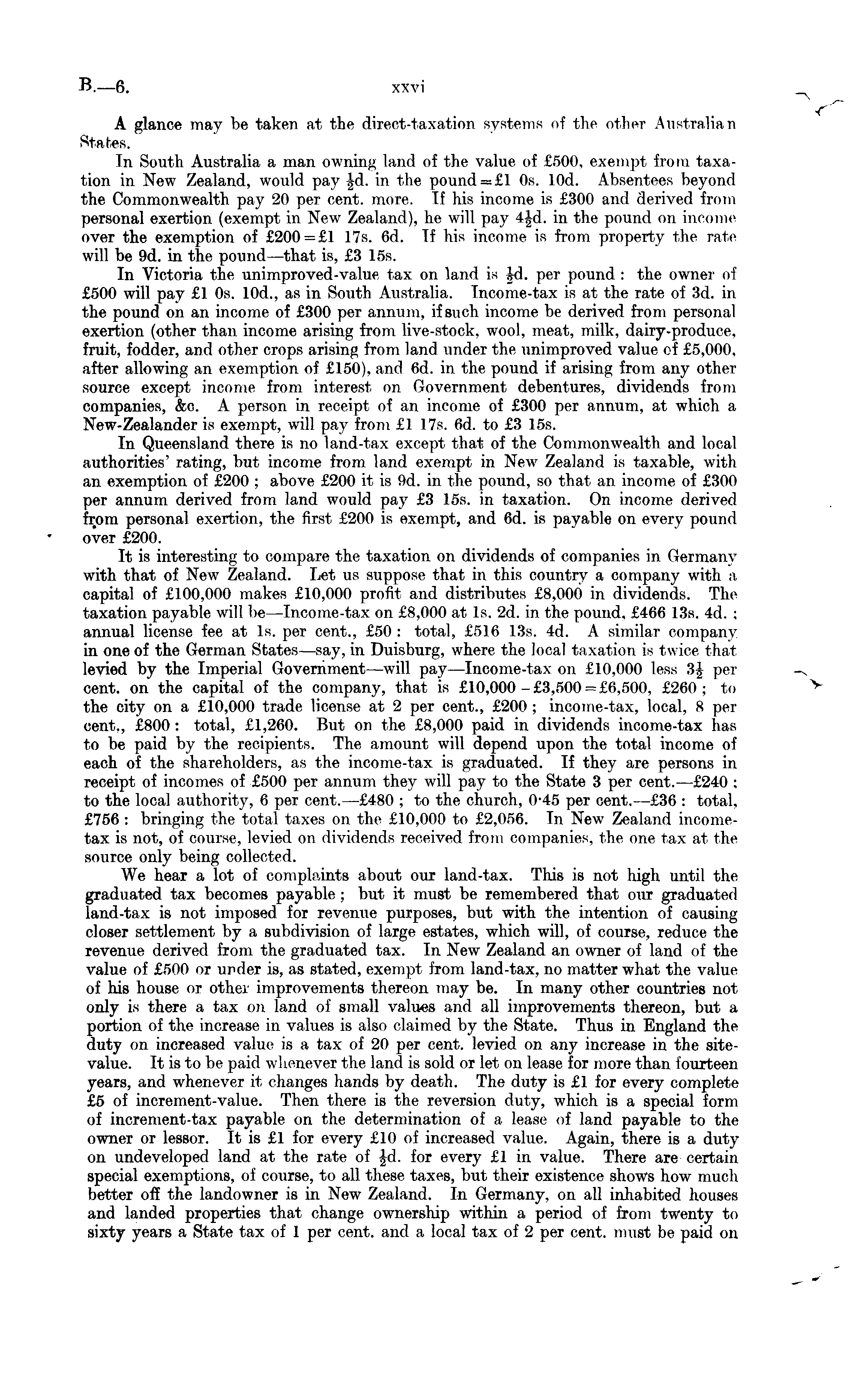 A glance may be taken at the direct-taxation systems of the other Australian States. ' In South Australia a man owning land of the value of £500, exempt from taxation in New Zealand, would pay Jd. in the pound =£1 os. 10d. Absentees beyond the Commonwealth pay 20 per cent. more. Tf his income is £300 and derived from personal exertion (exempt in New Zealand), he will pay 4|d. in the pound on income over the exemption of £200 =£1 17s. 6d. Tf his income is from property the rate will be 9d. in the pound—that is, £3 15s. In Victoria the unimproved-value tax on land is hd. per pound : the owner of £500 will pay £1 On. 10d., as in South Australia. Income-tax is at the rate of 3d. in the pound on an income of £300 per annum, if such income be derived from personal exertion (other than income arising from live-stock, wool, meat, milk, dairy-produce, fruit, fodder, and other crops arising from land under the unimproved value of £5,000, after allowing an exemption of £150), and 6d. in the pound if arising from any other source except income from interest on Government debentures, dividends from companies, &c. A person in receipt of an income of £300 per annum, at which a New-Zealander is exempt, will pay from £1 17s. 6d. to £3 15s. In Queensland there is no land-tax except that of the Commonwealth and local authorities' rating, but income from land exempt in New Zealand is taxable, with an exemption of £200 ; above £200 it is 9d. in the pound, so that an income of £300 per annum derived from land would pay £3 15s. in taxation. On income derived from personal exertion, the first £200 is exempt, and 6d. is payable on every pound over £200. It is interesting to compare the taxation on dividends of companies in Germany with that of New Zealand. Let us suppose that in this country a company with a capital of £100,000 makes £10,000 profit and distributes £8,000 in dividends. The taxation payable will be—lncome-tax on £8,000 at Is. 2d. in the pound, £466 13s. 4d. ; annual license fee at Is. per cent., £50 : total, £516 13s. 4d. A similar company in one of the German States—say, in Duisburg, where, the local taxation is twice that levied by the Imperial Government—will pay —Income-tax on £10,000 less 3| per cent, on the capital of the company, that is £10,000-£3,500 = £6,500, £260; to the city on a £10,000 trade license at 2 per cent., £200 ; income-tax, local, 8 per cent., £800 : total, £1,260. But on the £8,000 paid in dividends income-tax lias to be paid by the recipients. The amount will depend upon the total income of each of the shareholders, as the income-tax is graduated. If they are persons in receipt of incomes of £500 per annum they will pay to the State 3 per cent. —£240 : to the local authority, 6 per cent. —£480 ; to the church, 0-45 per cent. —£36 : total, £756 : bringing the total taxes on the £10,000 to £2,056. In New Zealand incometax is not, of course, levied on dividends received from companies, the one tax at the source only being collected. We hear a lot of complaints about our land-tax. This is not high until the graduated tax becomes payable ; but it must be remembered that our graduated land-tax is not imposed for revenue purposes, but with the intention of causing closer settlement by a subdivision of large estates, which will, of course, reduce the revenue derived from the graduated tax. In New Zealand an owner of land of the value of £500 or under is, as stated, exempt from land-tax, no matter what the value of his house or other improvements thereon may be. In many other countries not only is there a tax on land of small values and all improvements thereon, but a portion of the increase in values is also claimed by the State. Thus in England the duty on increased value is a tax of 20 per cent, levied on any increase in the sitevalue. It is to be paid whenever the land is sold or let on lease for more than fourteen years, and whenever it changes hands by death. The duty is £1 for every complete £5 of increment-value. Then there is the reversion duty, which is a special form of increment-tax payable on the determination of a lease of land payable to the owner or lessor. It is £1 for every £10 of increased value. Again, there is a duty on undeveloped land at the rate of for every £1 in value. There are certain special exemptions, of course, to all these taxes, but their existence shows how much better off the landowner is in New Zealand. In Germany, on all inhabited houses and landed properties that change ownership within a period of from twenty to sixty years a State tax of 1 per cent, and a local tax of 2 per cent, must be paid on