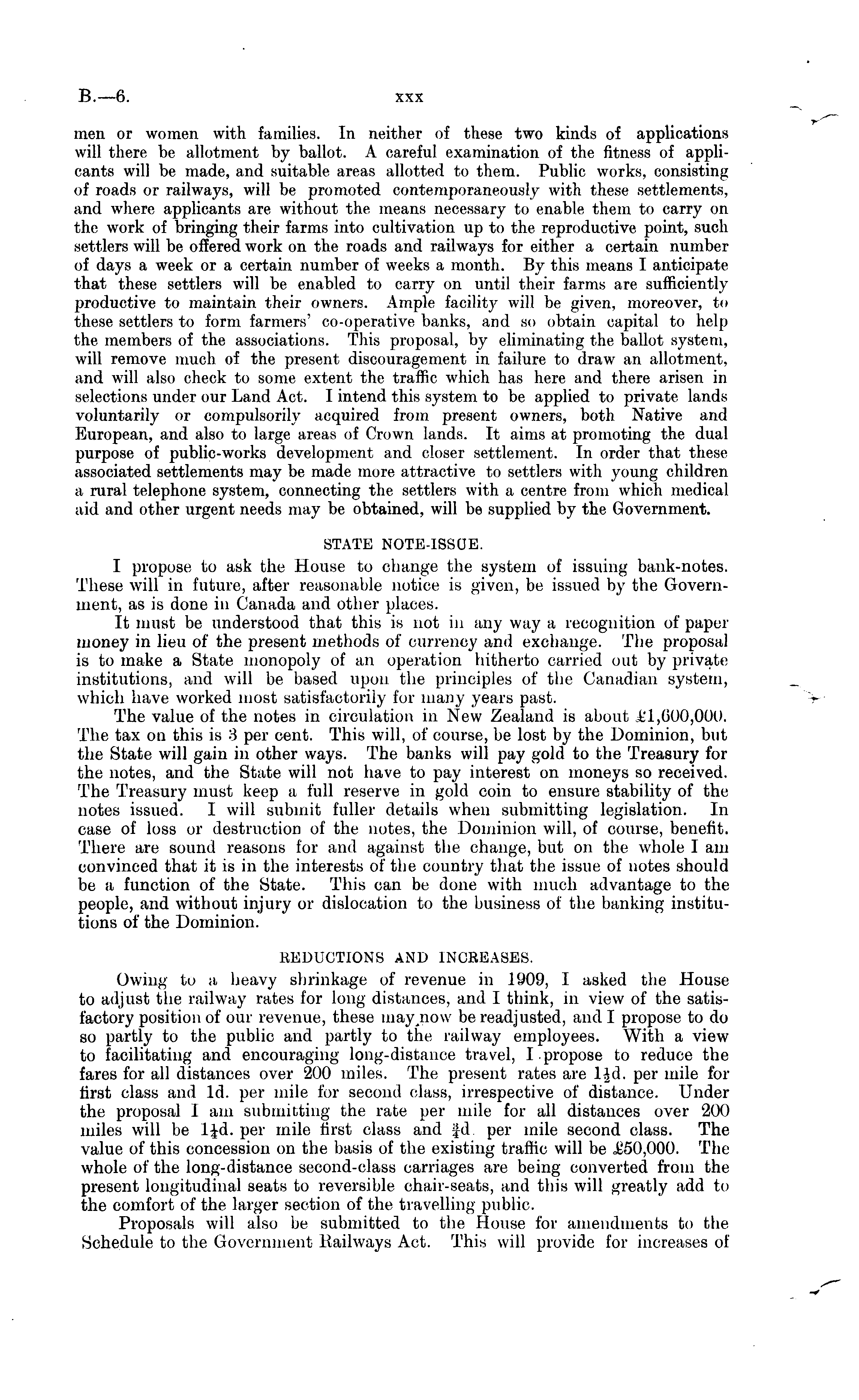 men or women with families. In neither of these two kinds of applications will there be allotment by ballot. A careful examination of the fitness of applicants will be made, and suitable areas allotted to them. Public works, consisting of roads or railways, will be promoted contemporaneously with these settlements, and where applicants are without the means necessary to enable them to carry on the work of bringing their farms into cultivation up to the reproductive point, such settlers will be offered work on the roads and railways for either a certain number of days a week or a certain number of weeks a month. By this means I anticipate that these settlers will be enabled to carry on until their farms are sufficiently productive to maintain their owners. Ample facility will be given, moreover, to these settlers to form farmers' co-operative banks, and so obtain capital to help the members of the associations. This proposal, by eliminating the ballot system, will remove much of the present discouragement in failure to draw an allotment, and will also check to some extent the traffic which has here and there arisen in selections under our Land Act. I intend this system to be applied to private lands voluntarily or compulsorily acquired from present owners, both Native and European, and also to large areas of Crown lands. It aims at promoting the dual purpose of public-works development and closer settlement. In order that these associated settlements may be made more attractive to settlers with young children a rural telephone system, connecting the settlers with a centre from which medical aid and other urgent needs may be obtained, will be supplied by the Government. STATE NOTE-ISSUE. I propose to ask the House to change the system of issuing bank-notes. These will in future, after reasonable notice is given, be issued by the Government, as is done in Canada and other places. It must be understood that this is not in any way a recognition of paper money in lieu of the present methods of currency and exchange. The proposal is to make a State monopoly of an operation hitherto carried out by private; institutions, and will be based upon the principles of the Canadian system, which have worked most satisfactorily for many years past. The value of the notes in circulation in New Zealand is about A'l,600,000. The tax on this is 8 per cent. This will, of course, be lost by the Dominion, but the State will gain in other ways. The banks will pay gold to the Treasury for the notes, and the State will not have to pay interest on moneys so received. The Treasury must keep a full reserve in gold coin to ensure stability of the notes issued. I will submit fuller details when submitting legislation. In case of loss or destruction of the notes, the Dominion will, of course, benefit. There are sound reasons for and against the change, but on the whole I am convinced that it is in the interests of the country that the issue of notes should be a function of the State. This can be done with much advantage to the people, and without injury or dislocation to the business of the banking institutions of the Dominion. KEDUCTIONS AND INCREASES. Owing to a heavy shrinkage of revenue in 1909, I asked the House to adjust the railway rates for long distances, and I think, in view of the satisfactory position of our revenue, these mayjiow be readjusted, and I propose to do so partly to the public and partly to the railway employees. With a view to facilitating and encouraging long-distance travel, I.propose to reduce the fares for all distances over 200 miles. The present rates are l$d. per mile for first class and Id. per mile for second class, irrespective of distance. Under the proposal I am submitting the rate per mile for all distances over 200 miles will be ljd. per mile first class and |d. per mile second class. The value of this concession on the basis of the existing traffic will be £50,000. The whole of the long-distance second-class carriages are being converted from the present longitudinal seats to reversible chair-seats, and this will greatly add to the comfort of the larger section of the travelling public. Proposals will also be submitted to the House for amendments to the Schedule to the Government llailways Act. This will provide for increases of