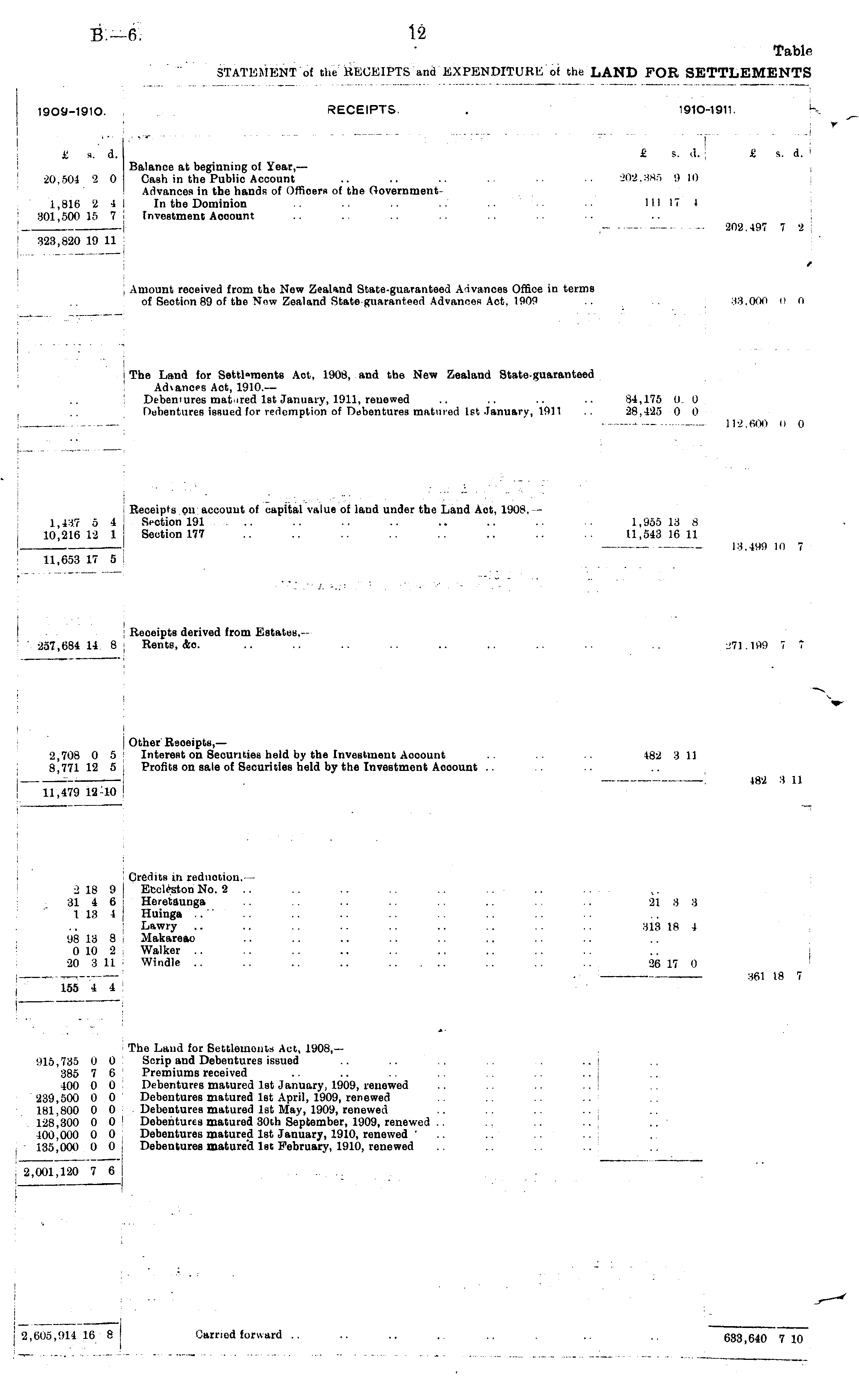 19O9-191O. RECEIPTS. . -91O-1911. 19O9-191O. £ b. d. £ B. a. £ s. d. I £ b. d. Balance at beginning of Year, — 20,604 '2 0 Cash in the Public Account .. .. .. .. .. • • 202,885 '.) 10 Advances in the hands of Officers of the Government1,816 2 4 1 In the Dominion .. .. .. .. .. ■ 111 IT I 301,500 15 7 j Investment Acoount •j<j. .->()! -2 0 ■ 1,816 2 i 301,500 16 7 ' 202.497 7 -2 323,820 19 11 Amount received from the New Zealand State-guaranteed Advances Office in terms of Seotion 89 of the Nnw Zealand State guaranteed Advances* Act. 1900 .. . . 38,000 0 0 The Land for Settlements Aot, 1908, and the New Zealand State-guaranteed Advances Act, 1910.— Debentures mat >red 1st January, 1911, reuewed .. .. .. .. 84,175 d 0 Dubentures issued for redemption of Debentures matured 1st January, 1911 .. 26,425 0 0 j: 112,600 0 0 Receipts on account of capital value of land under the Land Aot, 190*. 1, i£! 5 4 , Section 191 .. .. .. .. .. . . . 1,955 13 8 10,216 12 1 Section 177 .. .. .. .. .. .. .. .. 11,543 16 11 I 18.499 10 7 11,653 17 5 ■• Receipts derived from Estates, — ' 257,684 14 8 ; Rents, &o. .. .. .. .. .. .. .. .. .. 271,199 7 7 . i Other Reoeipts,— '2,708 0 5 ; Interest on Securities held by the Investment Account .. .. 482 3 11 8,771 12 5 ; Profits on sale of Securities held by the Investment Acoount .. 11,479 12 tO Credits in reduoiion.— 2 18 9 No. 2 .. 31 4 6 Heretaunga .. . . .. .. .. .. .. .. 21 3 3 1 13 4 j Huinga Lawry .. .. .. .. . . .. .. . . . . 313 IS t 98 13 8 Makareao 0 10 2 Walker 20 3 11 : Windle .. .. .. .. .. .. .. .. .. 26 17 u ! ! • S61 18 7 155 4 4 j ! The Laud for Settlements Act, 1908,— 915,735 0 0 Scrip and Debentures issued .. .. .. 385 7 6 Premiums received 400 0 0 Debentures matured 1st January, 1909, renewed ■239,500 0 0 Debentures matured 1st April, 1909, renewed 181,800 0 0 Debentures matured 1st May, 1909, renewed 128,300 0 0 1 Debentures matured 30th September, 1909, renewed .. 100,000 0 0 Debentures matured 1st January, 1910, renewed ' .. I 135,000 0 0 : Debentures matured 1st February, 1910, renewed : . , 2,001,120 7 6 2,605,914 16 8 Carried forward .. .. .. .. .. . .. .. 633 640 7 10 633,640 7 10
