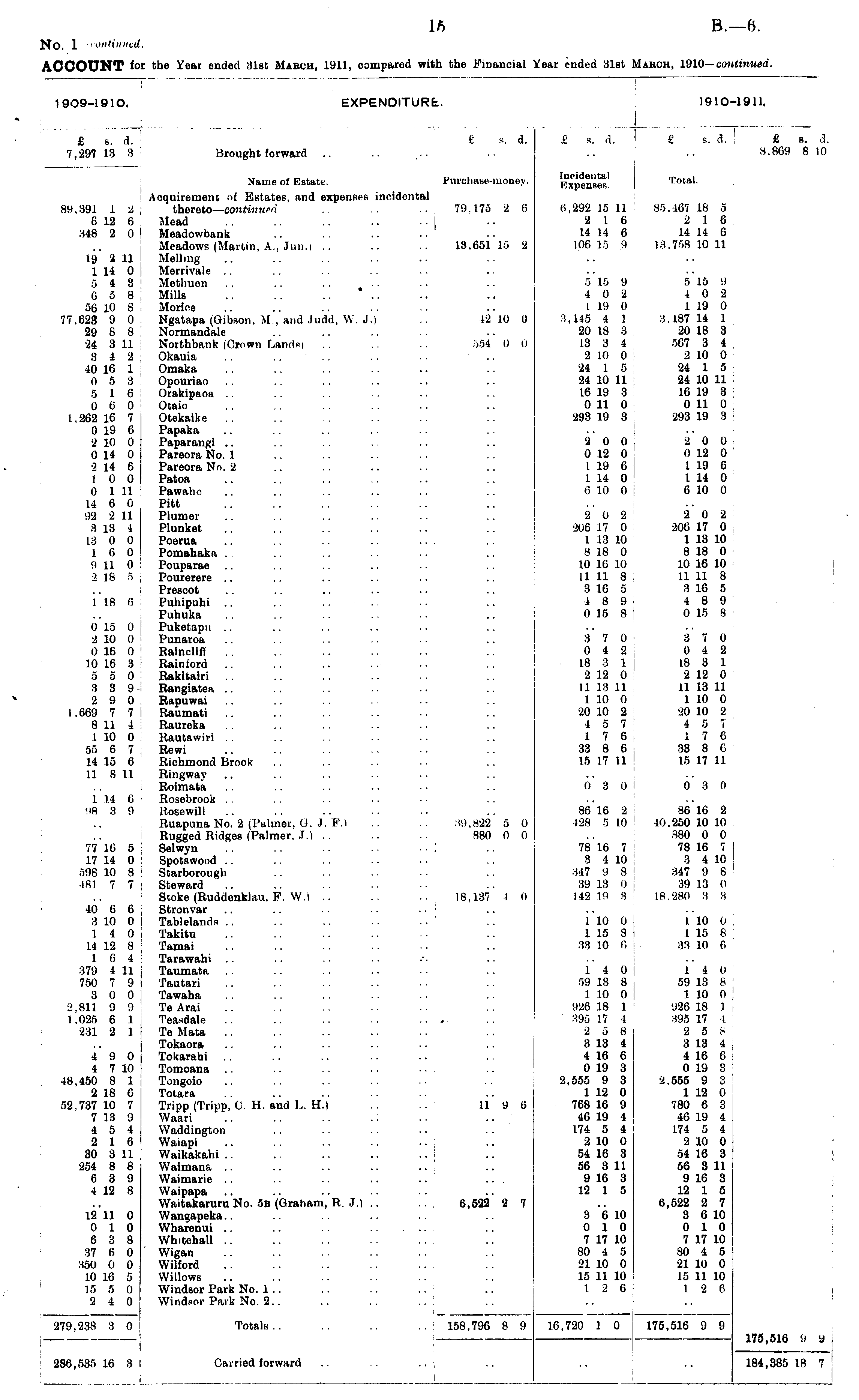 ! 19O9-191O. EXPENDITURE.. I 19O9-191O. £ s. ,1. 1910-1911. t i, a. ' e b. d 8.869 8 10 £ 8. d. fc s. d. £ s. d. 7,-297 18 8 7,297 18 8 Brought forward .. —, Name of Estate. Furclmse-moiHy. Incidental Expenses. Total Acquirement <>f Estate?, and expenses incidental 89,891 1 2 thereto— continued .. .. .. 79.17-5 2 G 6 12 6 Mead 848 2 0 ! Meadowbank Meadows (Martin, A., Jun.) .. .. ■• 13.651 15 2 19 -1 11 Melling 1 14 0 1 Merrivale .. 5 4 8' Metliuen 6 5 8 Mills .. .. .. * .. 56 10 8 '. Moritie 77.623 9 0 Ngatapa (Gibson. M . ami Judd, SY. J.) .. 42 10 0 29 8 8 Normandale •24 3 11 Northbank (Crown Landei .. . . .. r>54 0 0 3 4 2 Okauia 40 16 1 Omaka 0 5 3 Opouriao 5 1 6 Orakipaoa 0 6 0 Otaio 1.262 16 7 Otekaike .. 0 19 6 Papaka 1 10 0 Paparangi 0 14 0 Pareora No. 1 2 14 6 Pareora No. 2 1 0 0 Patoa 0 1 11 Pawaho 14 6 0 Pitt 92 2 11 Plainer 8 13 4 Plunket 18 0 0 Poerua 16 0 Pomahaka . il 11 0 : Pouparae . . 3 18 5 , Pourerere .. ; Prescot 1 18 6 I Puhipuhi Puhuka 0 15 0 ! Puketapu 2 10 0 Punaroa 0 16 0 ' Rainclifl 10 16 3 : Rainford .. 5 5 0 Rakitairi 8 3 9 Rangiatea .. 2 9 0 Rapuwai 1,669 7 7 I Raumati 8 11 4 Raureka 1 10 0 Kautawiri 55 6 7 Eewi 14 15 6 Richmond Brook 11 8 11 Bingway Roimata 1 14 6 Rosebrook 98 3 9 Rosewill RuapunaNo. 2 (Palmer, G. J. F.I .. .. 89,822 5 0 Rugged Ridges (Palmer. .T.I .. .. .. S80 0 0 77 16 5 Selwyn 17 14 0 Spotswood .. r>98 10 8 ' Starborongli •181 7 7; Steward Stoke (Ruddenklau, F. W.I .. .. .. 18,137 i 0 40 6 6 ; Stronvar 3 10 0 Tablelands 14 0 Takitu 14 12 8 Tamai 16 4 Tarawahi 379 4 11 Taumatn. 750 7 9 Tautari 3 0 0 Tawaha ■2,811 9 9 Te Arai 1,025 6 1 Teaxdale .. 231 2 1 Te Mata Tokaora 4 9 0 Tokarahi 4 7 10 Tomoana 48,450 8 1 i Tongoio 2 18 6 Totara 52.737 10 7 Tripp (Tripp, 0. H. and L. H.| .. .. 11 9 6 7 13 9 Waari .. .. .. .'. .. .. 4 5 4 I Waddington 2 1 6 I Waiapi 30 3 11 , Waikakahi .. 254 8 8 Wainians, .. 6 3 9 Waimarie .. 4 12 8 Waipapa .. Waitakaruru No. 5B (Graham, R.J.) .. . 6,522 2 7 12 11 0 Wangapeka.. 0 10 Wharenui 6 3 8 Whitehall .. 37 6 0 Wigan H50 0 0 Wilford 10 16 5 Willows 15 5 0 Windsor Park No. 1 .. 2 4 0 Windsor Paik No 2.. 8,292 15 11 2 1 6 14 14 6 106 L6 9 5 15 9 4 0 2 1 19 0 3,145 4 1 20 18 3 13 3 4 2 10 0 24 1 5 24 10 11 16 19 3 0 11 0 293 19 8 2 0 0 0 12 0 1 19 6 1 14 0 6 10 0 2 0 2 206 17 0 1 13 10 8 18 0 10 16 10 : 11 11 8 ■ 3 16 5 4 8 9 0 15 8 3 7 0 0 4 2 18 8 1 2 12 0 11 13 11 1 10 0 20 10 2 4 5 7 1 7 6 33 8 6 15 17 11 85,467 18 5 2 1 6 14 14 6 13.758 10 11 5 15 9 4 0 2 1 19 0 3,187 14 1 20 18 3 567 3 4 2 10 0 24 1 5 24 10 11 16 19 3 0 11 0 293 19 8 2 0 0 0 12 0 1 19 6 I 14 0 6 10 0 2 0 2 206 17 0 1 13 10 8 18 0 10 16 10 11 11 8 8 16 6 4 8 9 0 15 8 3 7 0 0 4 2 18 3 1 2 12 0 11 13 11 1 10 0 20 10 2 4 5 7 1 7 6 33 8 C 15 17 11 6 8 o 6 8 0 86 16 2 428 5 10 7816 7 3 4 10 347 9 8 39 13 0 142 19 3 86 16 2 40.250 10 10 880 0 0 78 16 7 3 4 10 847 9 8 39 13 0 18.280 8 8 1 10 0 1 15 8 33 10 6 I 10 6 115 8 83 10 6 14 0 59 13 8 1 10 0 926 18 1 ! 395 17 1 2 5 8 3 13 4 4 16 6 0 19 3 2,555 9 3 1 12 0 768 16 9 46 19 4 174 5 4 2 10 0 54 16 3 56 3 11 9 16 3 12 1 5 3 6 10 0 10 7 17 10 80 4 5 21 10 0 15 11 10 1 2 6 1 4 (i 59 13 8 1 10 0 I 926 18 1 396 17 I 2 5 e 8 13 4 4 16 6 0 19 B 2.555 9 3 1 12 0 780 6 3 46 19 4 174 5 4 2 10 0 54 16 3 56 3 11 9 16 3 12 1 5 6,522 2 7 3 6 10 0 10 7 17 10 80 4 5 21 10 0 15 11 10 1 2 6 279,238 3 0 Totals.. .. .. .. 158,796 8 9 16,720 1 0 175.516 9 9 175,516 9 9 286,535 16 8 1 Carried forward 184,385 18 7