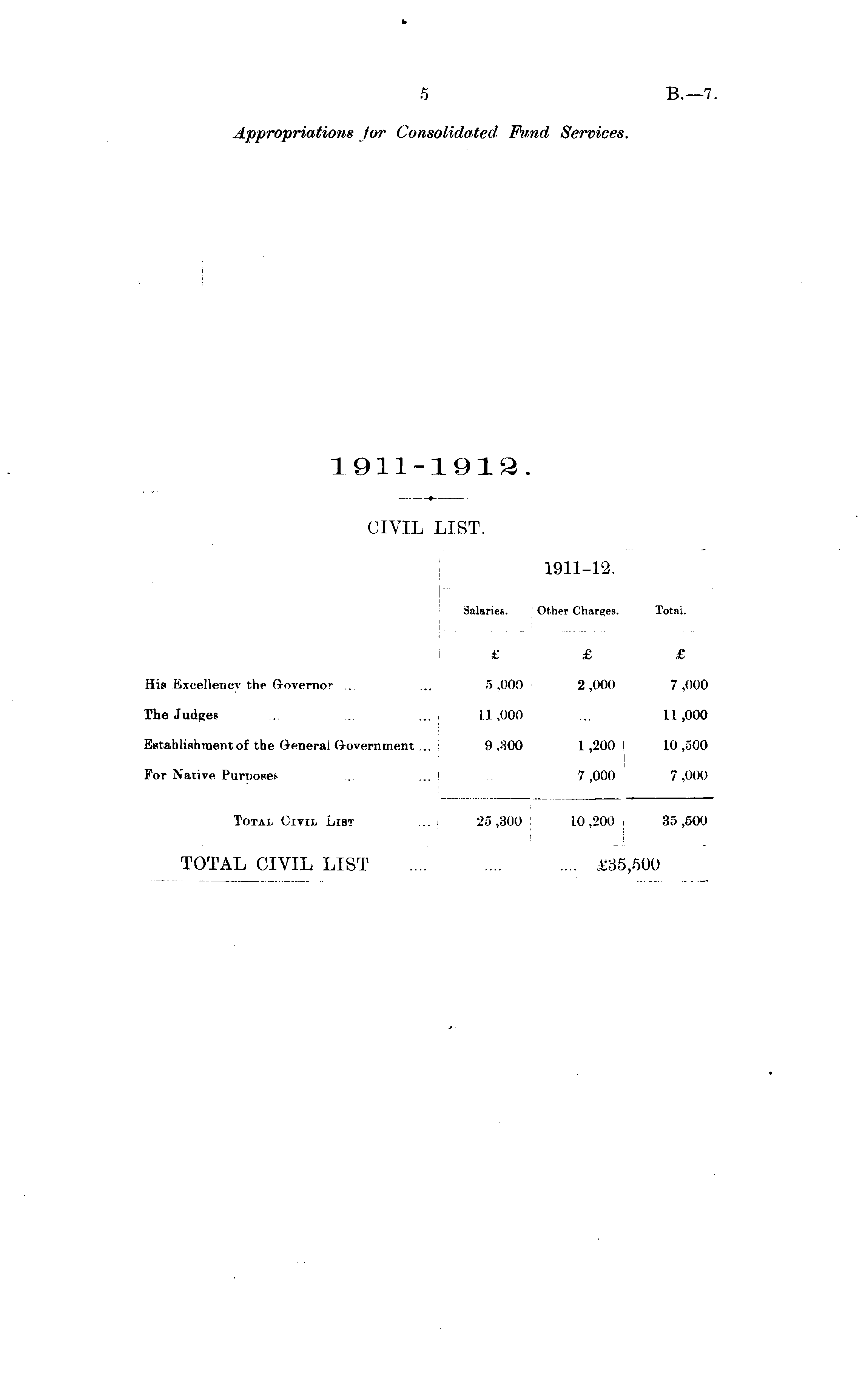 1911-12. Salaries. Other Charges. Total. £ £ £ His Excellency the Governor ... 5 ,000 2 ,000 7 ,000 The Judges 11,000 ... 11,000 Establishment of the General Government ... 9.300 1 ,200 10,500 For Native Purposes 7,000 7,000 , Total Civil List ... 25,300 j 10,200 | 35,500 TOTAL CIVIL LIST .... £35,600