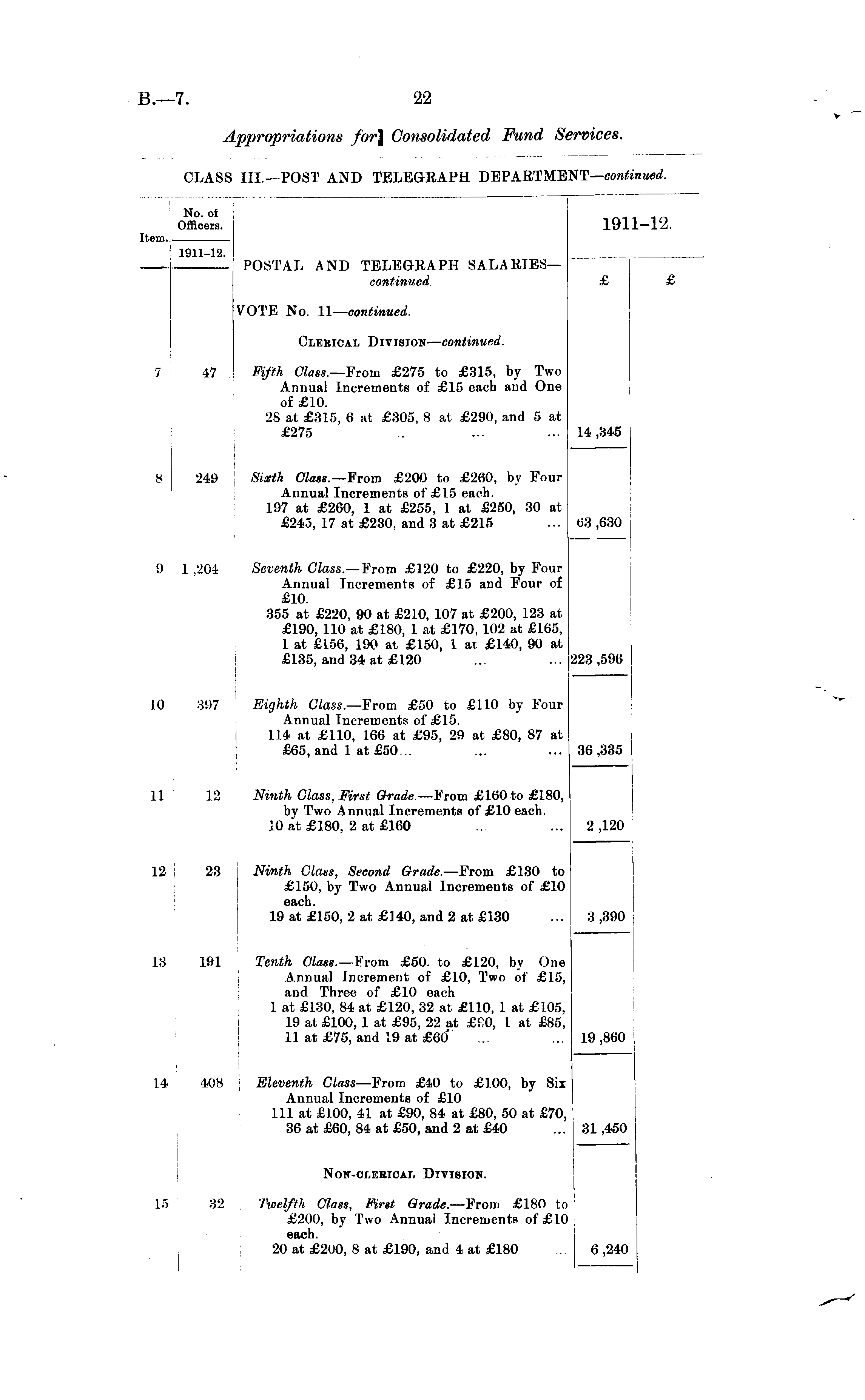 No. of Officers. 19 1-12. item. 1911-12. - POSTAL AND TELEGRAPH SALARIES— continued. VOTE No. 11— continued. Clerical Division — continued. 7 ; 47 Fifth Class.— From £275 to £315, by Two Annual Increments of £15 each and One of £10. 28 at £315, 6 at £305, 8 at £290, and 5 at £275 14 ,345 8 249 Sixth Class.—From £200 to £260, by Four Annual Increments of £15 each. 197 at £260, 1 at £255, 1 at £250, 30 at £245, 17 at £230, and 3 at £215 03 ,630 9 1 ,204 Seventh Class.— From £120 to £220, by Four Annual Increments of £15 and Four of £10. 355 at £220, 90 at £210, 107 at £200, 123 at £190, 110 at £180, 1 at £170, 102 at £165, 1 at £156, 190 at £150, 1 at £140, 90 at £135, and 34 at £120 223 ,596 10 397 Eighth Class.— From £50 to £110 by Four Annual Increments of £15. 114 at £110, 166 at £95, 29 at £80, 87 at £65, and 1 at £50... 36 ,335 11 12 Ninth Glass, First Grade— From £160 to £180, by Two Annual Increments of £10 each. 10 at £180, 2 at £160 2,120 12 23 Ninth Class, Second Grade. —From £130 to £150, by Two Annual Increments of £10 each. 19 at £150, 2 at £140, and 2 at £130 ■ 3,390 13 191 Tenth Class.— From £50 to £120, by One Annual Increment of £10, Two of £15, and Three of £10 each 1 at £130. 84 at £120, 32 at £110, 1 at £105, 19 at £100, 1 at £95, 22 at £90, 1 at £85, 11 at £75, and 19 at £00 19 ,860 14 408 Eleventh Class— From £40 to £100, by Six Annual Increments of £10 111 at £100, 41 at £90, 84 at £80, 50 at £70, 36 at £60, 84 at £50, and 2 at £40 31,450 Non-clerical Division. 15 32 Twelfth Class, First Grade.— From £180 to £200, by Two Annual Increments of £10 each. 20 at £200, 8 at £190, and 4 at £180 6,240
