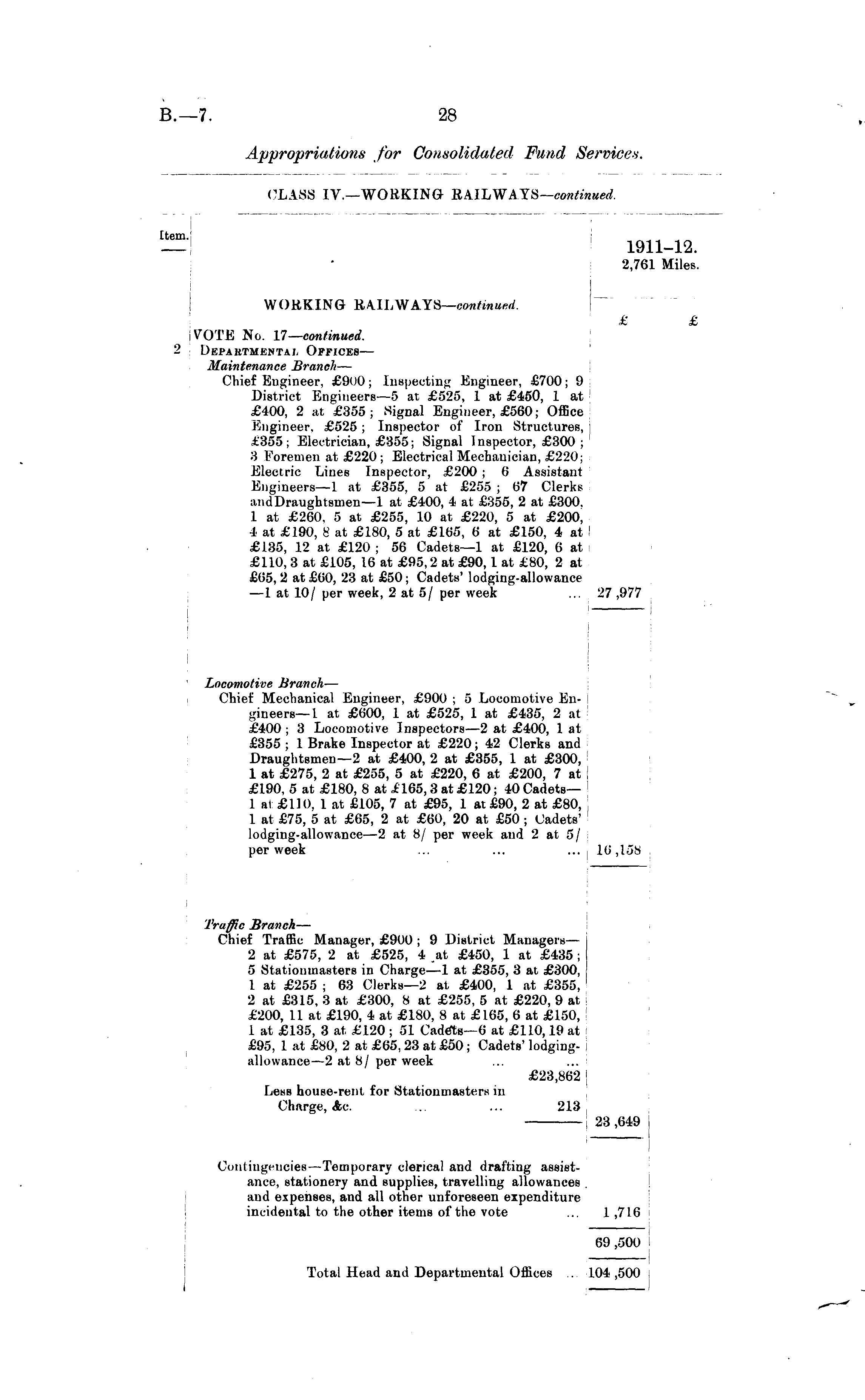 Item. — 1911-12. 2,761 Miles. WORKING RAILWAYS— continued. £ £ VOTE No. 17— continued. 2 Departmental Offices — Maintenance Branch — Chief Engineer, £900; Inspecting Engineer, £700; 9 District Engineers—5 at £525, 1 at £450, 1 at £400, 2 at £355 ; Signal Engineer, £560; Office Engineer. £525 ; Inspector of Iron Structures, £355; Electrician, £355; Signal Inspector, £300 ; 3 Foremen at £220 ; Electrical Mechanician, £220; Electric Lines Inspector, £200 ; 6 Assistant Engineers—1 at £355, 5 at £255 ; 67 Clerks andDraughtsmen—1 at £400, 4 at £355, 2 at £300. 1 at £260, 5 at £255, 10 at £220, 5 at £200, 4 at £190, 8 at £180, 5 at £165, 6 at £150, 4 at £135, 12 at £120 ; 56 Cadets—1 at £120, 6 at £110, 3 at £105, 16 at £95,2 at £90,1 at £80, 2 at £65, 2 at £60, 23 at £50; Cadets' lodging-allowance —1 at 10/ per week, 2 at 5/ per week ... 27 ,977 Locomotive Branch — Chief Mechanical Engineer, £900 ; 5 Locomotive Engineers—! at £600, 1 at £525, 1 at £435, 2 at £400 ; 3 Locomotive Inspectors—2 at £400, 1 at £355 ; 1 Brake Inspector at £220; 42 Clerks and Draughtsmen—2 at £400, 2 at £355, 1 at £300, 1 at £275, 2 at £255, 5 at £220, 6 at £200, 7 at £190, 5 at £180, 8 at £165, 3 at £120 ; 40 Cadets— 1 at £110, 1 at £105, 7 at £95, 1 at £90, 2 at £80, 1 at £75, 5 at £65, 2 at £60, 20 at £50 ; Cadets' lodging-allowance —2 at 8/ per week and 2 at 5/ per week ... ... ... 10,158 Traffic Branch — Chief Traffic Manager, £900 ; 9 District Managers— 2 at £575, 2 at £525, 4 at £450, 1 at £435; 5 Stationmasters in Charge—1 at £355, 3 at £300, 1 at £255 ; 63 Clerks—2 at £400, 1 at £355, 2 at £315, 3 at £300, 8 at £255, 5 at £220, 9 at £200, 11 at £190, 4 at £180, 8 at £165, 6 at £150, 1 at £135, 3 at £120 ; 51 Cadets—6 at £110,19 at £95, 1 at £80, 2 at £65,23 at £50 ; Cadets' lodgingallowance —2 at 8/ per week £23,862 Less house-rent for Stationmasters in Charge, Ac. ... ... 213 23,649 Contingencies —Temporary clerical and drafting assistance, stationery and supplies, travelling allowances and expenses, and all other unforeseen expenditure incidental to the other items of the vote ... 1,716 69 ,500 Total Head and Departmental Offices ... 104,500
