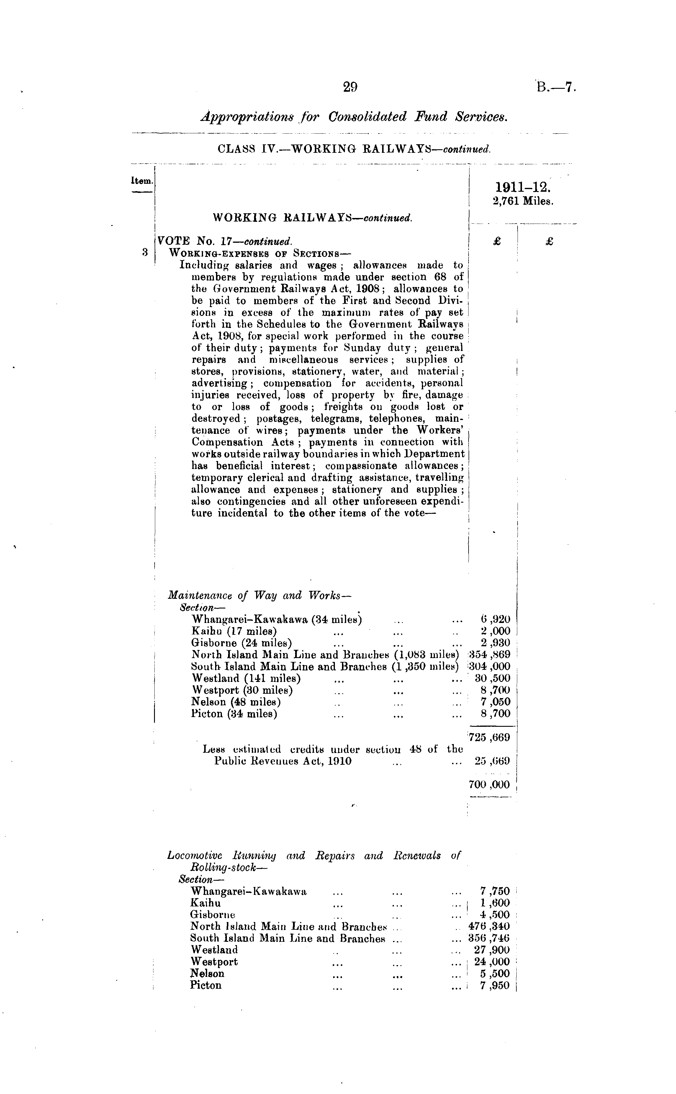 .tern. 1911-12. 2,761 Miles 3 WORKING RAILWAYS— continued. VOTE No. 17— continued, £ £ Working-expenses of Sections— Including salaries and wages ; allowances made to members by regulations made under section 68 of the Government Railways Act, 1908; allowances to be paid to members of the First and Second Divisions iu excess of the maximum rates of pay sel forth in the Schedules to the Government Railways Act, 1908, for special work performed in the course of their duty; payments for Sunday duty; general repairs and miscellaneous services; supplies of st(ires, provisions, stationery, water, and material; advertising; compensation for accidents, personal injuries received, loss of property by fire, damage to or loss of goods ; freights on goods lost or destroyed ; postages, telegrams, telephones, maintenance of wires; payments under the Workers' Compensation Acts ; payments in connection with works outside railway boundaries in which Department has beneficial interest; compassionate allowances ; temporary clerical and drafting assistance, travelling allowance and expenses ; stationery and supplies ; also contingencies and all other unforeseen expenditure incidental to the other items of the vote — Maintenance of Way and Works — Section — Whaugarei-Kawakawa (34 miles) ... ... 0,920 Kaihu (17 miles) ... ... 2,000 Gisborne (24 miles) ... ... ... 2,930 North Island Main Line and Branches (1,083 miles) 354 ,869 South Island Main Line and Branches (1 ,350 miles) 304 ,000 Westland (141 miles) ... ... ... 30,500 Westport (30 miles) ... ... ... 8,700 Nelson (48 miles) ... ... 7,050 Picton (34 miles) ... ... ... 8,700 725 ,669 Less estimated credits under section 48 of the Public Revenues Act, 1910 ... ... 25 ,669 700 ,000 Locomotive Running and Repairs and licneioals of Rolling-stock — Section — Whaugarei-Kawakawa ... ... ... 7,750 Kaihu ... ... ... | 1,600 Gisborne ... ... 4,500 North Island Main Line and Branches .. . 476,340 South Island Main Line and Branches ... ... 356,746 Westland .. ... ... 27,900 Westport ... ... ... 24,000 Nelson ... ... ... 5,500 Picton ... ... ... I 7,950