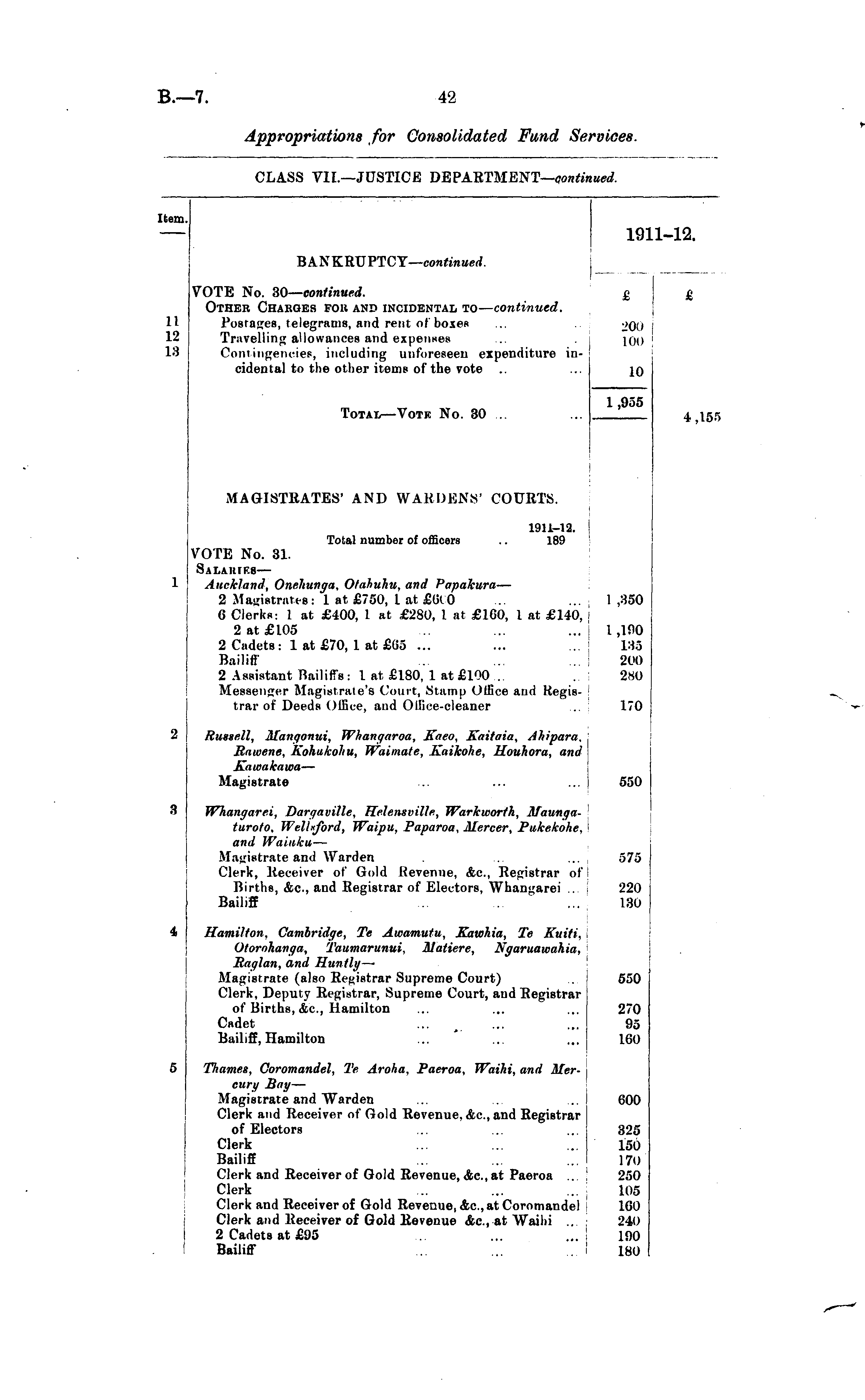 Item. 1911-12. BANKRUPTCY— continued. 11 12 13 VOTE No. 30— continued. £ £ Other Charges for and incidental to — continued. Postages, telegrams, and rent of boxes ... 200 Travelling allowances and expenses ... . I ioo Contingencies, including unforeseen expenditure in- j cidental to the other items of the vote .. ... iq 1,955 Total— Vote No. 30 ... ... 4^1 4,l5. r MAGISTRATES' AND WARDENS' COURTS. 1911-12. Total number of officers .. 189 VOTE No. 31. Salaries— Auckland, Onehunga. Ofahuhu, and Papakura — 2 Magistrates: 1 at £750, 1 at £010 ... ... 1 ,350 6 Clerks: 1 at £400, 1 at £280, 1 at £160, 1 at £140, 2 at £105 ... ... ... 1,190 2 Cadets: 1 at £70, 1 at £65 ... ... ... 135 Bailiff ... ... 200 2 Assistant Bailiffs : 1 at £180, 1 at £100 ... 280 Messenger Magistrate's Court, Stamp Office and Registrar of Deeds Office, and OUice-cleaner ... 170 Russell, Manqonui, Whanqaroa, Kaeo, Kaitaia, Ahipara. Rawene, Kohukohu, Waimate, Kaikohe, Houhora, and Kawakawa — Magistrate ... ... ,., 550 550 3 Whangarei, Dargaville, Helensville, Warkworth, Maunqaturofo. Welhford, Waipu, Paparoa, Mercer, Pukekohe, and Waiiiku — Magistrate and Warden ... ... 575 Clerk, Receiver of Gold Revenue, Ac, Registrar of I Births, &c, and Registrar of Electors, Whangarei ... 220 Bailiff ... ... ... 130 575 220 130 Hamilton. Cambridge, Te Awamutu, Kawhia, Te Kuiti, Otorohanga, Taumarunui, Alatiere, Ngaruawahia, Raglan, and Huntly —■ Magistrate (also Registrar Supreme Court) 550 Clerk, Deputy Registrar, Supreme Court, and Registrar of Births, &c, Hamilton ... ... ... 270 Cadet ... ... ... 95 Bailiff, Hamilton ... ... ... 100 550 270 95 160 Thames, Coromandel, Te Aroha, Paeroa, Waihi, and Mercury Bay — Magistrate and Warden ... ... 600 Clerk and Receiver of Gold Revenue. &c, and Registrar of Electors ... ... ... 325 Clerk ... ... ... 150 Bailiff ... ... ... 170 Clerk and Receiver of Gold Revenue, &c, at Paeroa ... ! 250 Clerk ... ... ... 105 Clerk and Receiver of Gold Revenue, Ac, at Coromandel ! 160 Clerk and Receiver of Gold Revenue &c, at Waihi .. 240 2 Cadets at £95 ... ... ... 190 Bailiff ... ... ... I 180 600 325 150 170 250 105 160 240 190