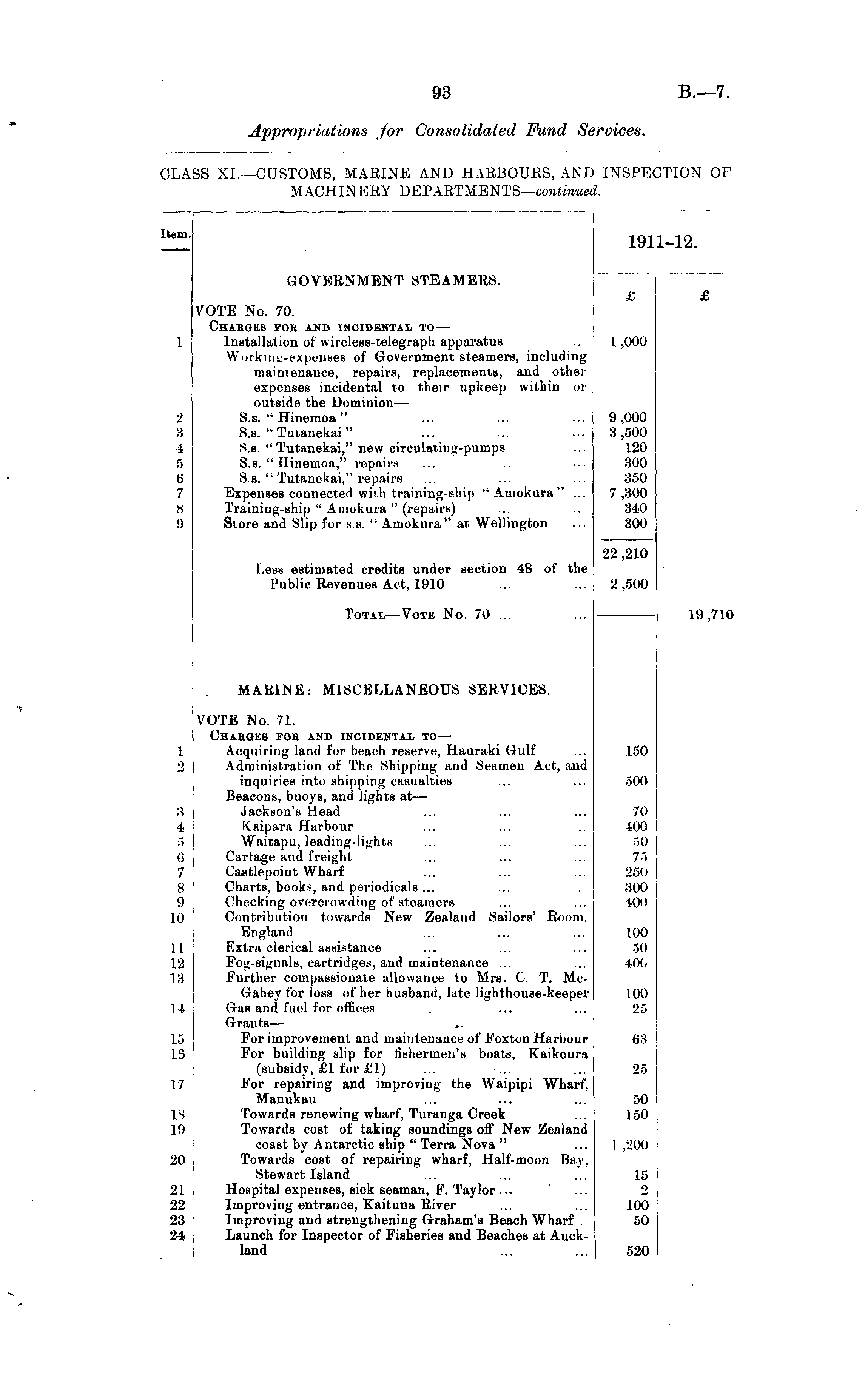 item. 1911-12. GOVERNMENT STEAMERS. £ £ 2 3 t 5 (i 7 s !> VOTE No. 70. Charges for and incidental to — Installation of wireless-telegraph apparatus . I ,000 Working-expenses of Government steamers, including maintenance, repairs, replacements, and other expenses incidental to their upkeep within or outside the Dominion — S.s. " Hinemoa" ... ... ... 9,000 S.s. -'Tutanekai" ... ... ... j 3,500 S.s. "Tutanekai," new circulating-pumps ... 120 S.s. " Hinemoa," repairs ... ... 300 S.s."Tutanekai," repairs ... ... ... 350 Expenses connected with training-ship "Amokura" ... 7,300 Training-ship" Amokura" (repairs) ... 340 Store and Slip for s.s. " Amokura" at Wellington ... 300 22 ,210 Less estimated credits under section 48 of the Public Revenues Act, 1910 ... ... 2,500 Total—Vote No. 70 ... ... 11 19,71 9, MARINE: MISCELLANEOUS SERVICES. 3 4 5 6 7 8 9 lo 1 1 12 18 1 2 VOTE No. 71. Charges for and incidental to — Acquiring land for beach reserve, Hauraki Gulf ... 150 Administration of The Shipping and Seamen Act, and inquiries into shipping casualties ... ... 500 Beacons, buoys, and lights at — Jackson's Head ... ... ... 70 Kaipara Harbour ... ... ... 400 Waitapu, leading-lights ... ... ... 50 Cartage and freight ... ... ... 75 Castlepoint Wharf ... ... ... 250 Charts, books, and periodicals ... ... . 300 Checking overcrowding of steamers ... ... 400 Contribution towards New Zealand Sailors' Room. England ... ... ... 100 Extra clerical assistance ... ... ... 50 Fog-signals, cartridges, and maintenance ... ... 400 Further compassionate allowance to Mrs. 0. T. McGahey for loss of her husband, late lighthouse-keeper 100 Gas and fuel for offices ... ... ... 25 Grants — For improvement and maintenance of Foxton Harbour 68 For building slip for fishermen's boats, Kaikoura (subsidy, £1 for £1) ... ... ... 25 For repairing and improving the Waipipi Wharf, Manukau ... ... ... 50 Towards renewing wharf, Turanga Creek ... 150 Towards cost of taking soundings off New Zealand coast by Antarctic ship " Terra Nova " ... 1 ,200 Towards cost of repairing wharf, Half-moon Bay, Stewart Island ... ... ... 15 Hospital expenses, sick seaman, F. Taylor... ... 2 Improving entrance, Kaituna River ... ... 100 Improving and strengthening Graham's Beach Wharf 50 Launch for Inspector of Fisheries and Beaches at Auckland ... ... 520 150 500 70 400 50 7.") 250 300 400 100 50 400 100 25 14 L5 18 68 25 17 Is 19 50 150 20 1 ,200 21 22 23 24 15 • > 100 50